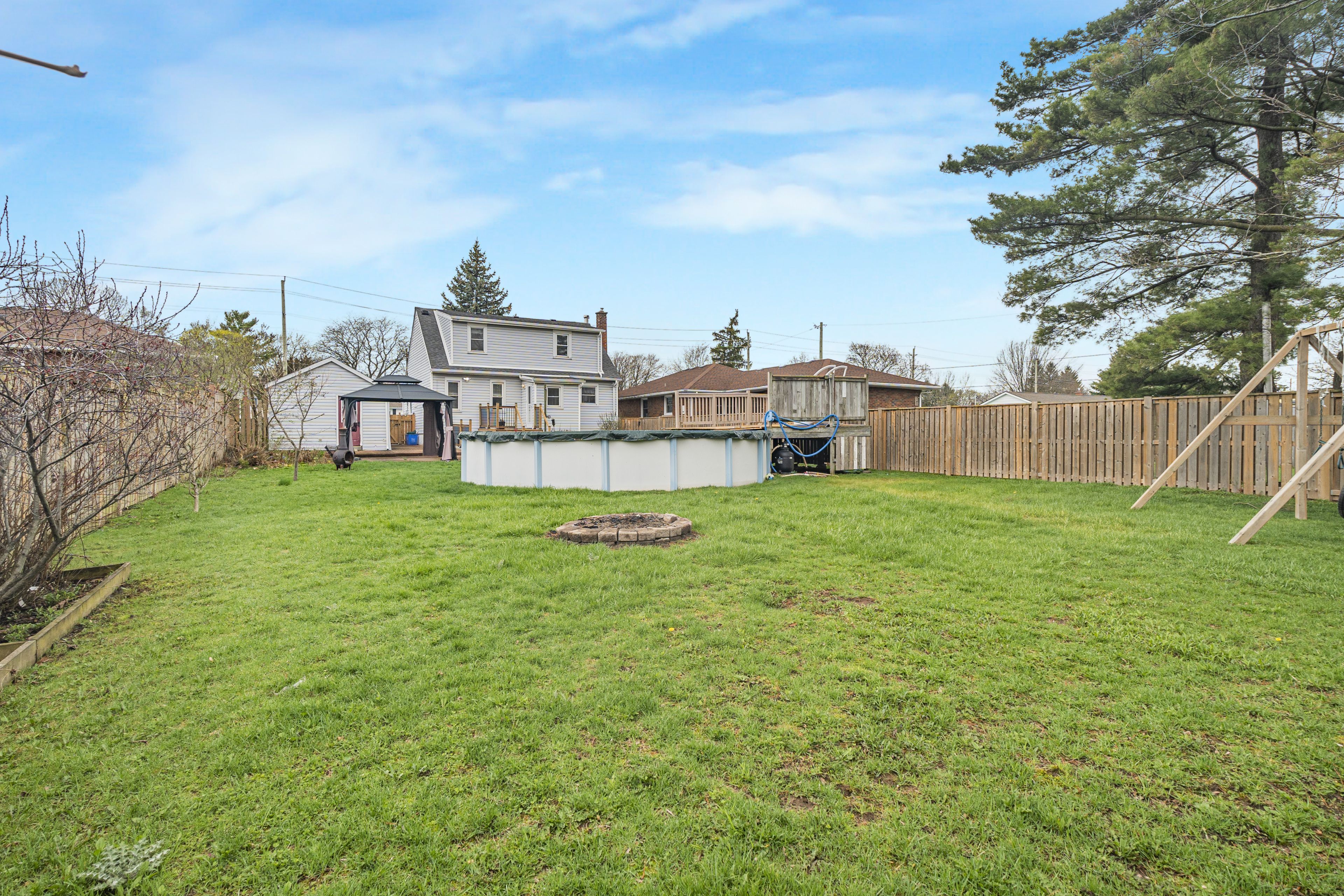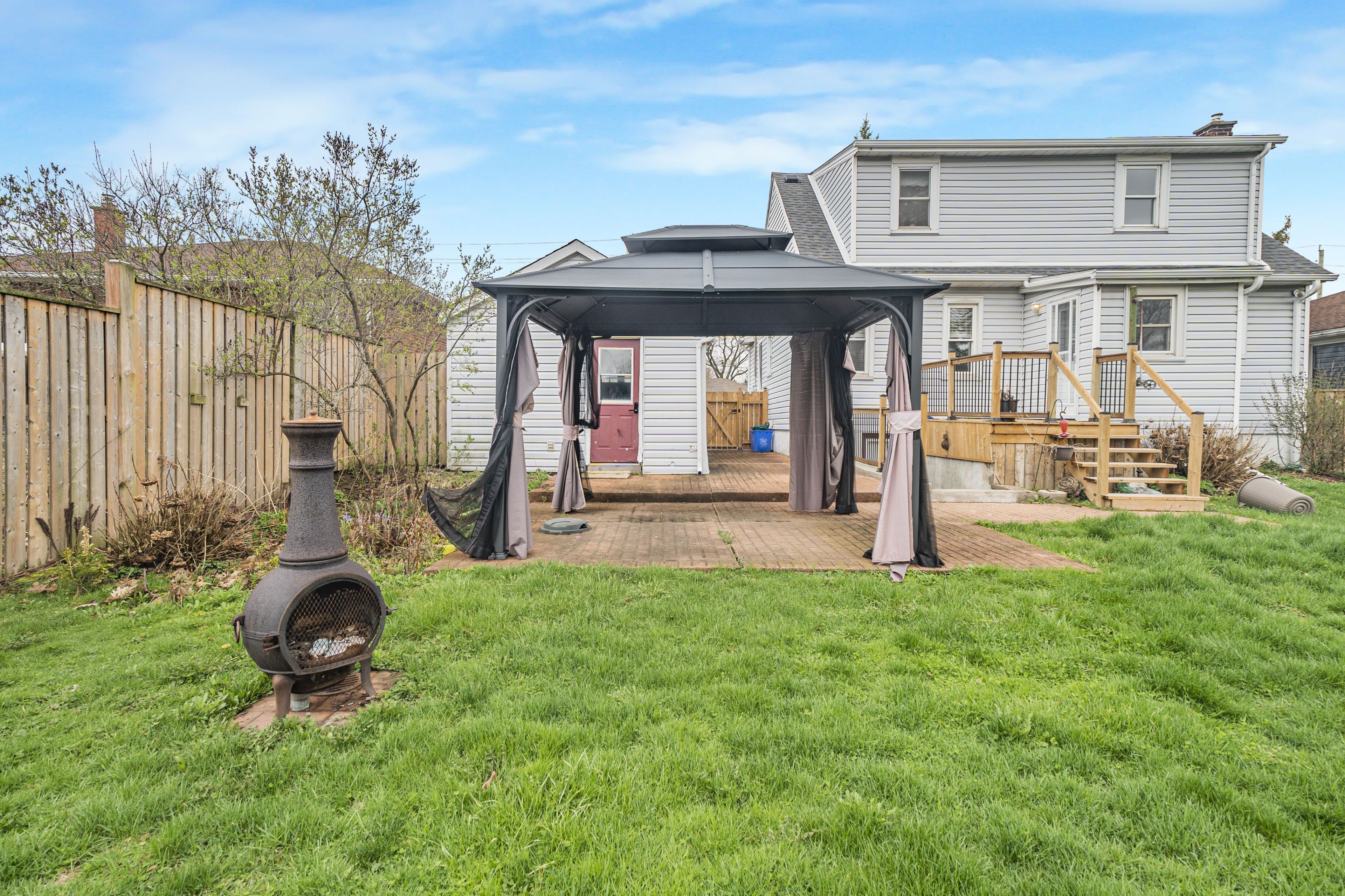 • Fully fenced backyard features above-ground pool, deck, and gazebo.