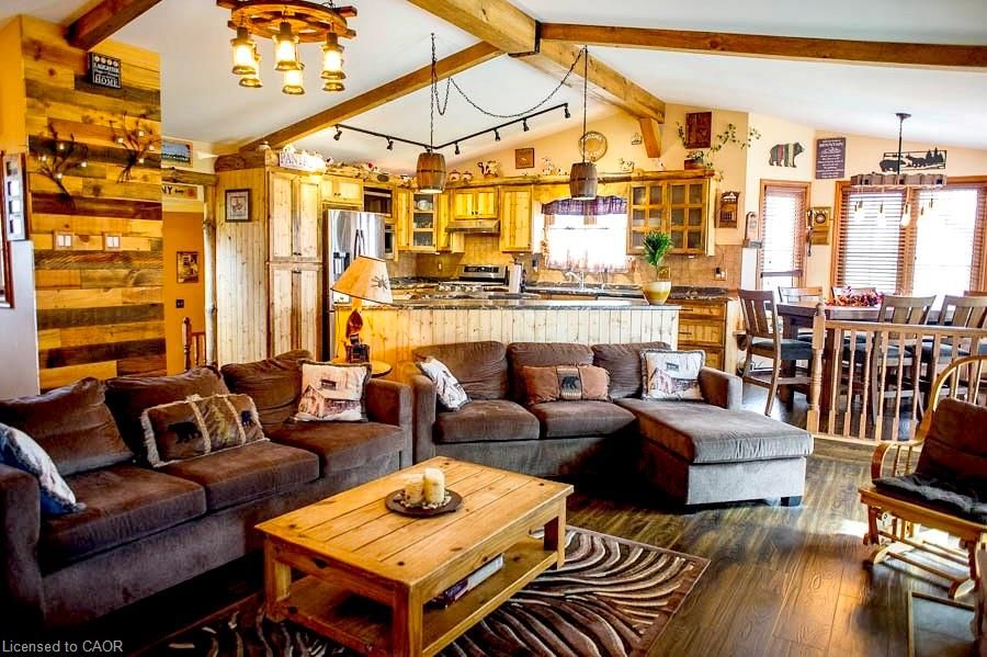 Incredible opportunity for flexible living on a scenic country lot, minutes from town. This custom build bungaloft is designed for family, extended family, guests, or home-based lifestyles. This residence offers multiple private living spaces within one exceptional property. The main dwelling features a bright, open layout with natural wood detailing, generous living areas, and a statement fireplace. The kitchen is designed for gathering, offering custom storage, a large island, and seamless flow to the dining and great room. Six bedrooms and four bathrooms provide ample space, including a private primary retreat with ensuite. The lower level is finished with recreation space, laundry, and storage. The self-contained in-law suite includes its own entrance, deck overlooking open fields, kitchen, living space with fireplace, bedroom, office, full bath, and separate utilities. The loft, a third suite offering a bedroom with fireplace and full bath ... Ideal for longer-term guests. Set on a large, fully fenced lot backing onto farmland, the property includes parking for six, multiple storage sheds, a basketball court and a solar-heated above-ground pool. A truly unique property offering privacy, flexibility, and functionality. Additional notes: only about 10 minutes to hwy 403 and about another 15 minutes from there to the 401. Reverse osmosis drinking system in main home and in-law suite. Ac|furnace 2025. Hwh 2024 *pictures from previous listing have been used with permission and virtual edits made.