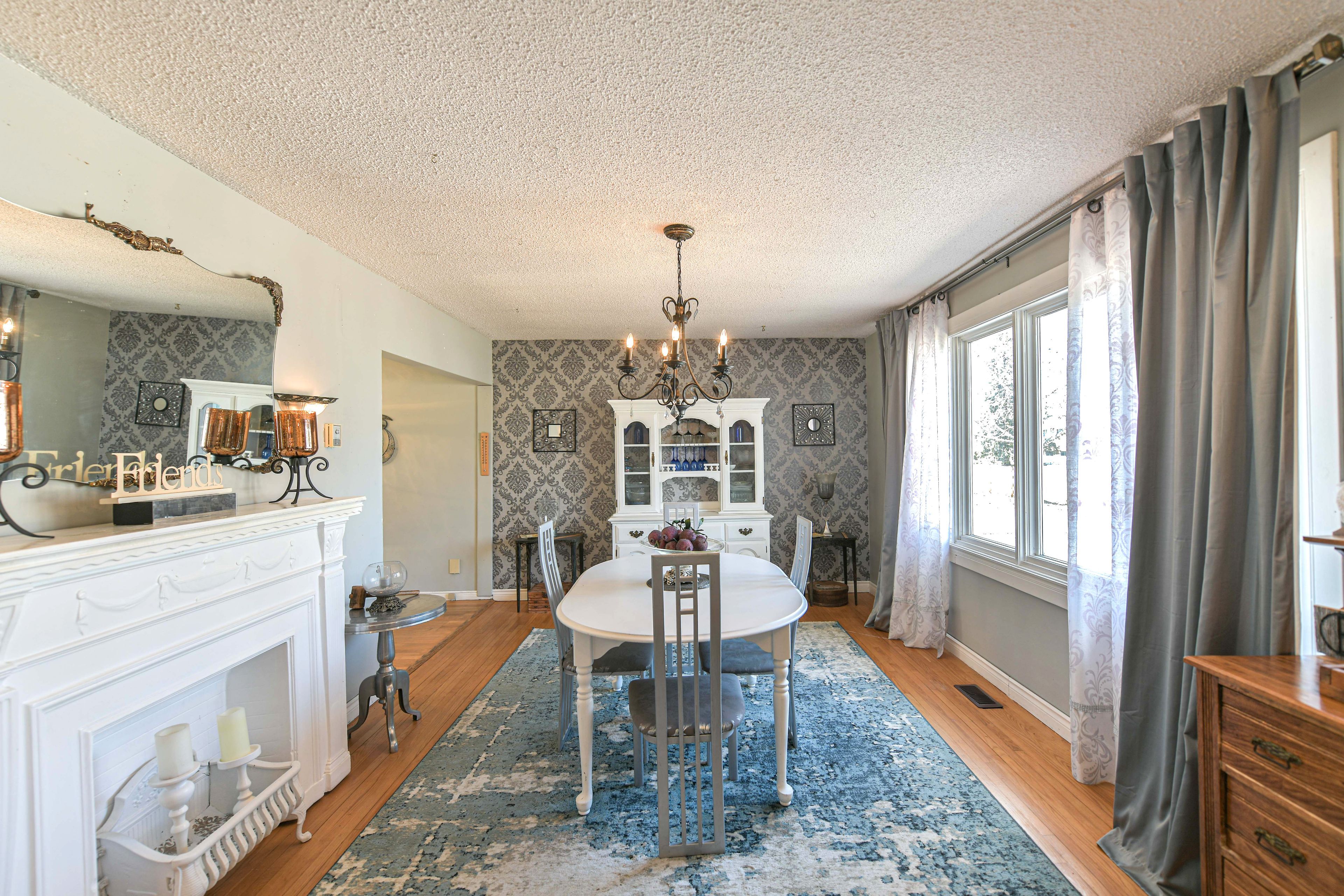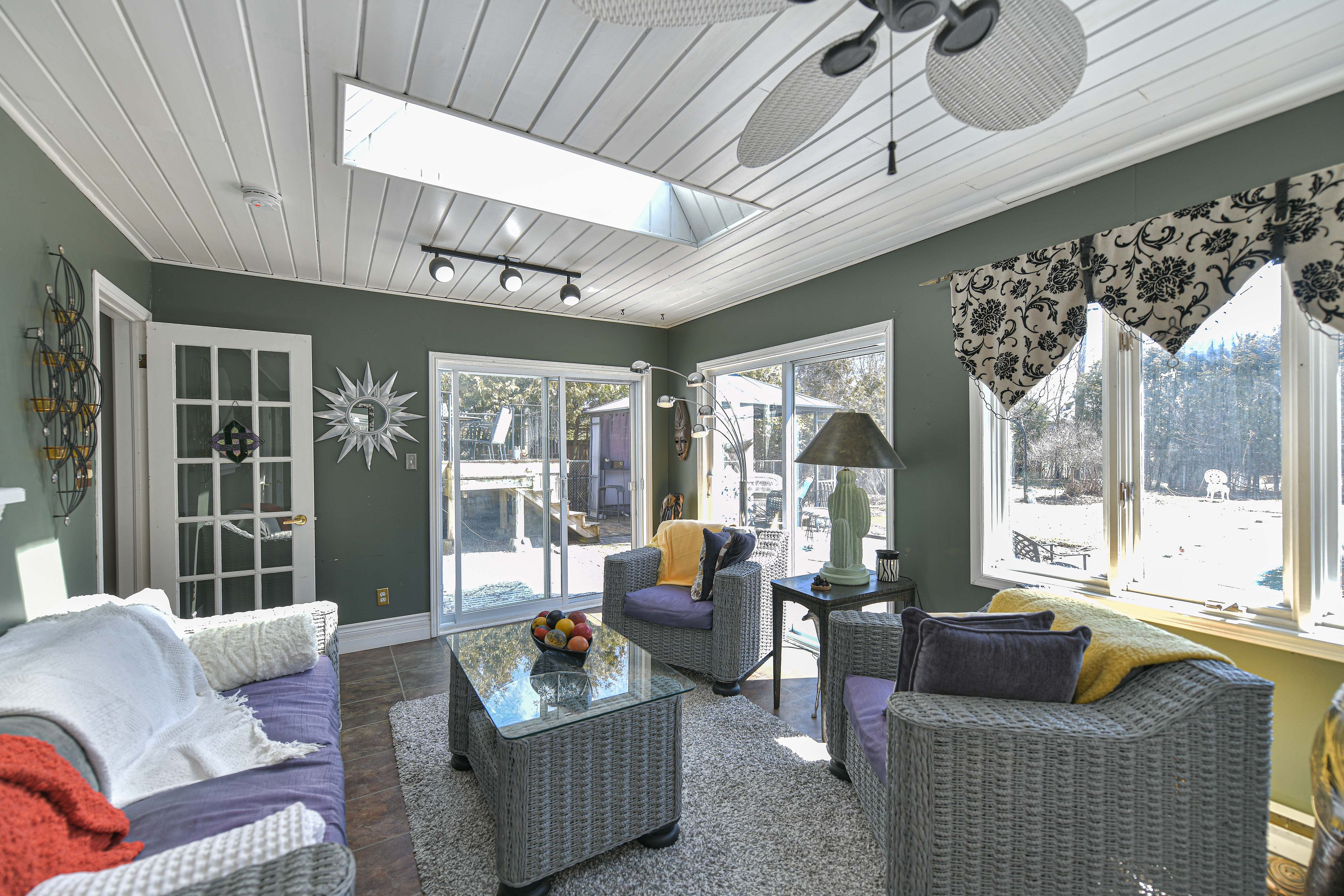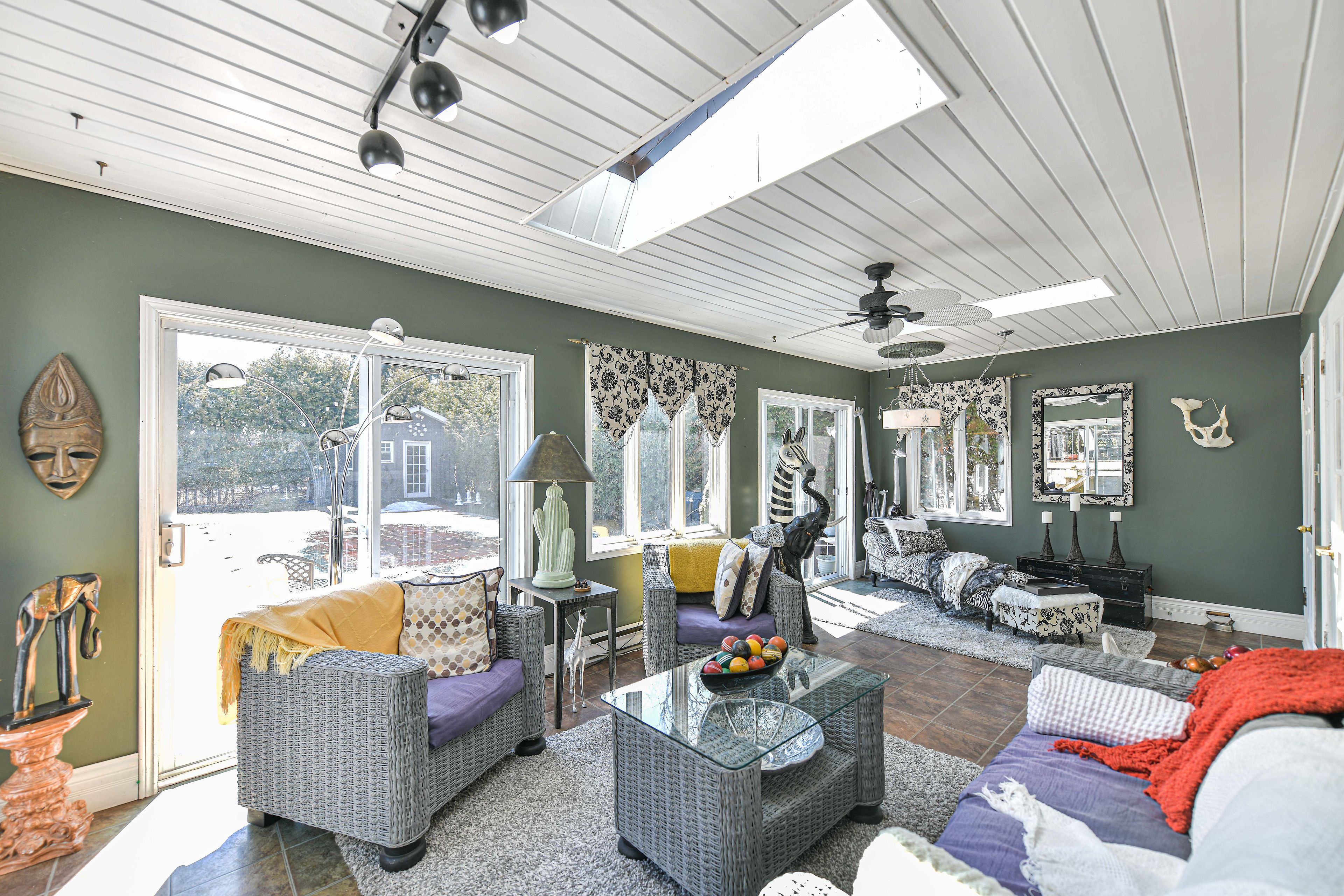 • Spacious four-season sunroom with large windows and backyard views.