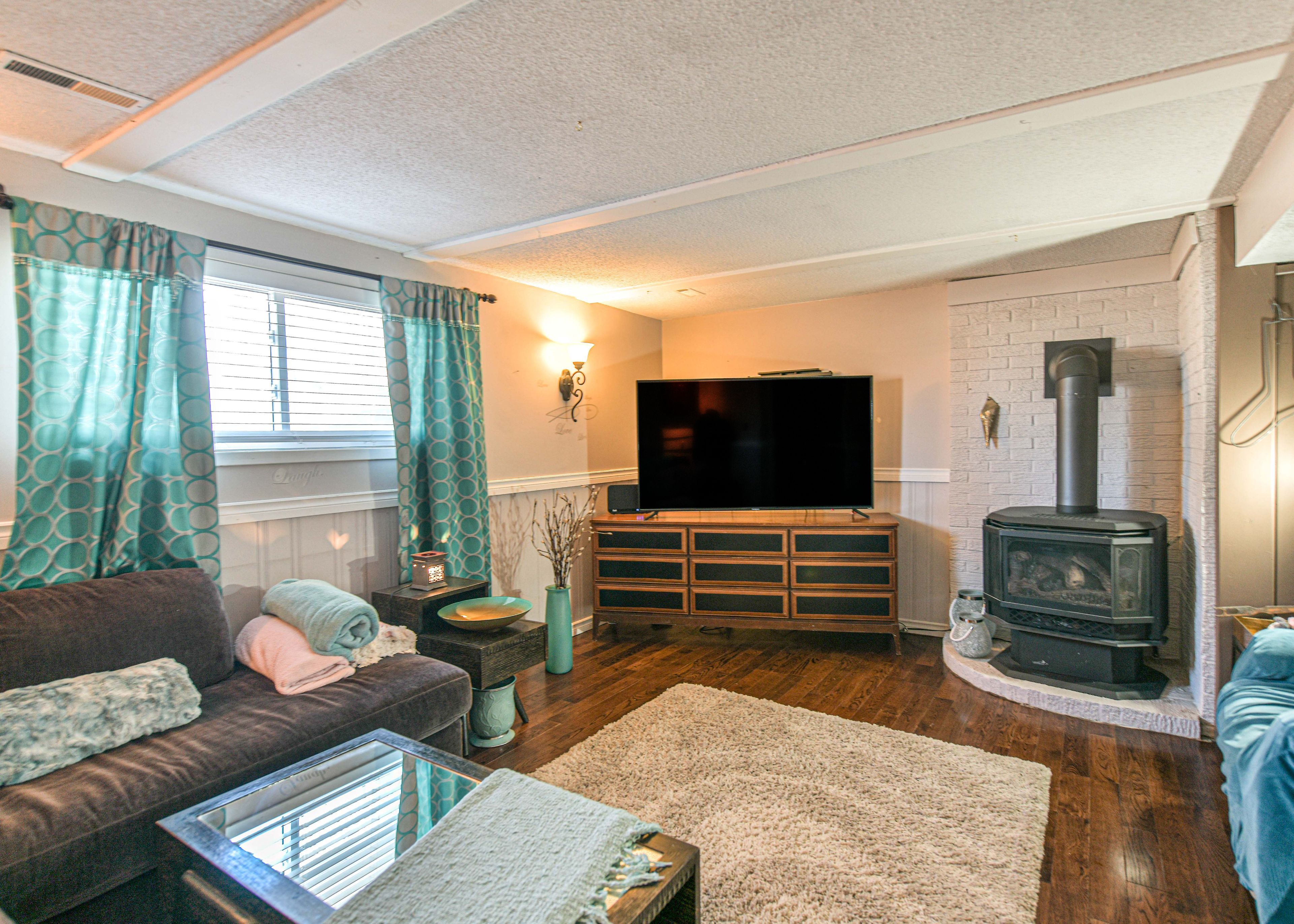• Finished lower-level rec room with cozy gas fireplace for relaxation.