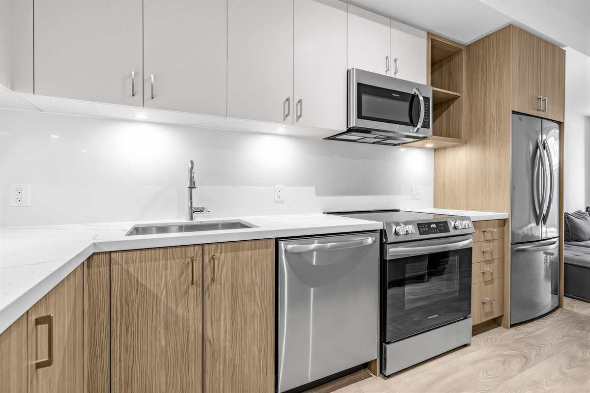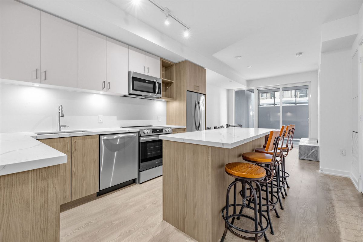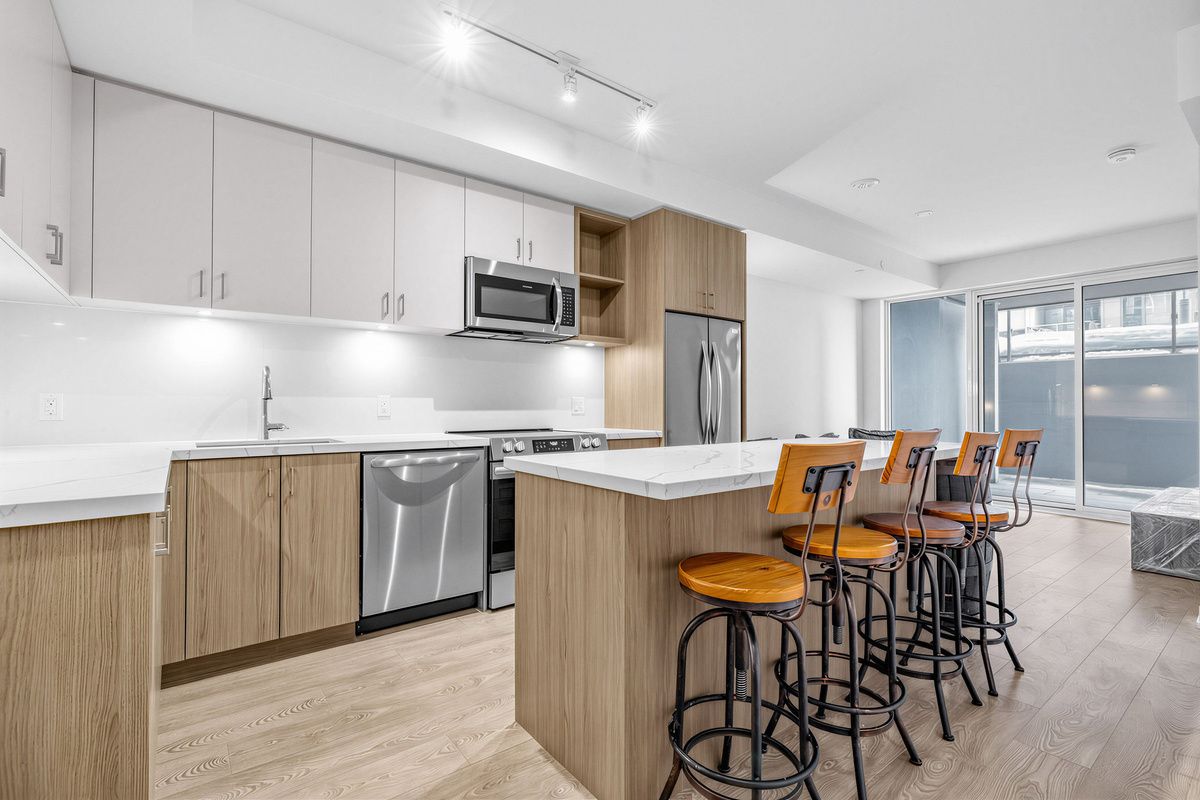 • Modern kitchen includes stainless steel appliances and convenient barstool seating.