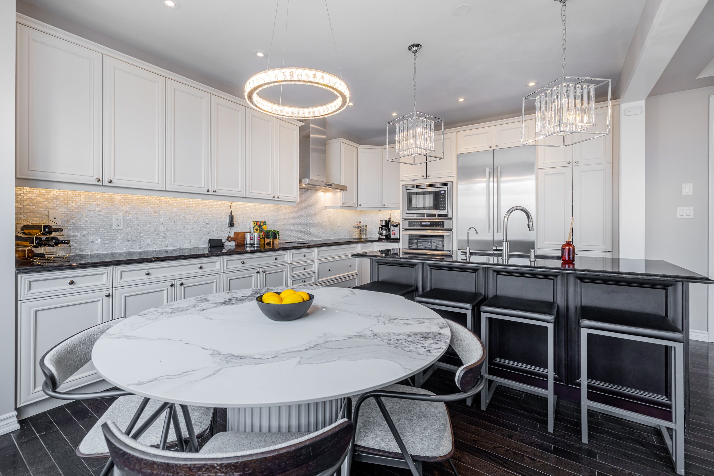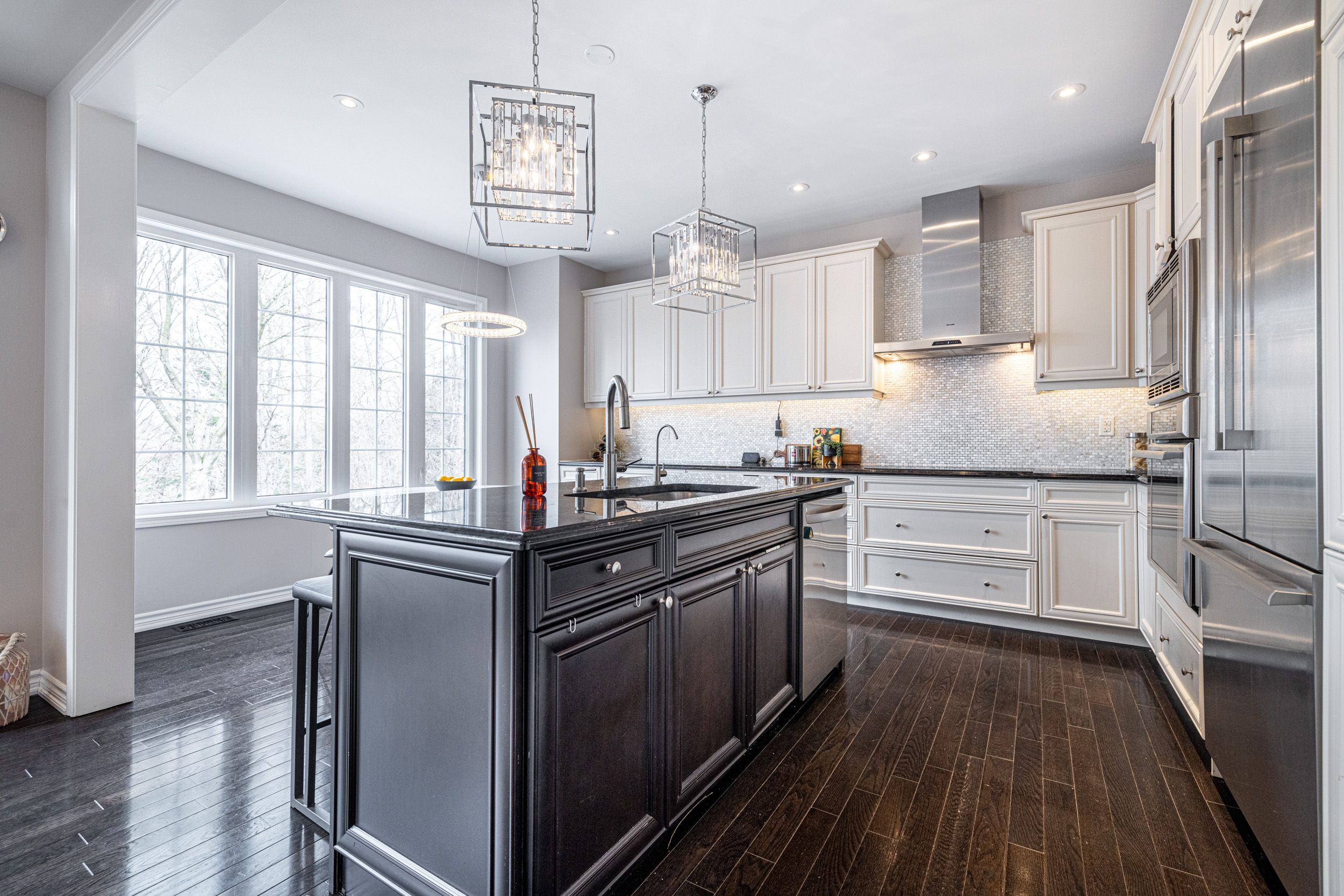 • Gourmet kitchen with custom cabinetry, granite countertops, and large island.