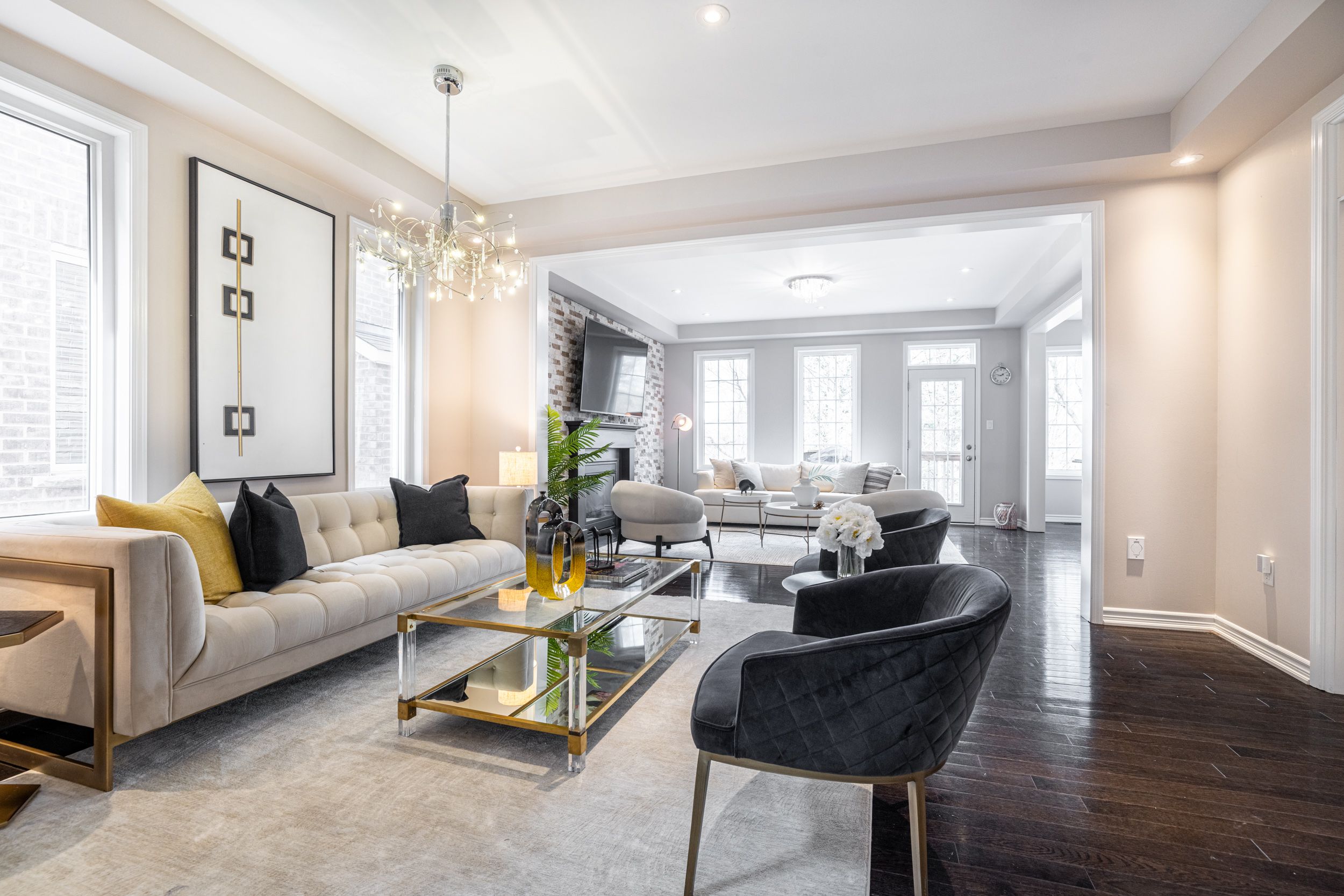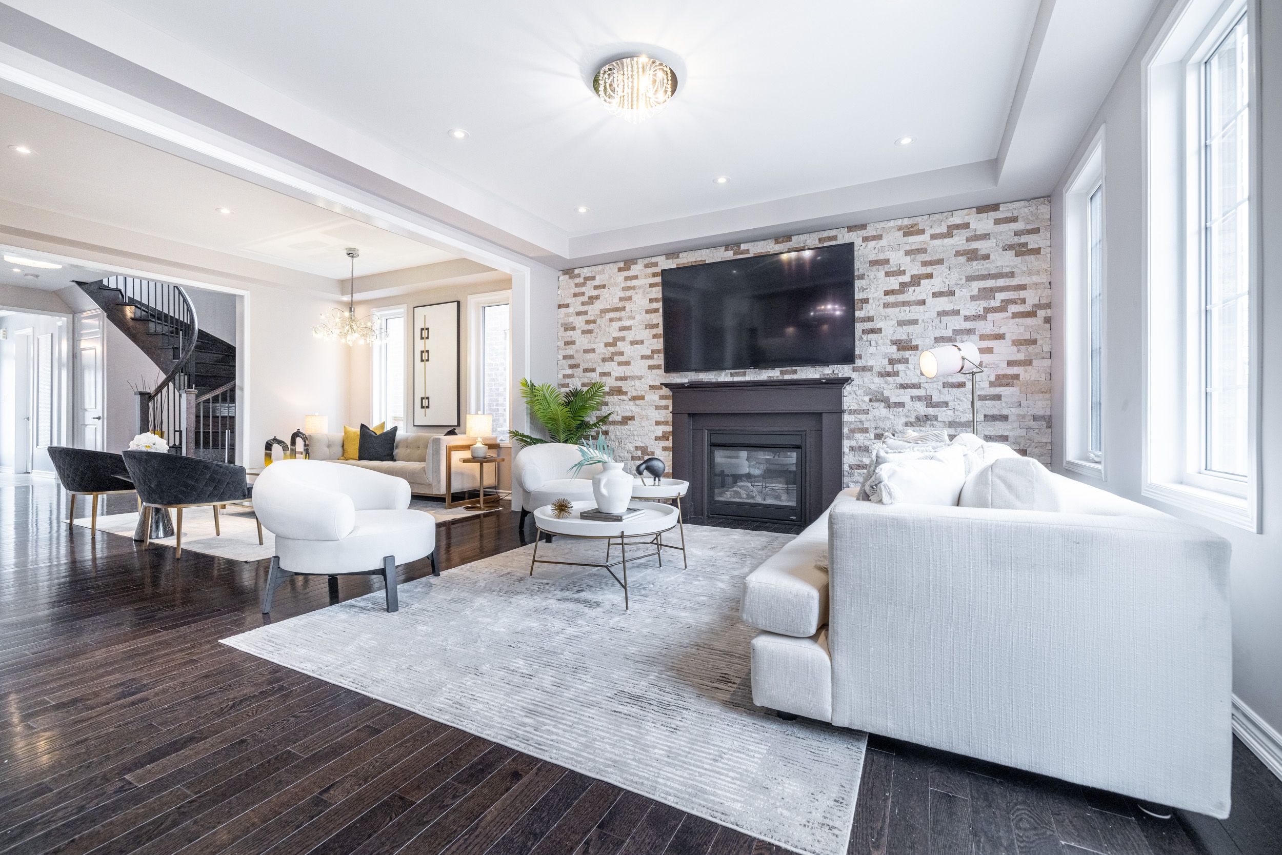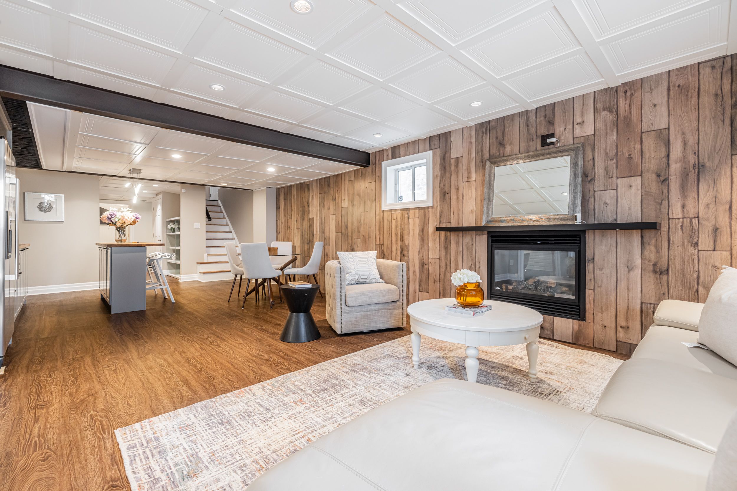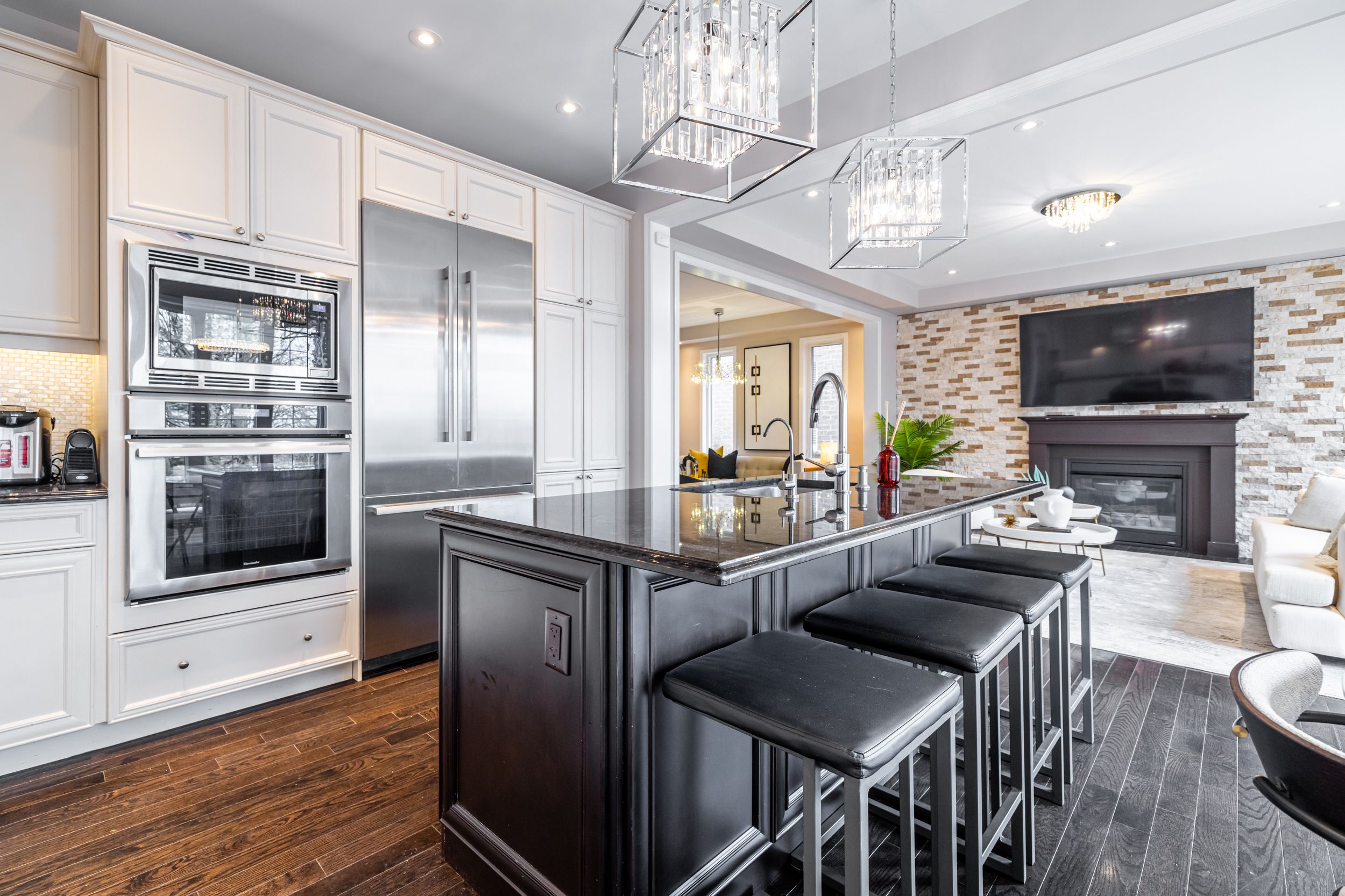 • Open-concept layout with family room, living room, and gas fireplace.