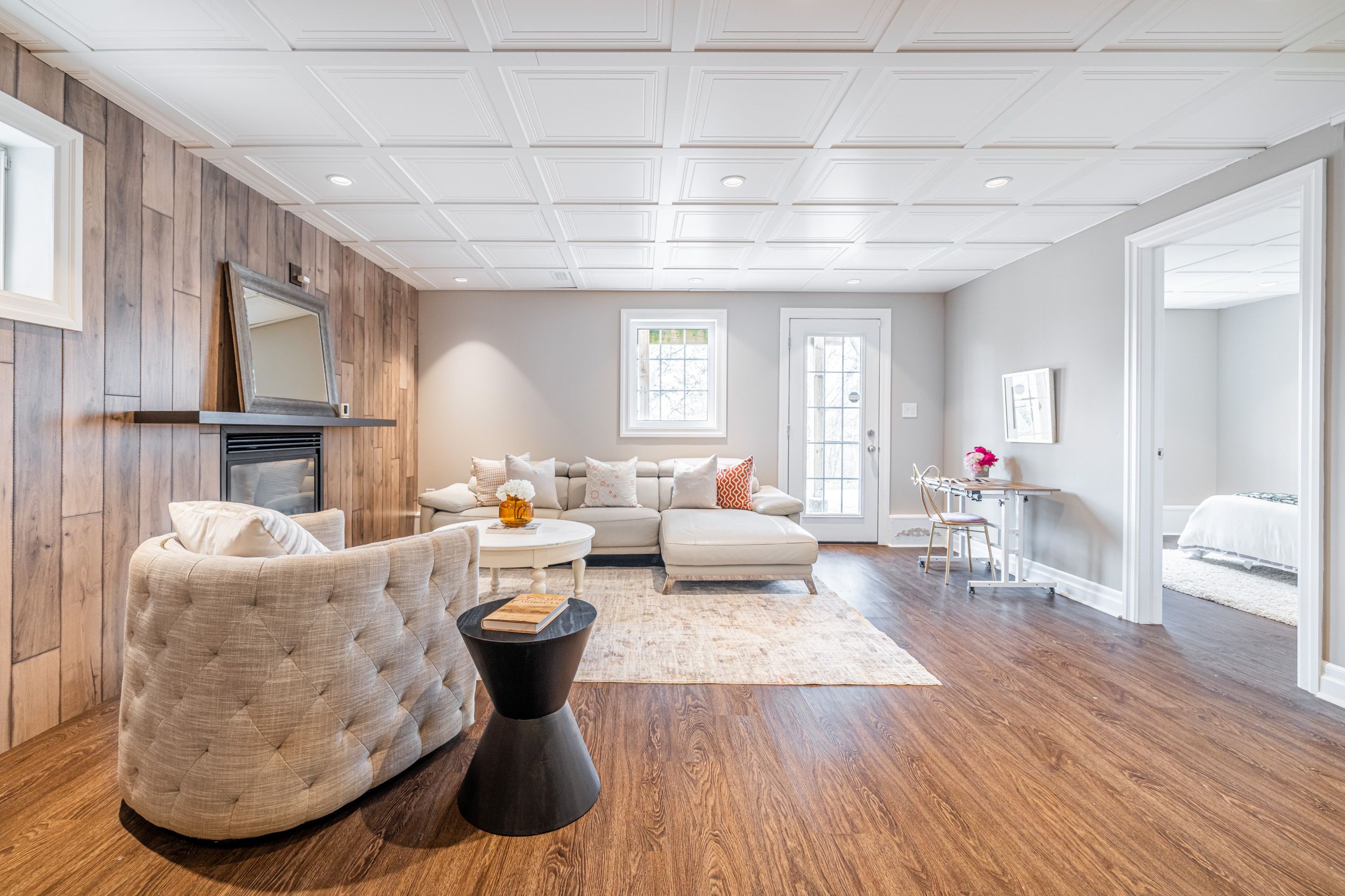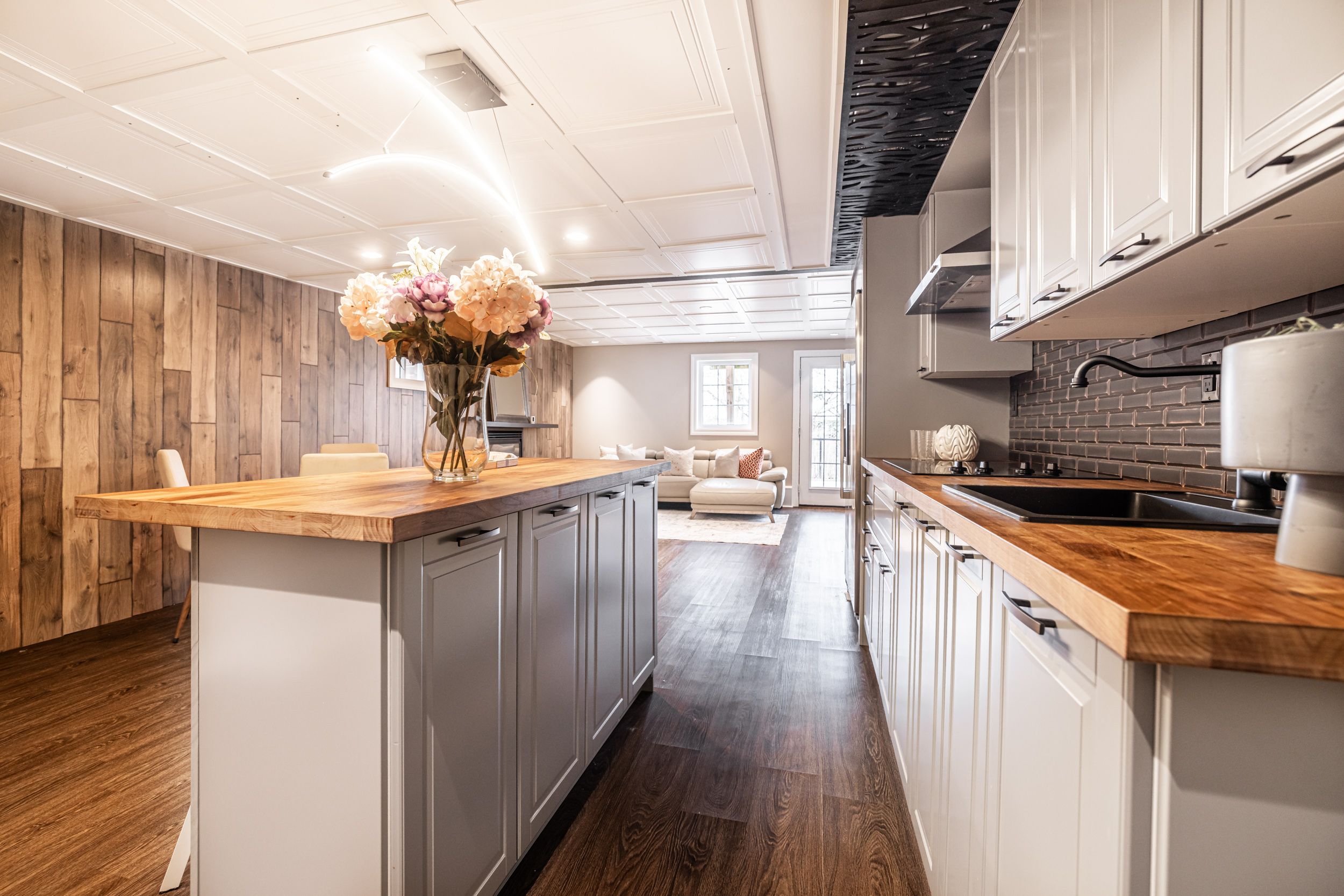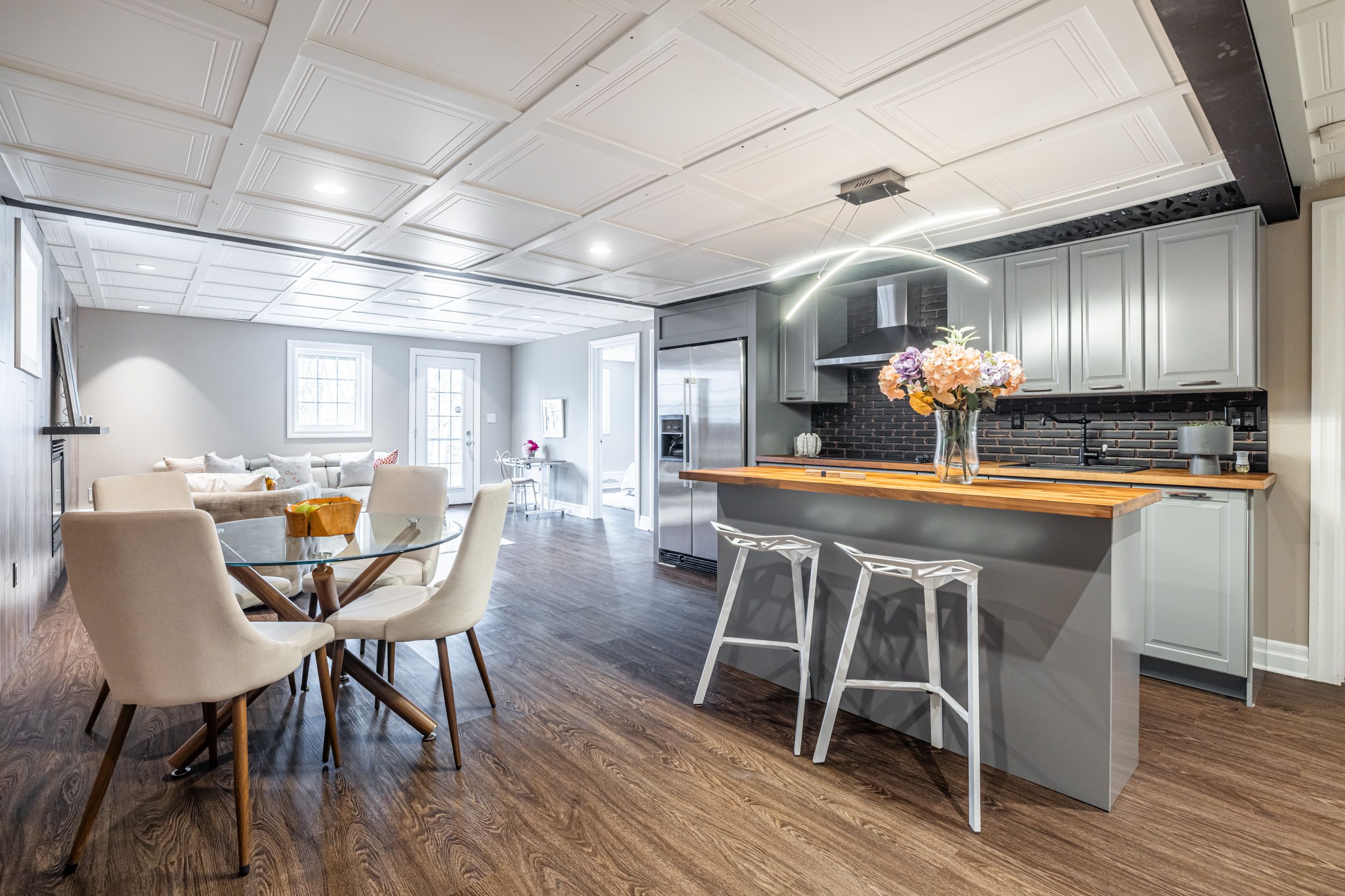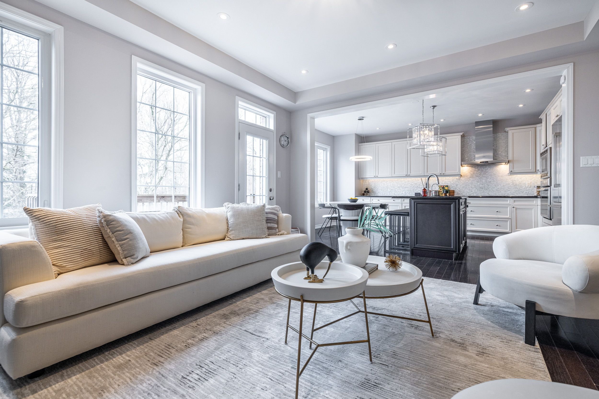 • Open-concept layout with family room, living room, and gas fireplace.