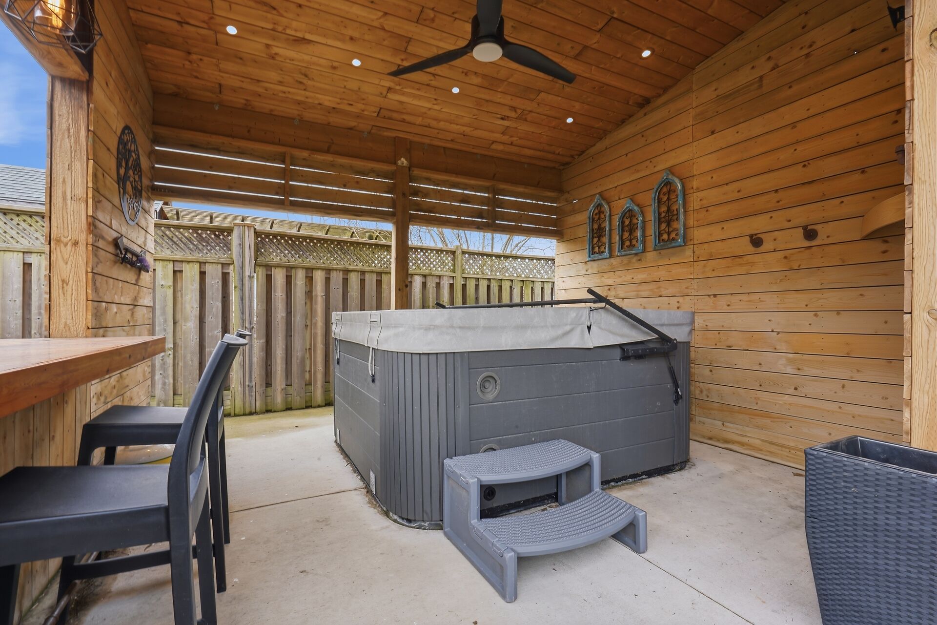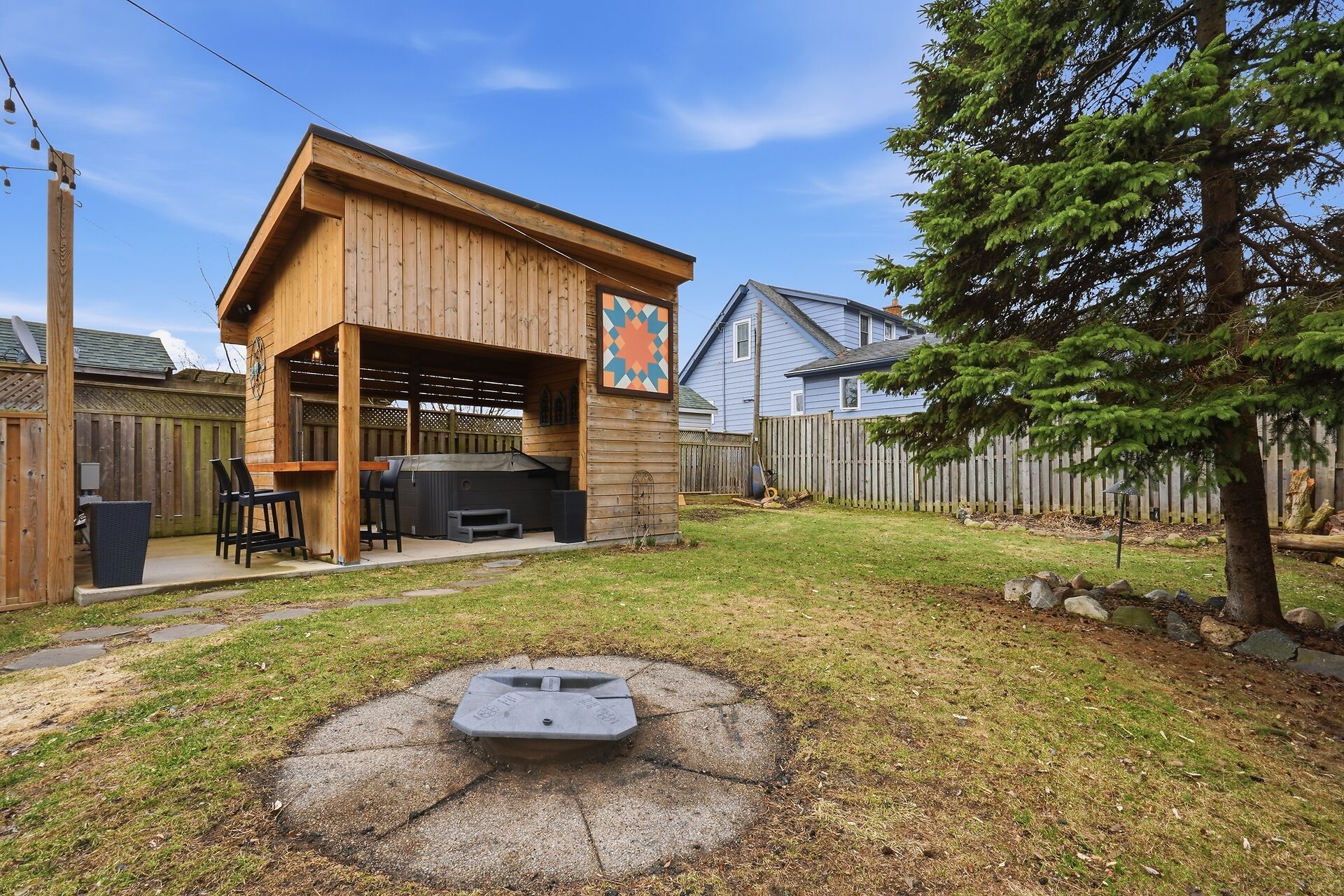 • Outdoor 'Party Yard' with hot tub, bar, and fire pit for entertainment.