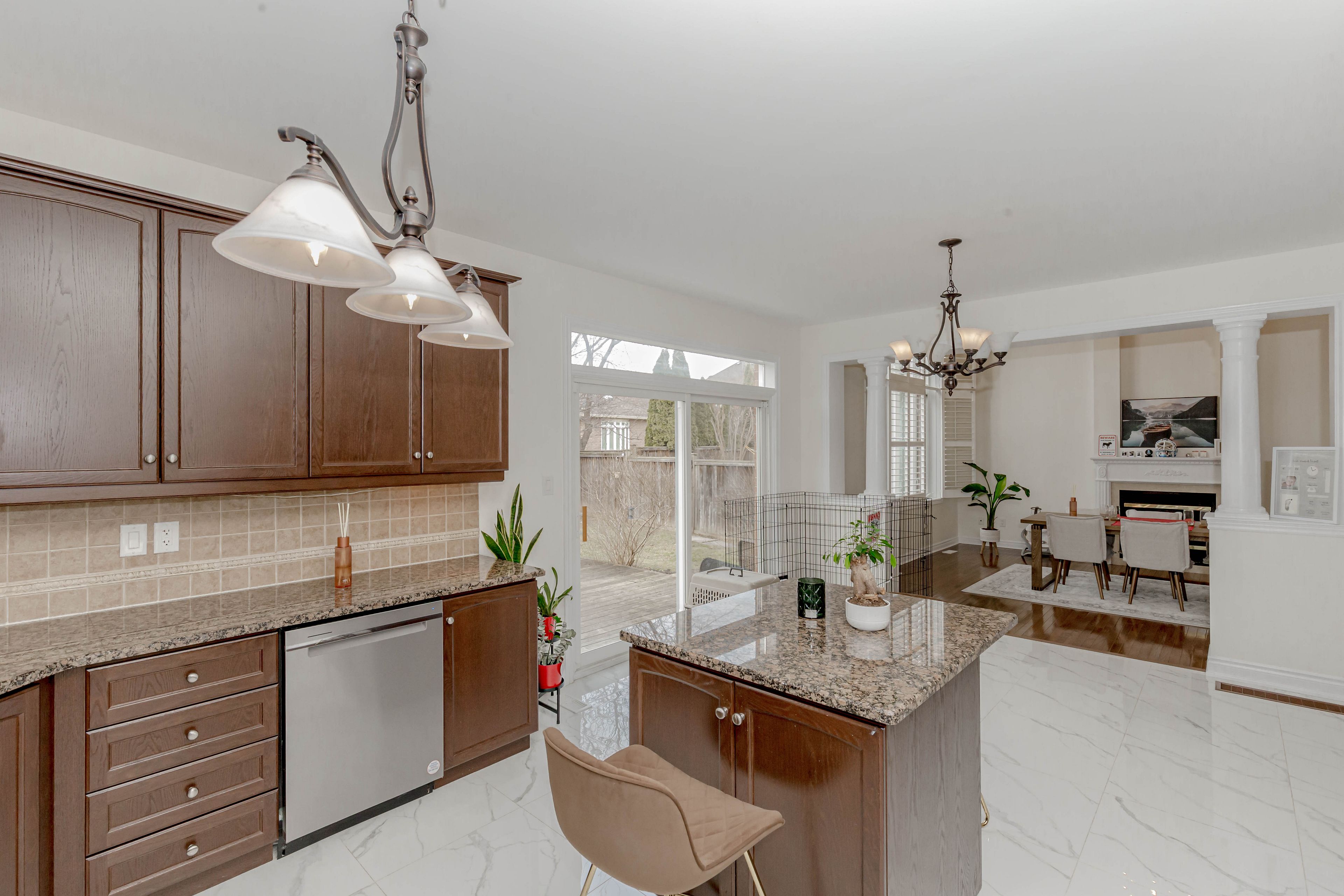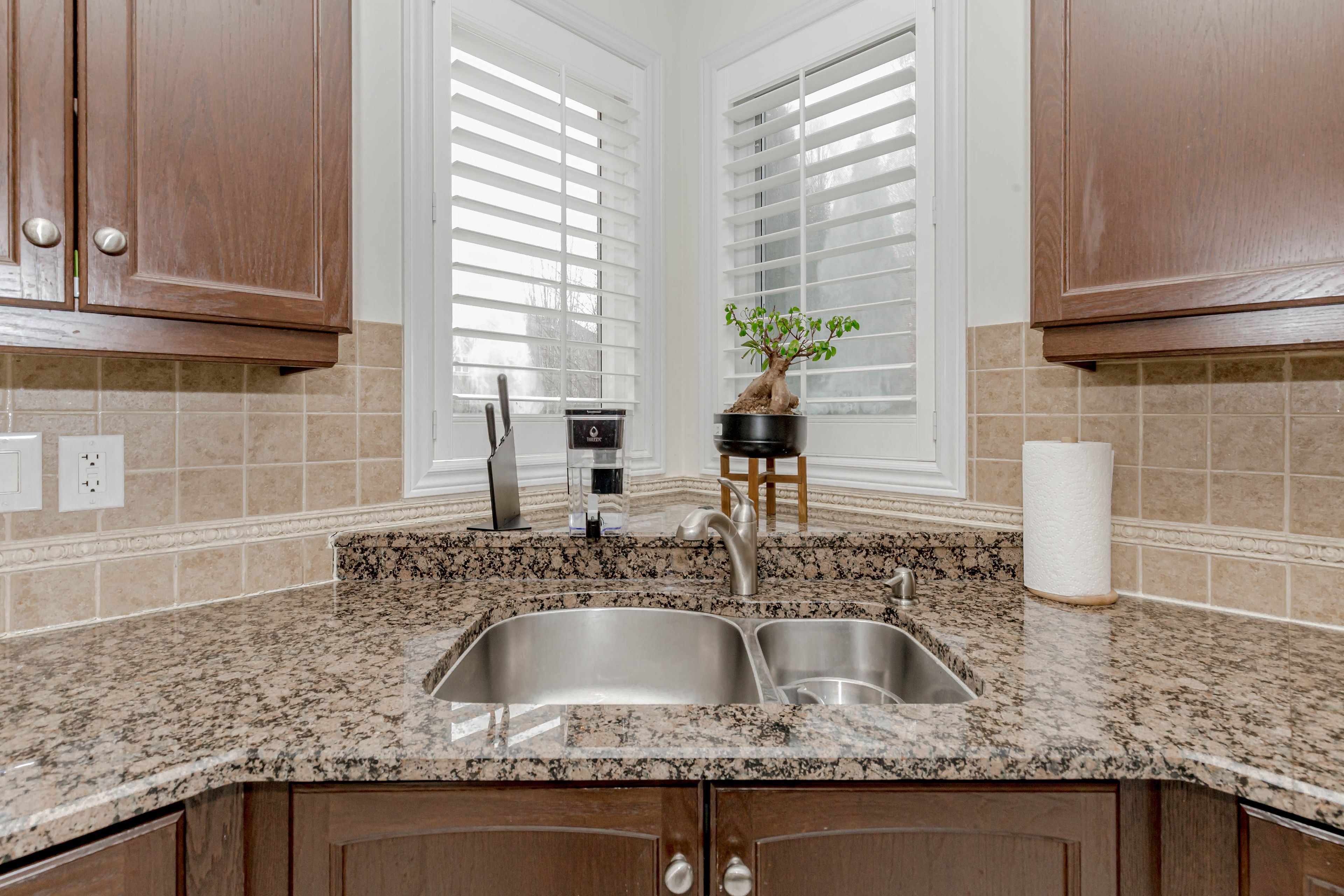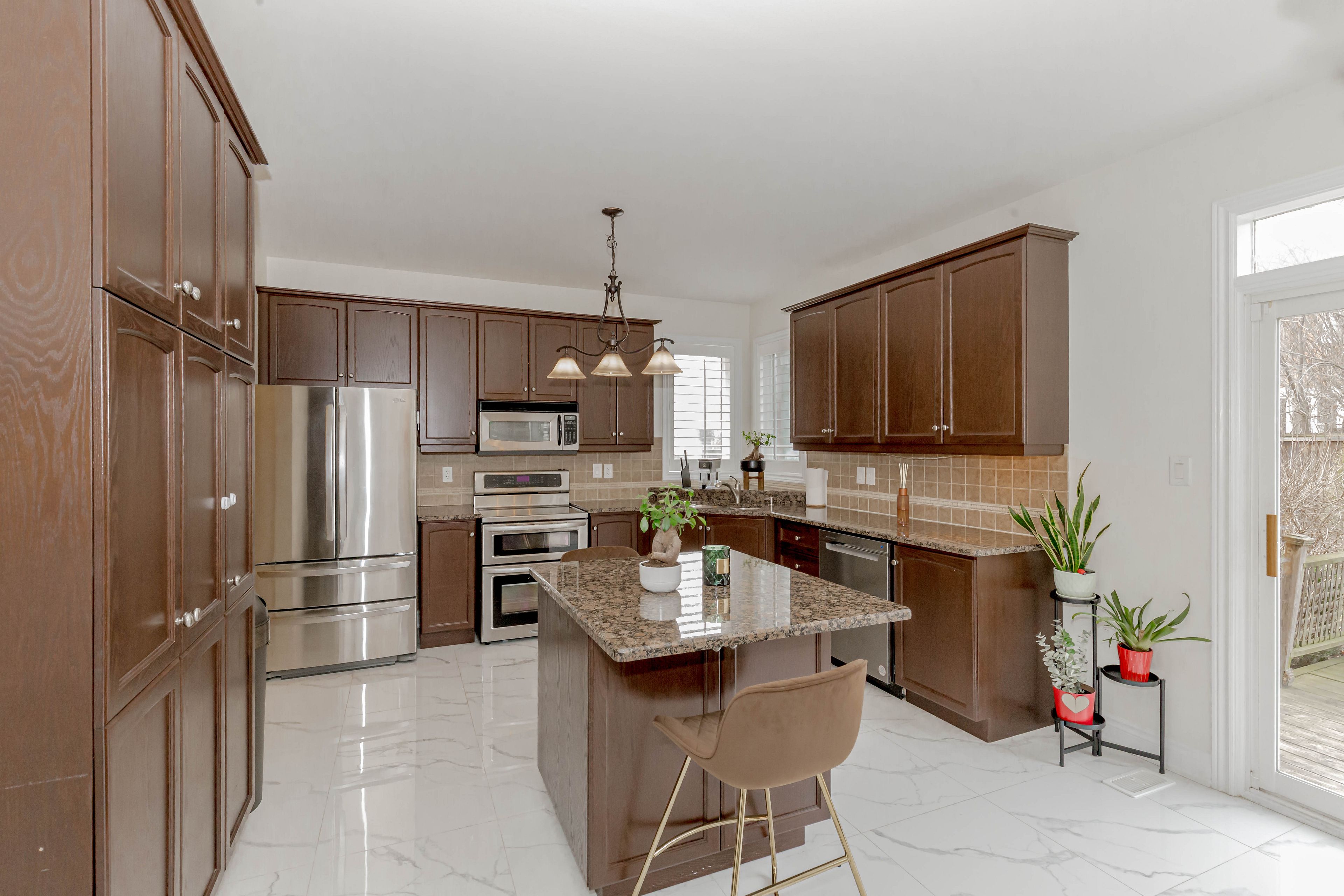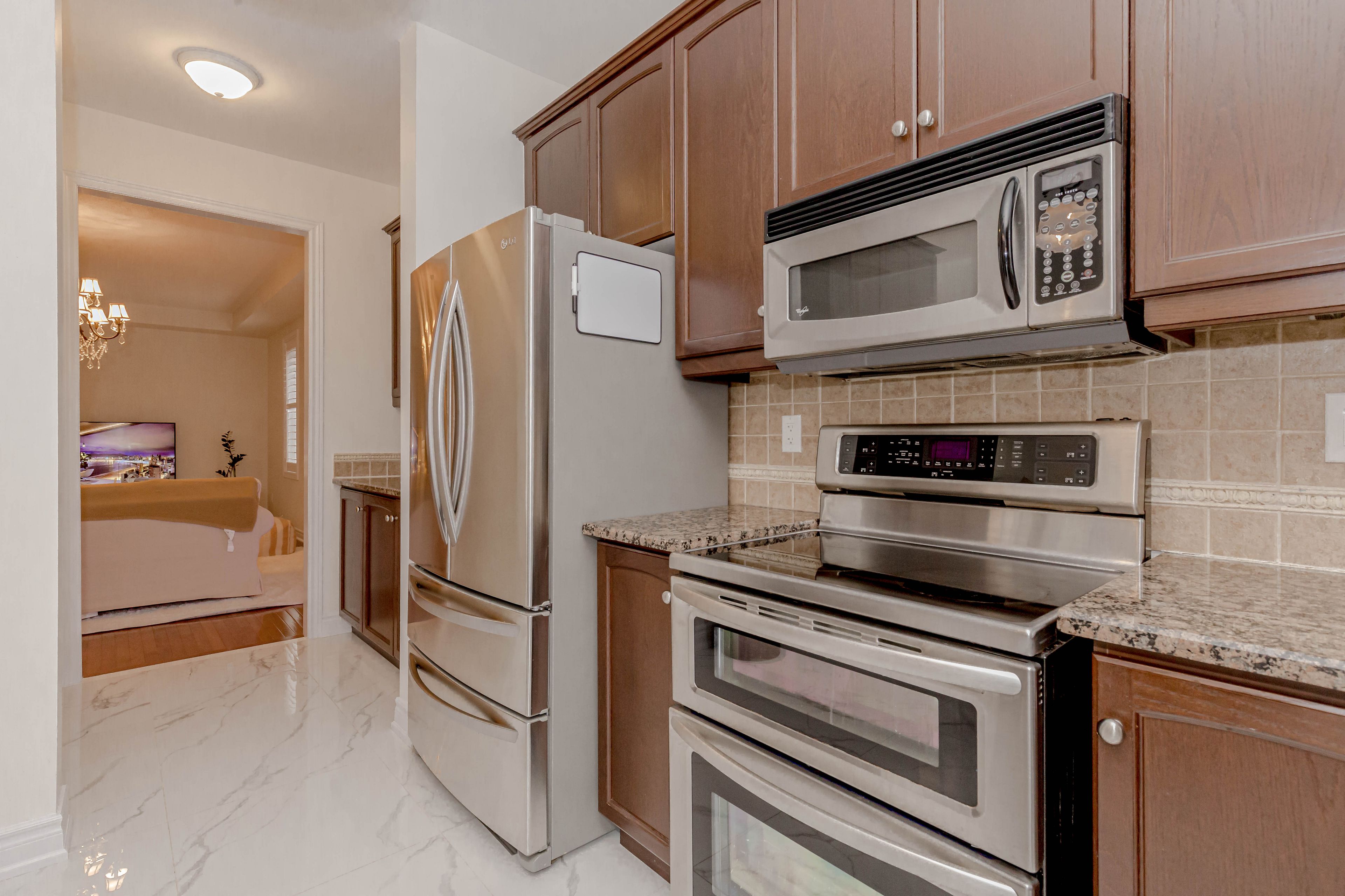 • Elegant kitchen with granite counters and stainless steel appliances.