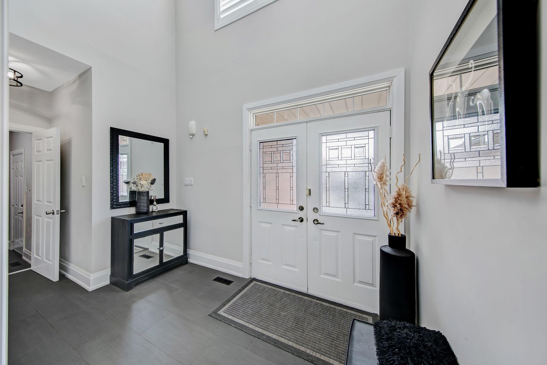 • Open concept living and dining areas with high ceilings create spaciousness.