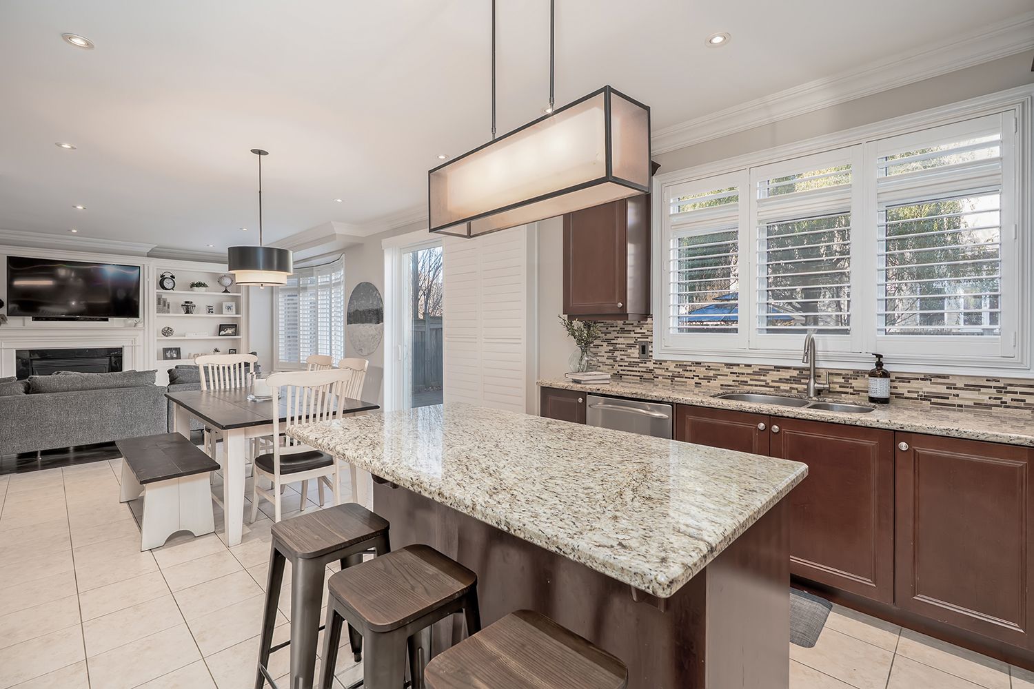 • Bright kitchen opens to a cozy family room with a gas fireplace.