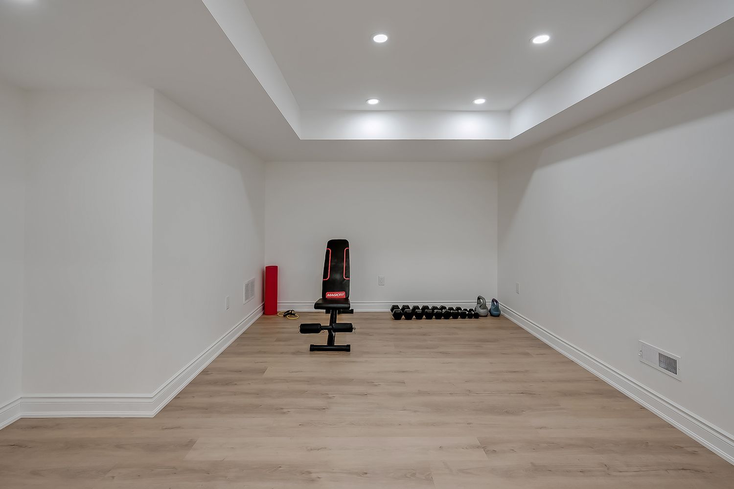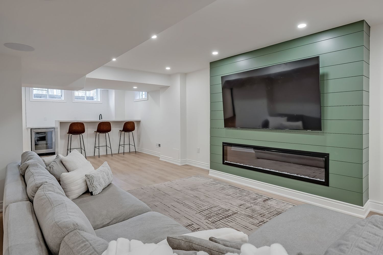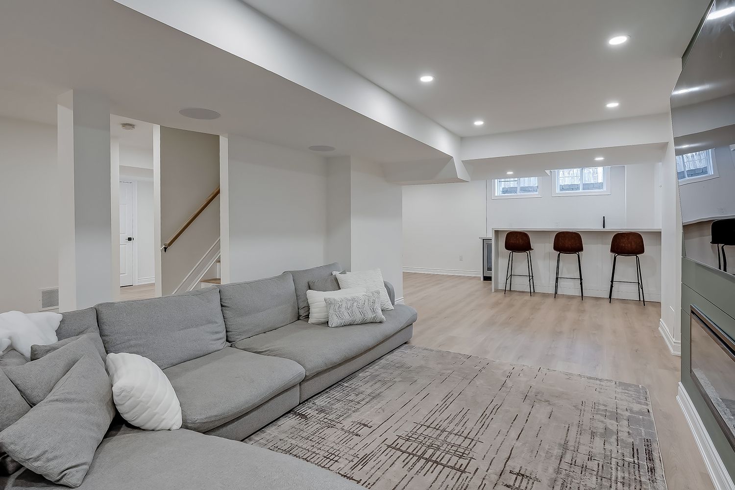 • Finished lower level with recreation space, bar area, and gym potential.