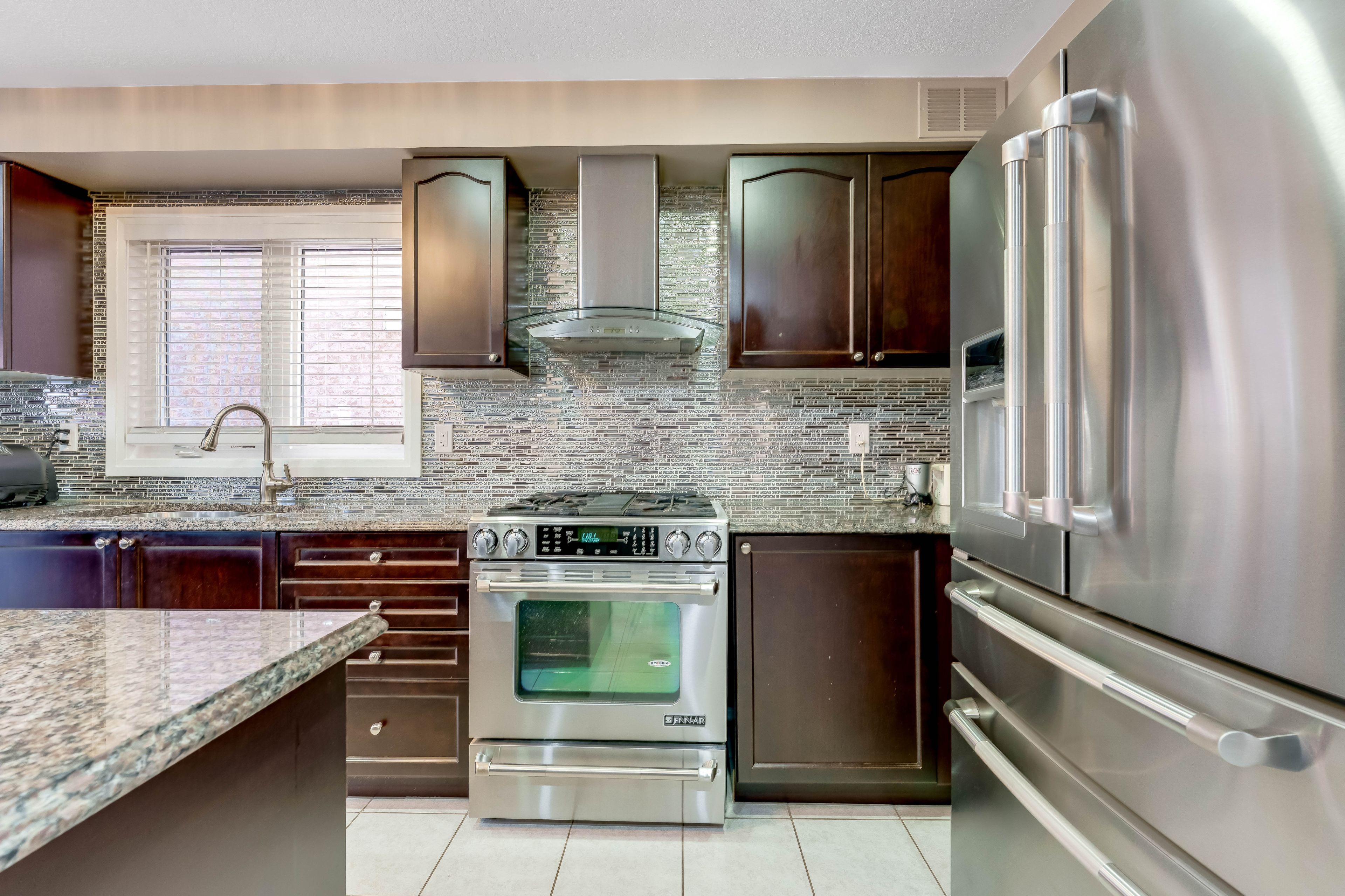 • Chef-inspired kitchen featuring stainless steel appliances and large centre island.