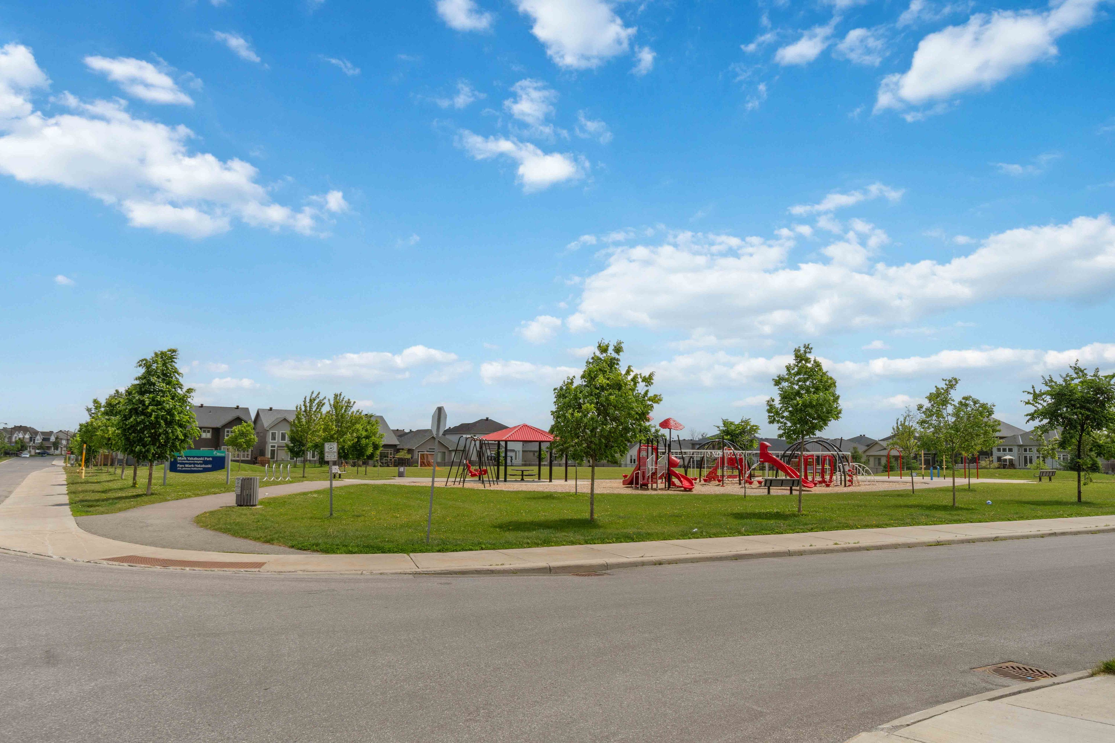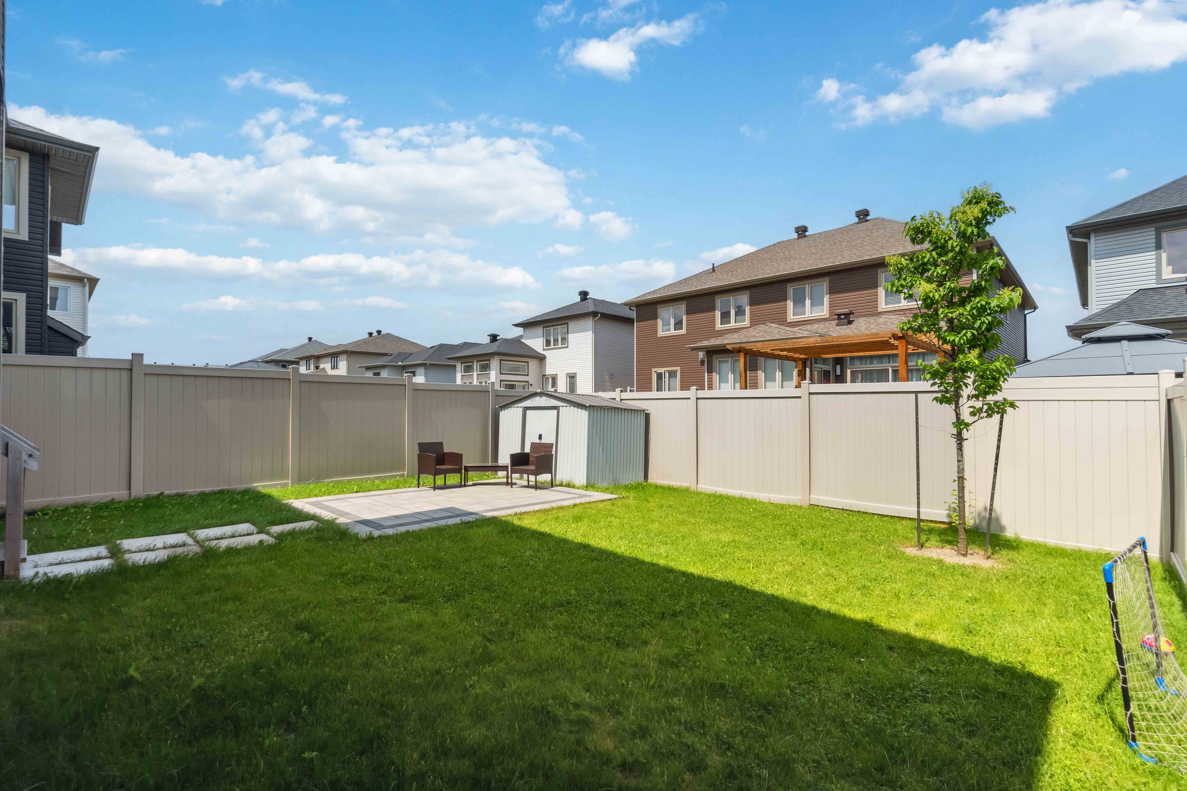 • Low-maintenance backyard with a stone patio and steps from a community park.