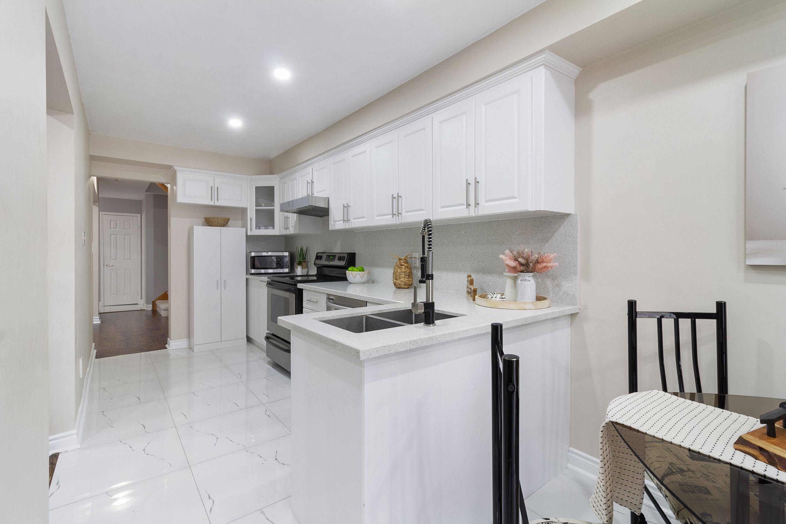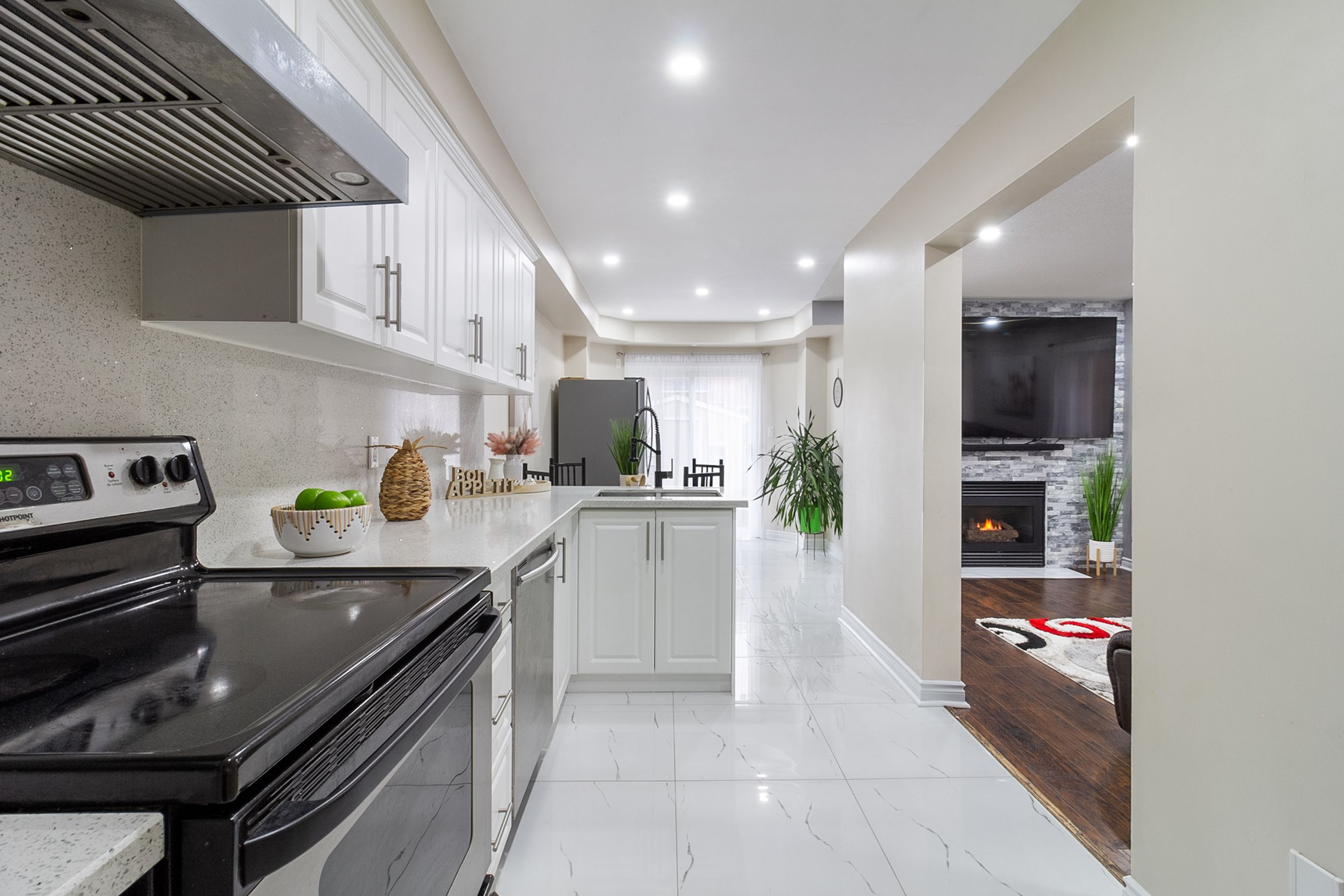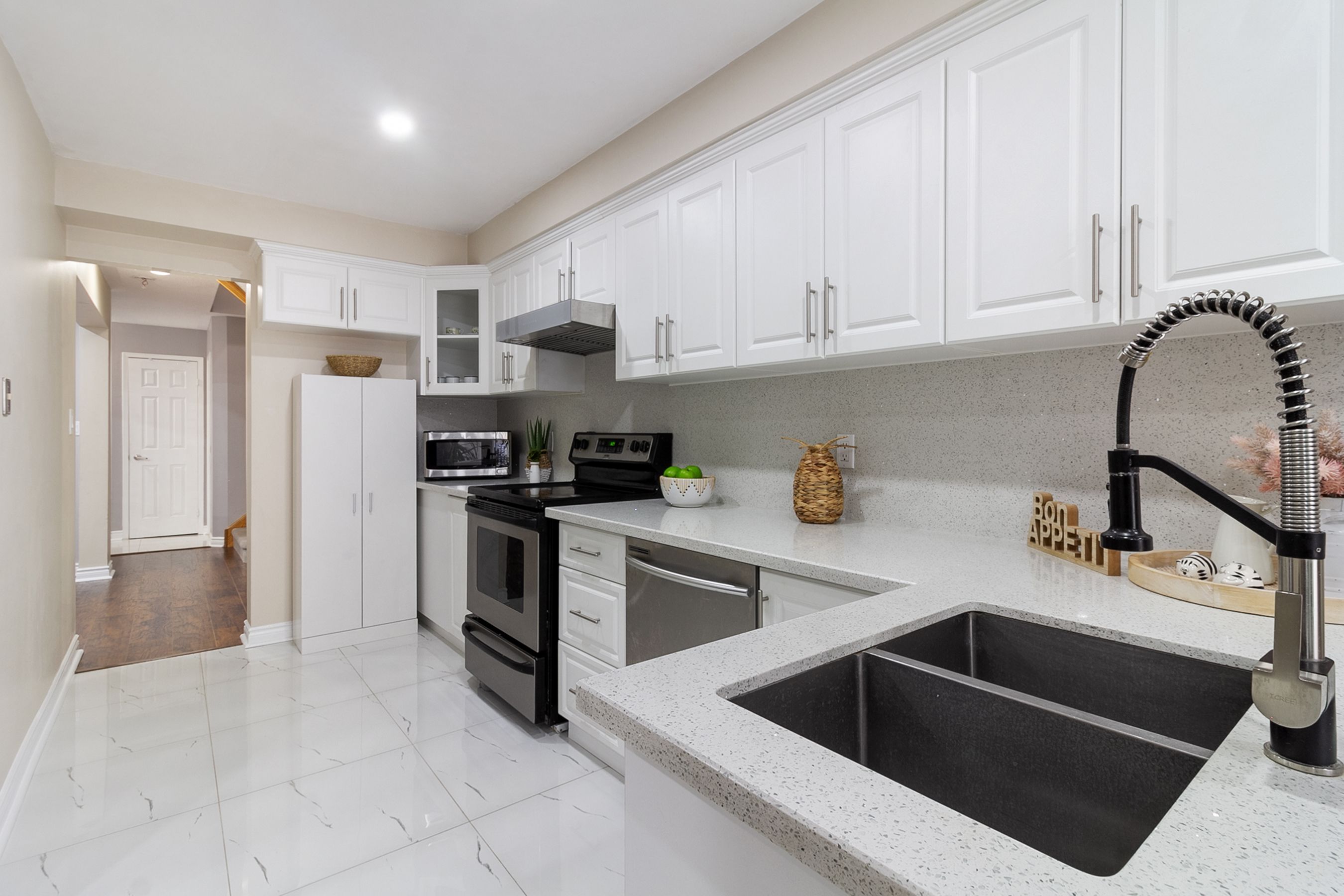 • Bright kitchen with quartz counters and stainless steel appliances for easy cooking.