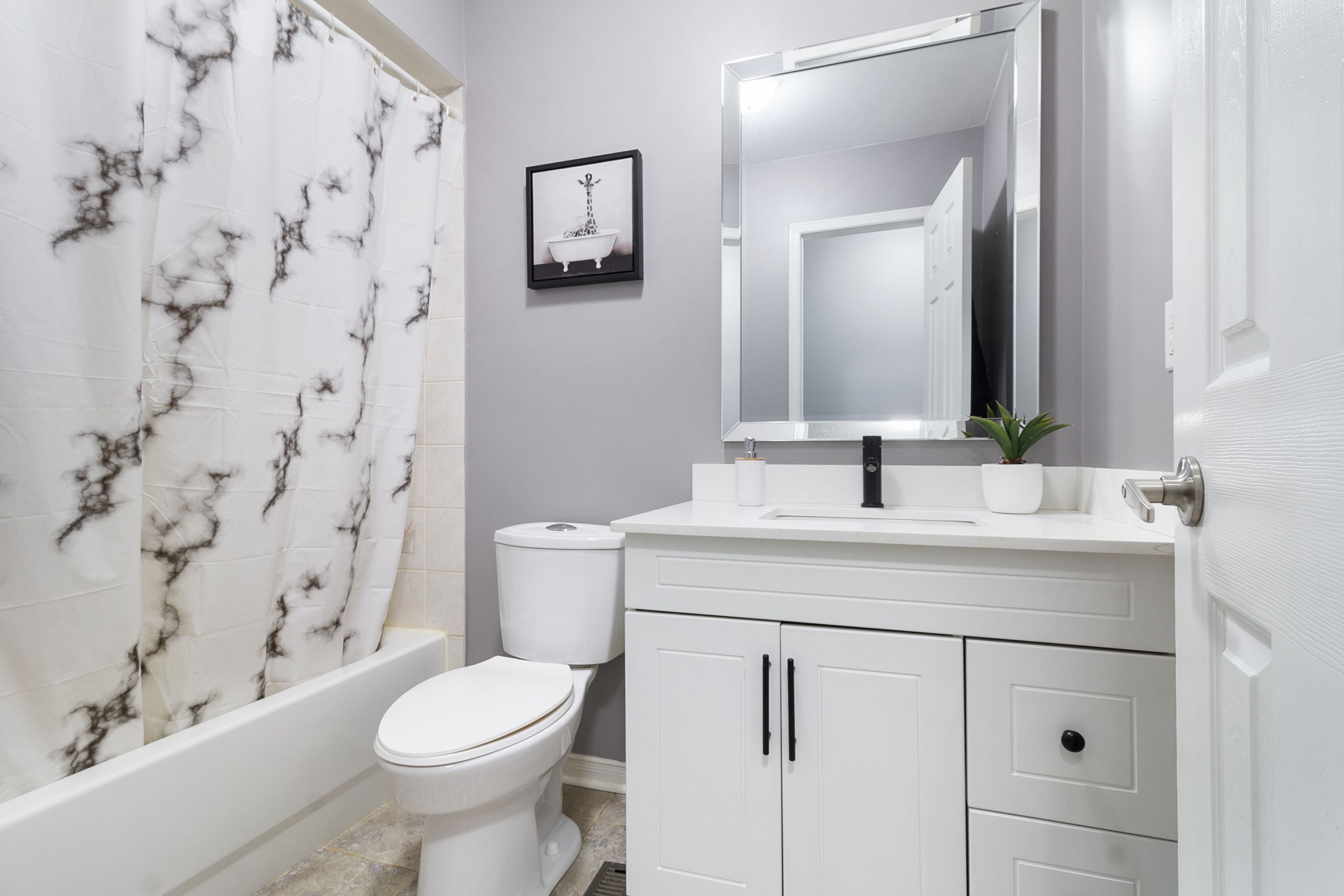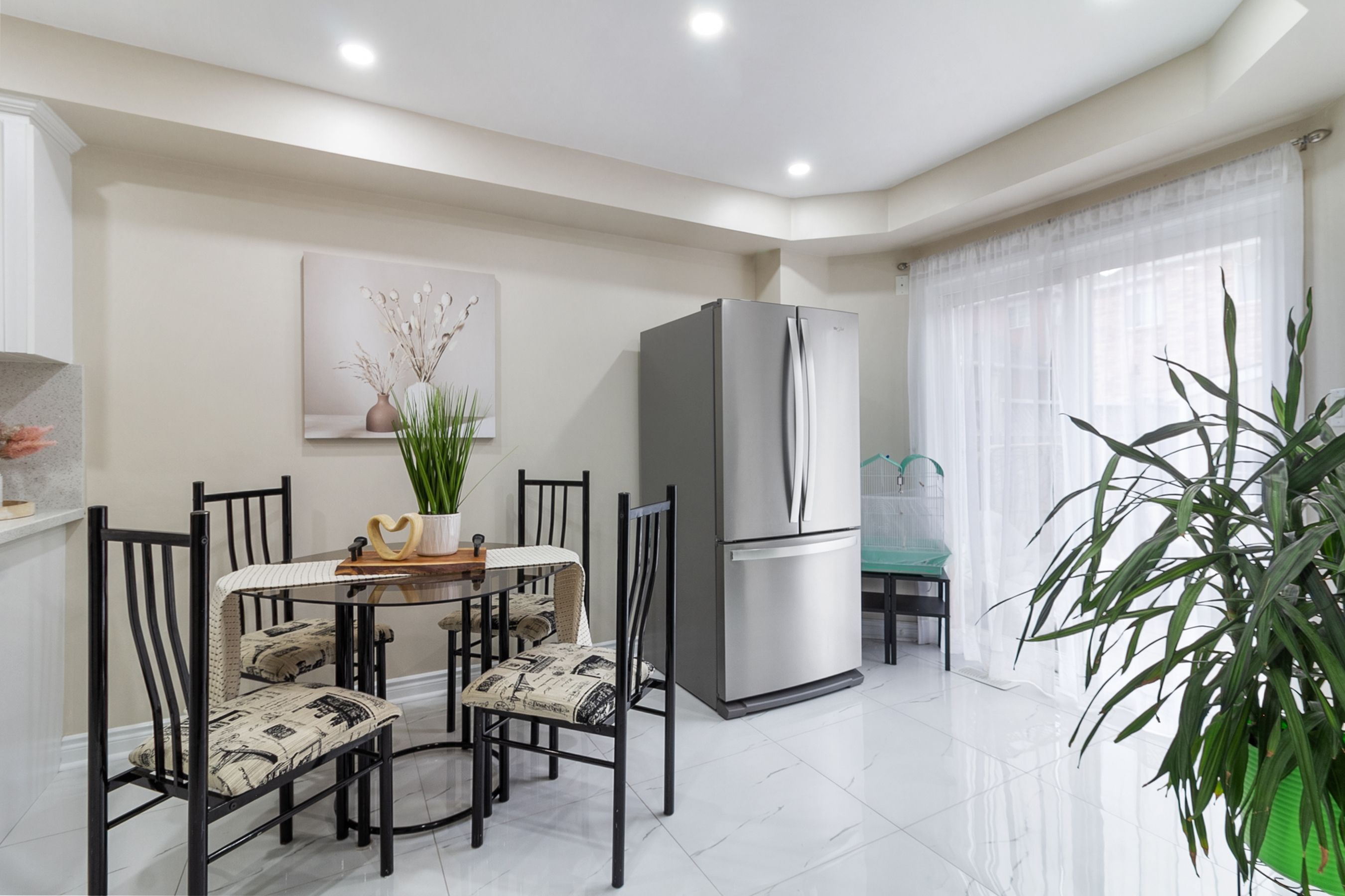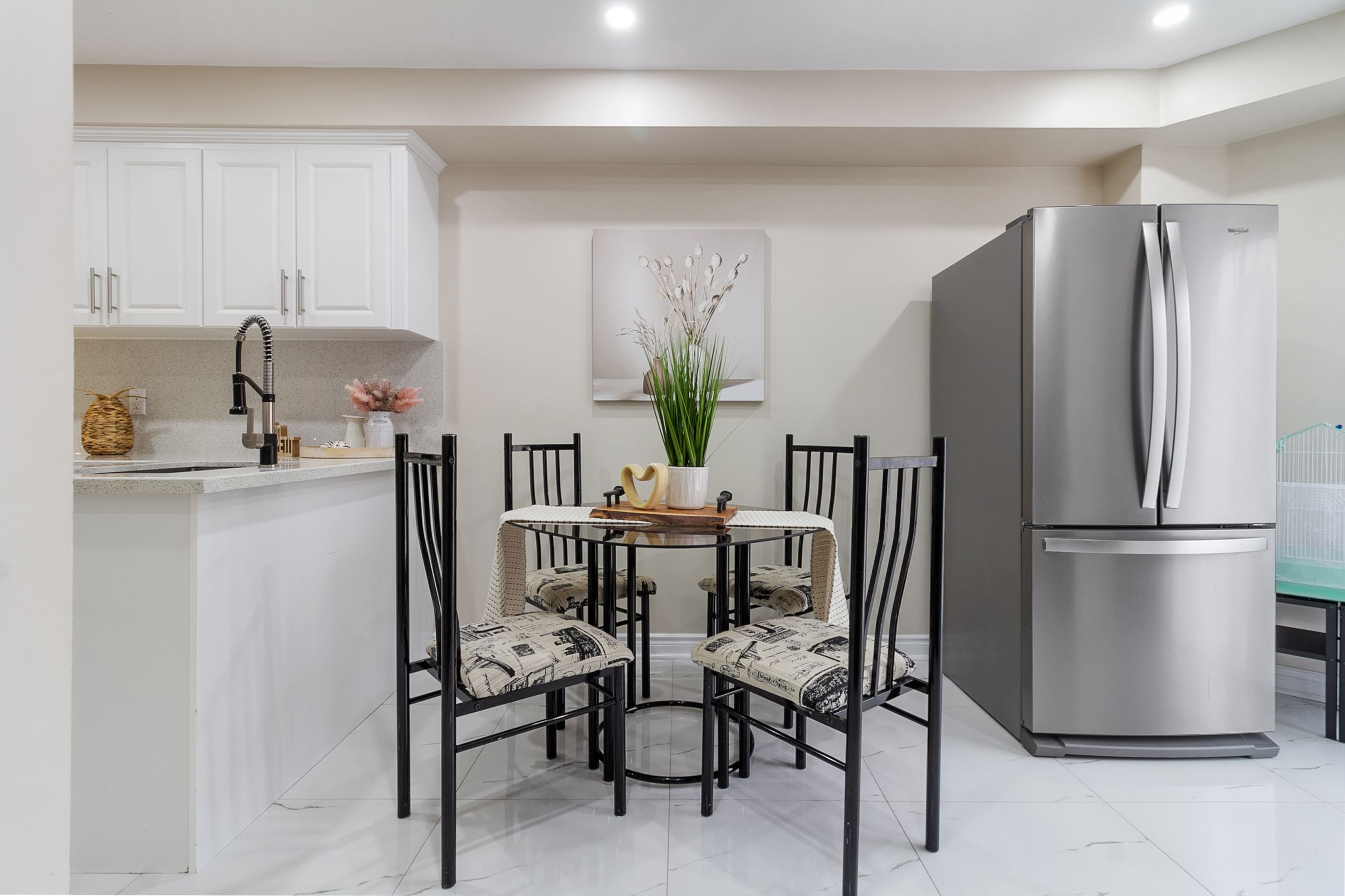 • Bright kitchen with quartz counters and stainless steel appliances for easy cooking.