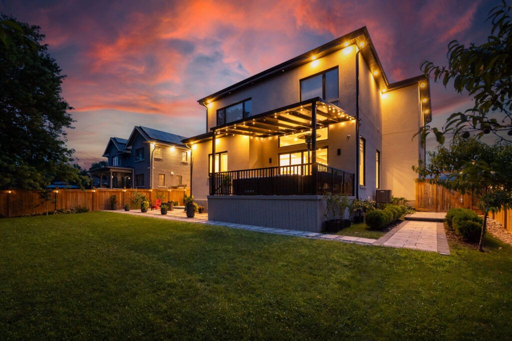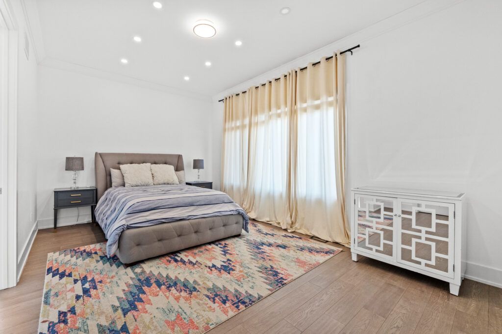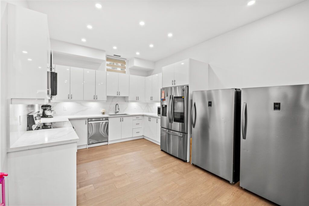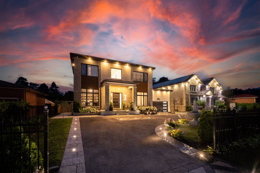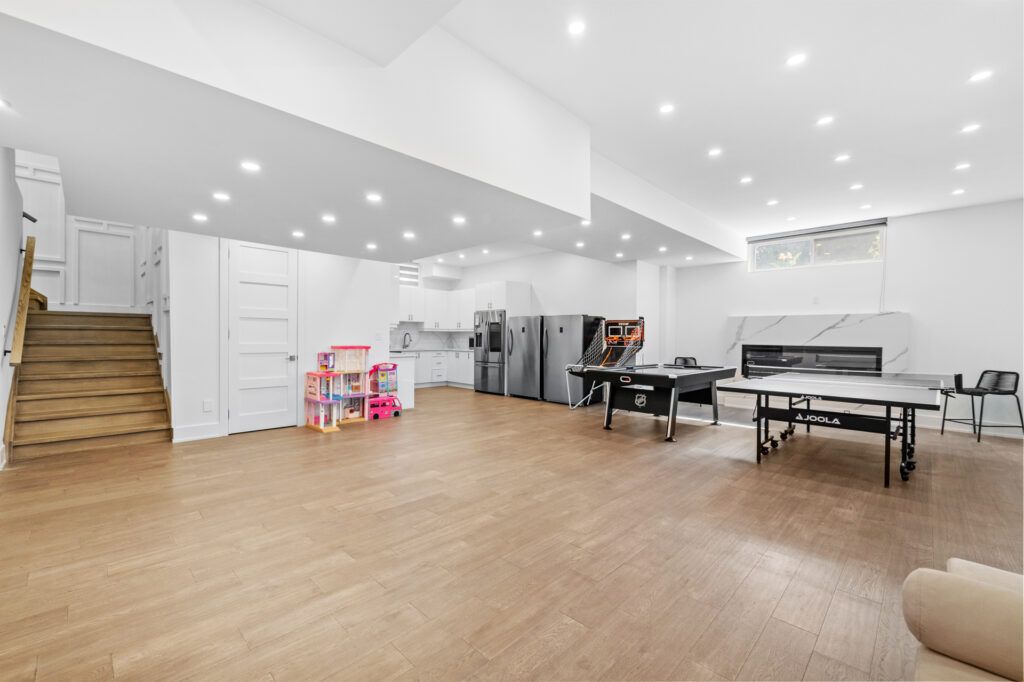 A showpiece of refined luxury, this home sits on an impressive 77' x 147' lot, where timeless design blends seamlessly with modern sophistication. The grand circular driveway, multiple entry points, and striking stone water feature create an unforgettable arrival experience. Inside, 12-foot ceilings, expansive floor-to-ceiling windows, a custom moss feature wall, and rich hardwood flooring establish a warm yet dramatic atmosphere throughout. At the heart of the home lies a chef-inspired kitchen, thoughtfully designed with sleek quartz countertops, a 10-foot waterfall island, premium built-in stainless steel appliances, central vacuum, kitchen dustpan/sweep inlet and custom full-height cabinetry that elevates both style and function. Upstairs, 10-foot ceilings enhance the sense of space, while the primary suite offers a true private retreat with a custom fireplace, an oversized walk-in closet with tailored organizers, and a spa-like ensuite featuring dual vanities, a deep soaker tub, a glass-enclosed rain shower, and refined finishes. Each additional bedroom includes its own ensuite, ample natural light, and premium details that create individual private sanctuaries. The fully finished lower level provides exceptional versatility, functioning as a self-contained rental suite or a comfortable in-law space with two spacious bedrooms, two full bathrooms, and an open-concept kitchen equipped with upgraded appliances. Outside, the beauty continues with professionally landscaped grounds, fruit trees, a full sprinkler system, a custom deck, and a covered pergola-perfect for outdoor entertaining and year-round enjoyment. A rare offering that exemplifies superior craftsmanship, thoughtful design, and contemporary luxury living.