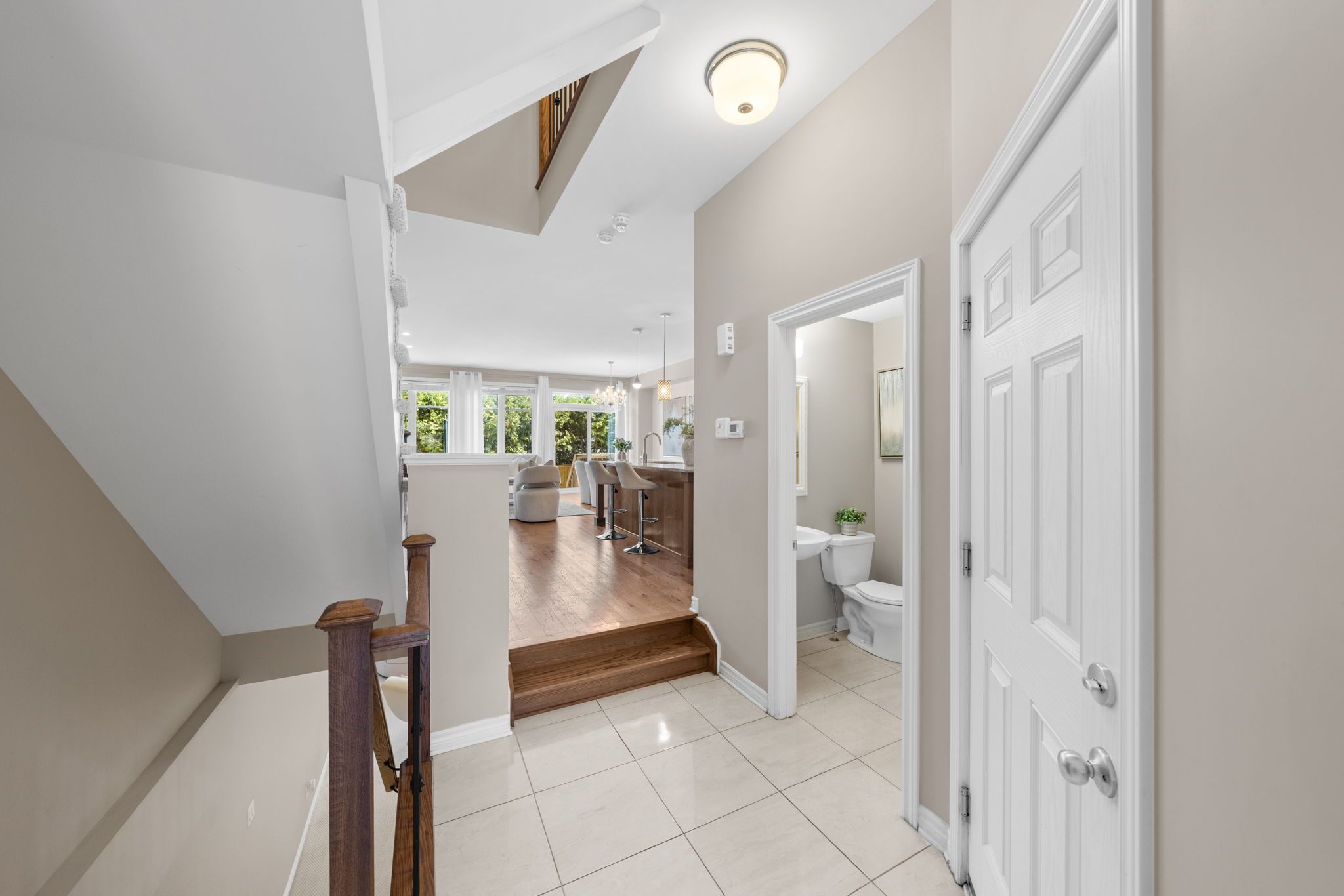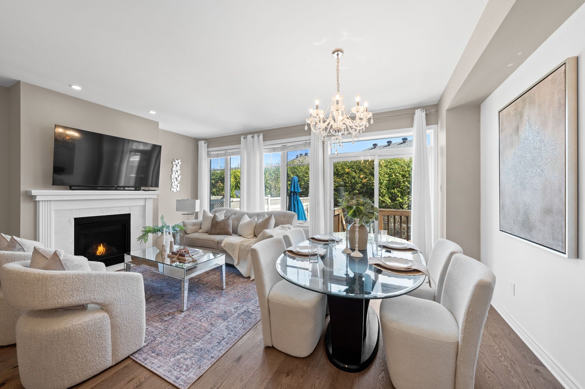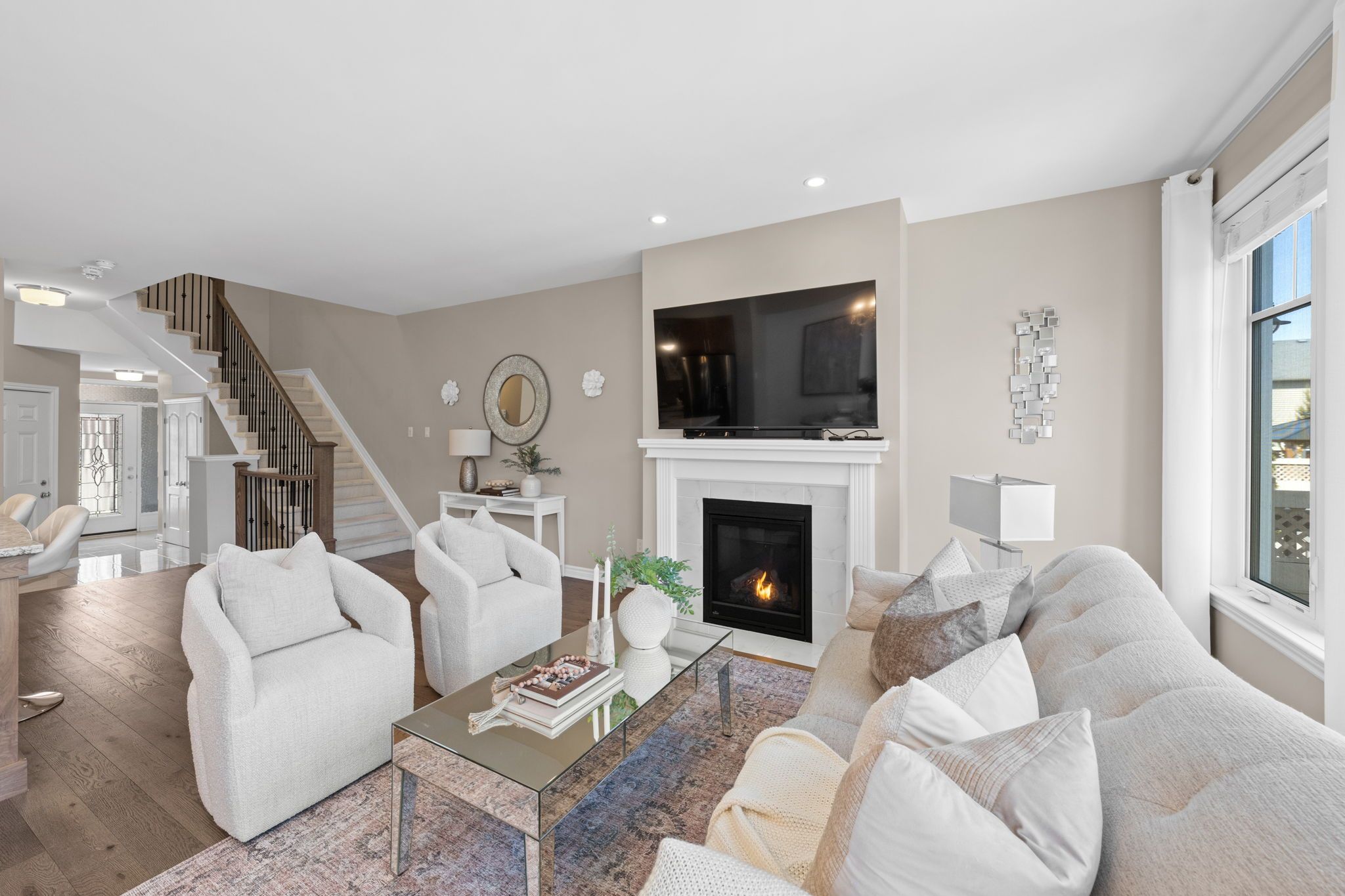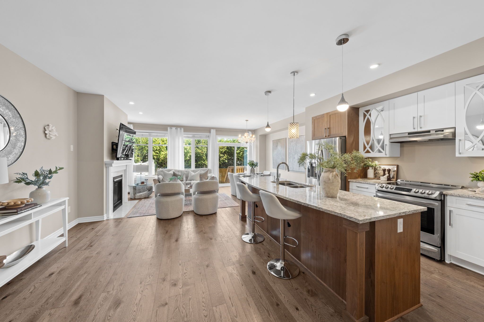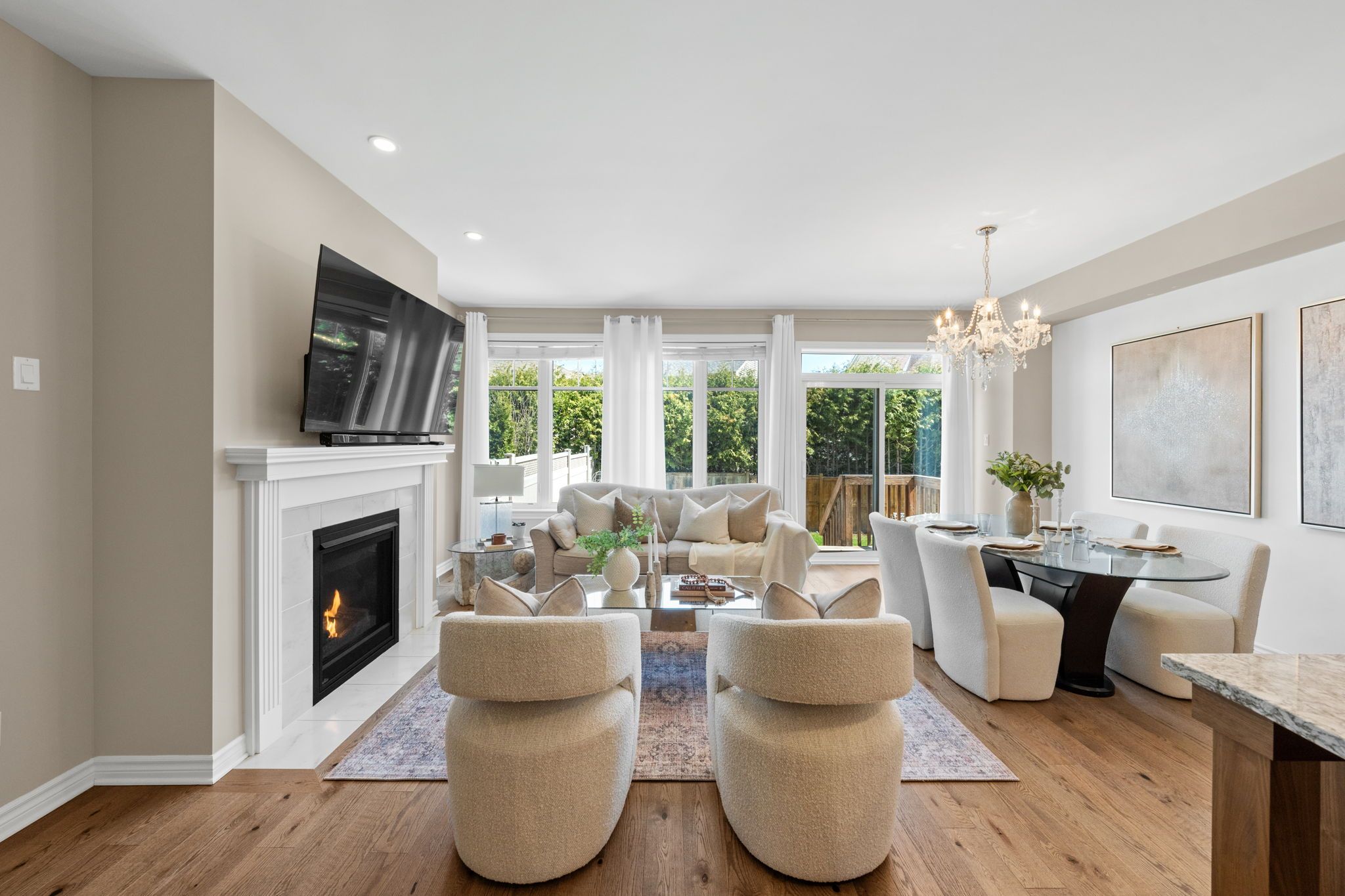 • Open concept main level with hardwood flooring and gas fireplace.