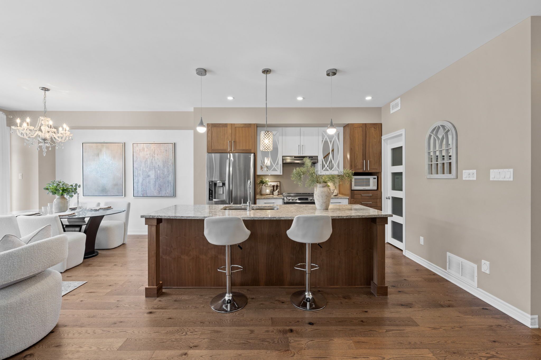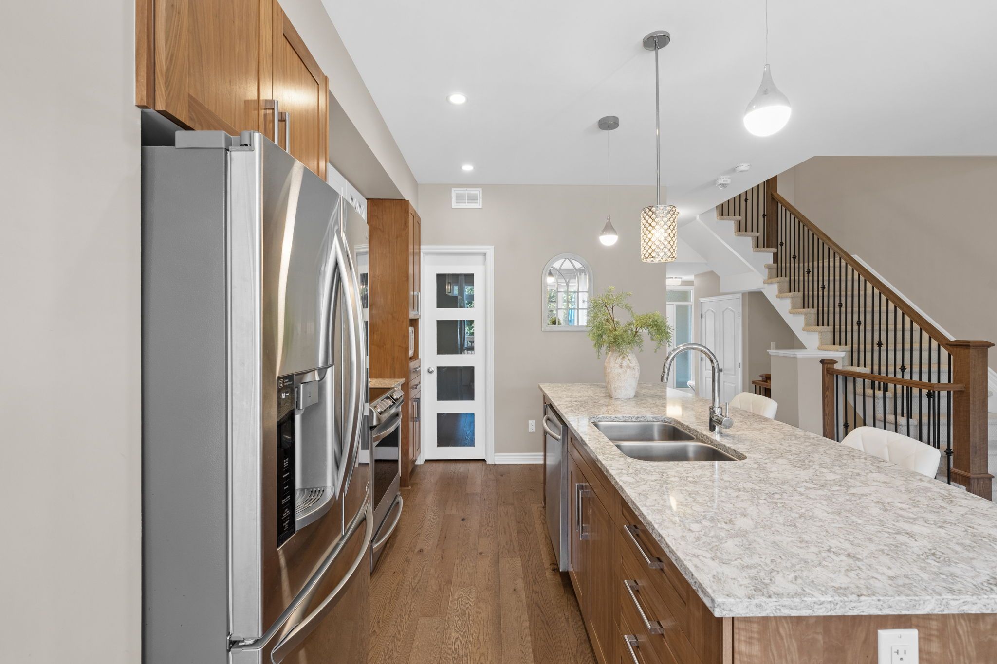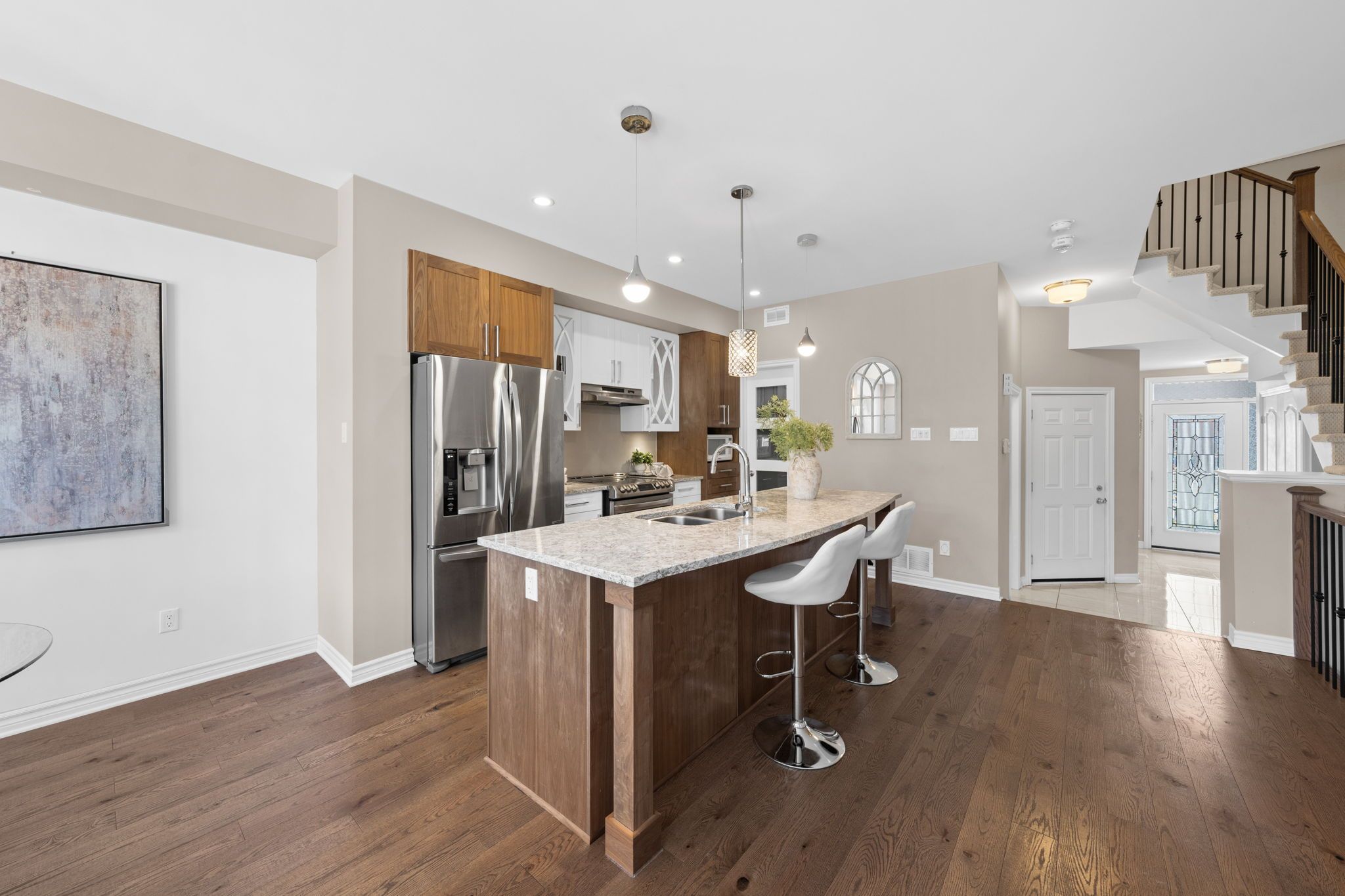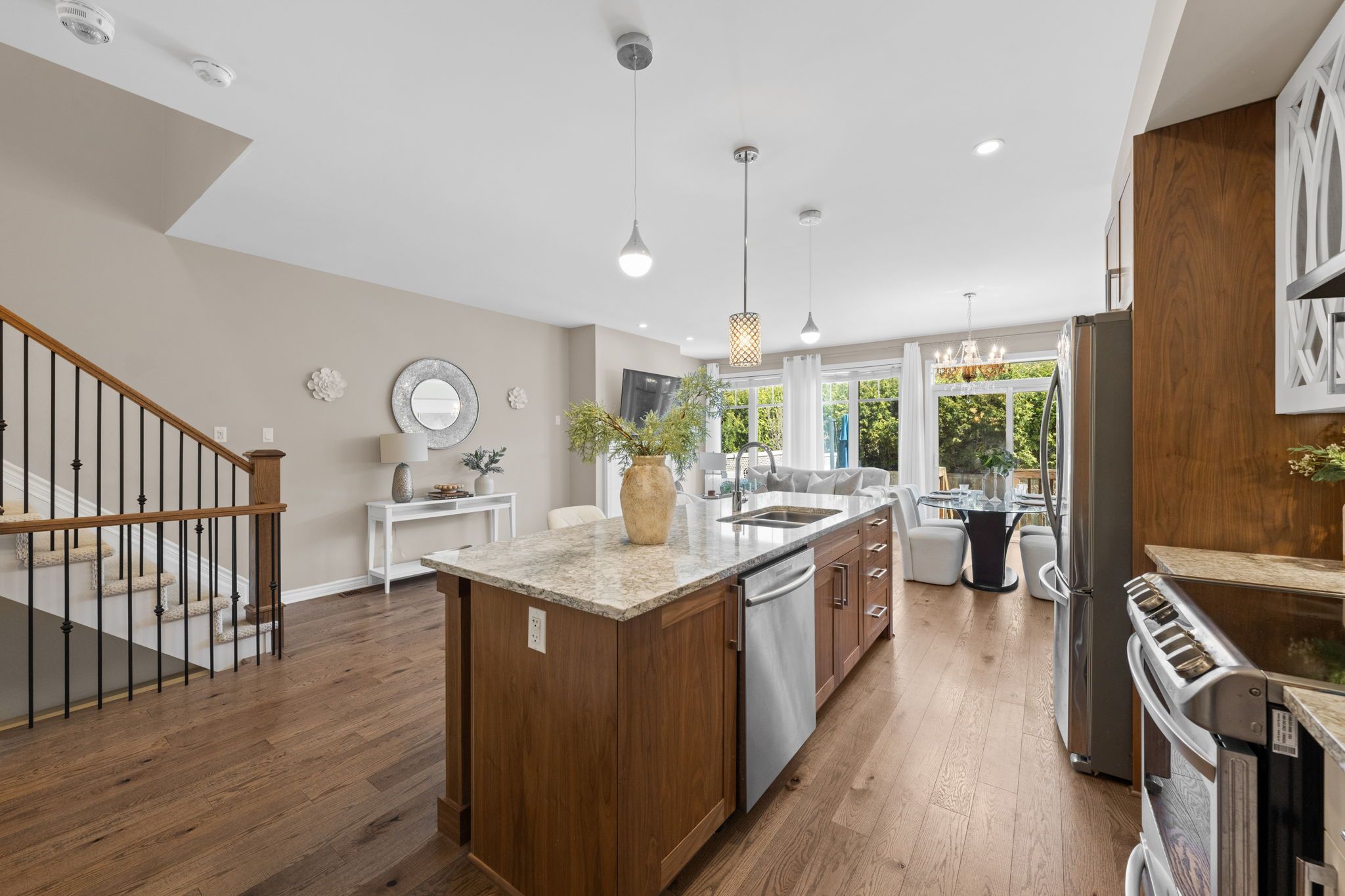 Set in poole creek village, a thoughtfully planned residential community in stittsville, this property is close to an array of family-friendly amenities and everyday conveniences. This beautifully presented tamarack cambridge model townhome offers a stylish, well appointed interior with quality finishes throughout. The three bedroom, three bathroom layout features an open concept main level with wide plank wire brushed hardwood flooring, abundant natural light, and a natural gas fireplace in the living area. The finished lower level recreation room provides a comfortable extension of the home. The kitchen is both functional and refined, featuring upgraded cabinetry, stone countertops, a walk-in pantry, and a centre island that serves as a casual gathering space. Upstairs, the primary bedroom includes a walk-in closet and a private 4-piece ensuite. Two additional bedrooms each offer walk-in closets, while a full bathroom and a separate laundry room with sink complete this level. Outside, enjoy a landscaped backyard with a deck, offering a comfortable space for outdoor relaxation.