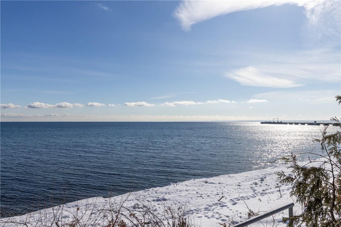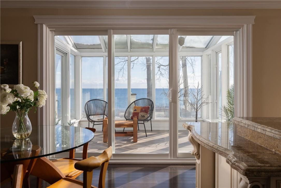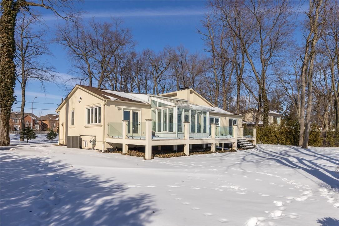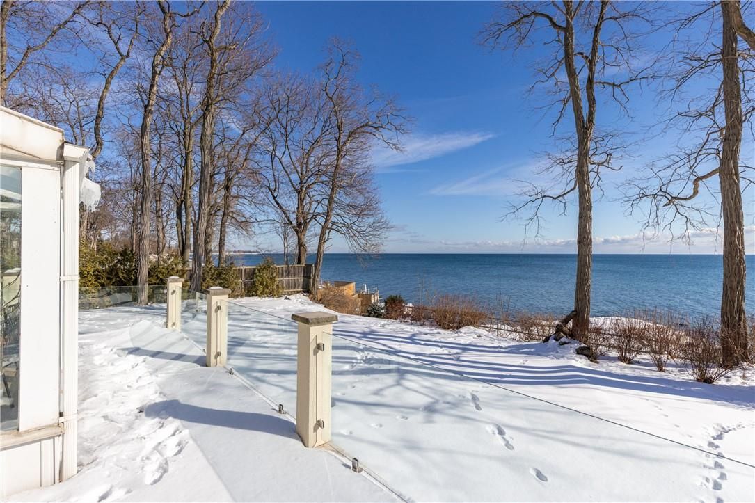 **stunning waterfront living on lake ontario**. Nestled along the shores of lake ontario with approximately 100 feet of lake frontage, this exceptional 4+1 bedroom, 3+1 bathroom residence offers an unparalleled lifestyle. A tree-lined driveway welcomes you to this tranquil retreat, where grand entry doors open to a light-filled interior accentuated by expansive windows and skylights throughout. The open-concept living room showcases remarkable architectural detail in the skylights, highlighted by a double-sided wood-burning fireplace shared with the breakfast area and kitchen. The spectacular custom kitchen features granite countertops, premium appliances, and a walkout to the sunroom-all commanding unobstructed lake views. The separate dining area is perfect for a more formal evening with family and friends. The principal bedroom provides a five-piece ensuite, walk-in closet, and direct walkout to the backyard overlooking the water. The second bedroom offers deck access with stunning lake vistas, while a versatile third bedroom and loft-level fourth bedroom complete the main living spaces. The finished lower level encompasses a family room, recreation area with wood stove, additional bedroom, laundry, and two-piece bath. This unique property delivers breathtaking waterfront views without the added expense of maintaining a seawall. Conveniently located near shell park, the waterfront trail, burloak waterfront park, and appleby go station, this residence represents an extraordinary opportunity for discerning buyers. Luxury certified