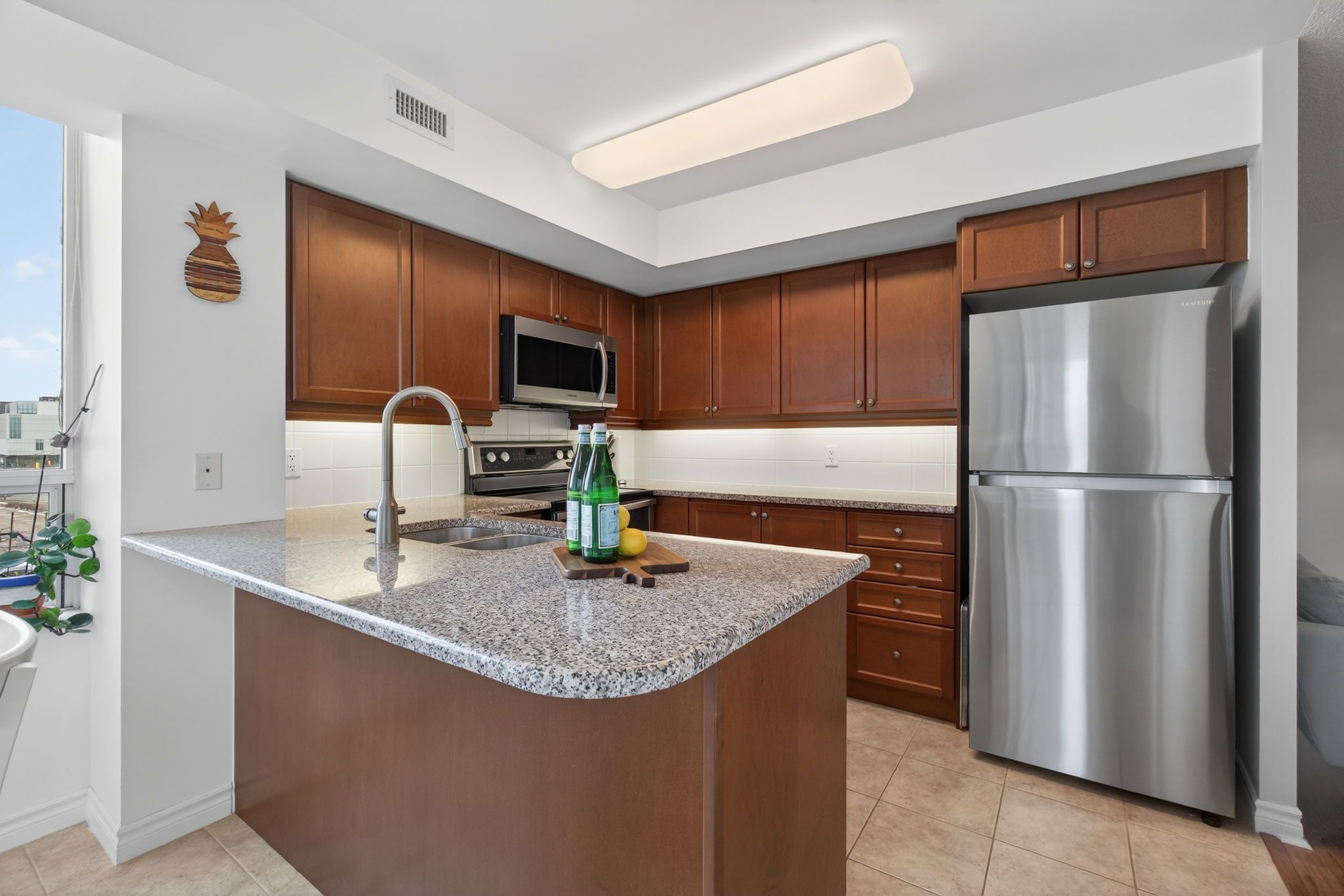 Welcome home to suite 505 at 335 rathburn rd w. This spacious & bright 2 bed, 2 full bath 999 sq ft corner unit of thoughtfully designed living space is located in the heart of mississauga's vibrant city centre. The unit features 9 ft ceilings, a functional layout designed for comfortable living w/ desirable north-east exposure, allowing for plenty of natural light throughout the day. A separate kitchen & dining area, providing added privacy and a more traditional feel. The kitchen is equipped with s/s appliances, tile flooring for easy cleanups, ample cabinetry & counter space - perfect for hosting and everyday cooking. A generous sized living area and an oversized primary bedroom with 4pc ensuite. Walk-in closets in both bedrooms. 3 walk-outs (kitchen/living/primary rm) to your large balcony, equipped with deck-in & turf. 1 parking and 1 locker included! Enjoy access to premium amenities including; party/meeting rm, visitor parking, gym, indoor pool & hot tub , sauna, billiards/ping pong, bowling alley, media/theatre rm, library, outdoor tennis court & children's play area and24-hour concierge service! Unbeatable location, just steps to square one shopping centre, top rated schools, public transit, parks, restaurants, and major highways-everything you need is right at your doorstep.