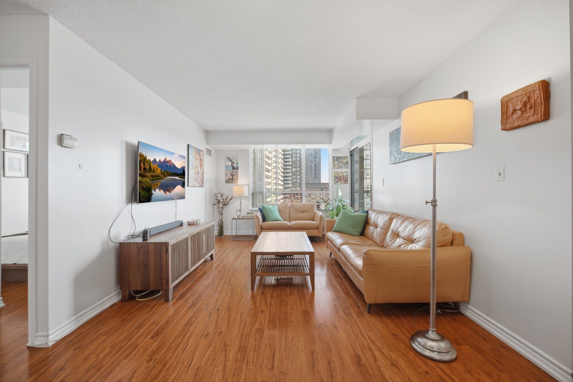 Bright, spacious and beautifully maintained, this 2 bedroom plus separate den condo offers stylish living in one of mississauga's most convenient urban locations. The modern kitchen features granite counters, a breakfast bar, stainless steel appliances, and subway tile backsplash, opening seamlessly into the combined living and dining area. Laminate flooring runs through the principal rooms, adding warmth and continuity throughout the suite. The open concept living and dining space is filled with natural light from large windows and offers a walkout to the south east facing balcony with floating wood flooring and open city views. The separate den provides a flexible space for a home office, study area, or guest room. The primary bedroom includes laminate floors, a walkout to the balcony, a walk in closet, and a private 3 piece ensuite with separate shower and glass sliding door. The second bedroom features laminate flooring, a double closet, and a large window. Residents enjoy outstanding building amenities including an indoor pool, gym, party room, theatre room, 10 pin bowling alley, billiard room, 24 hour concierge, and more. Located steps to square one, celebration square, living arts centre, sheridan college, central library, restaurants, theatres, transit, and go access, with quick connections to highways 403, 401, and 410.