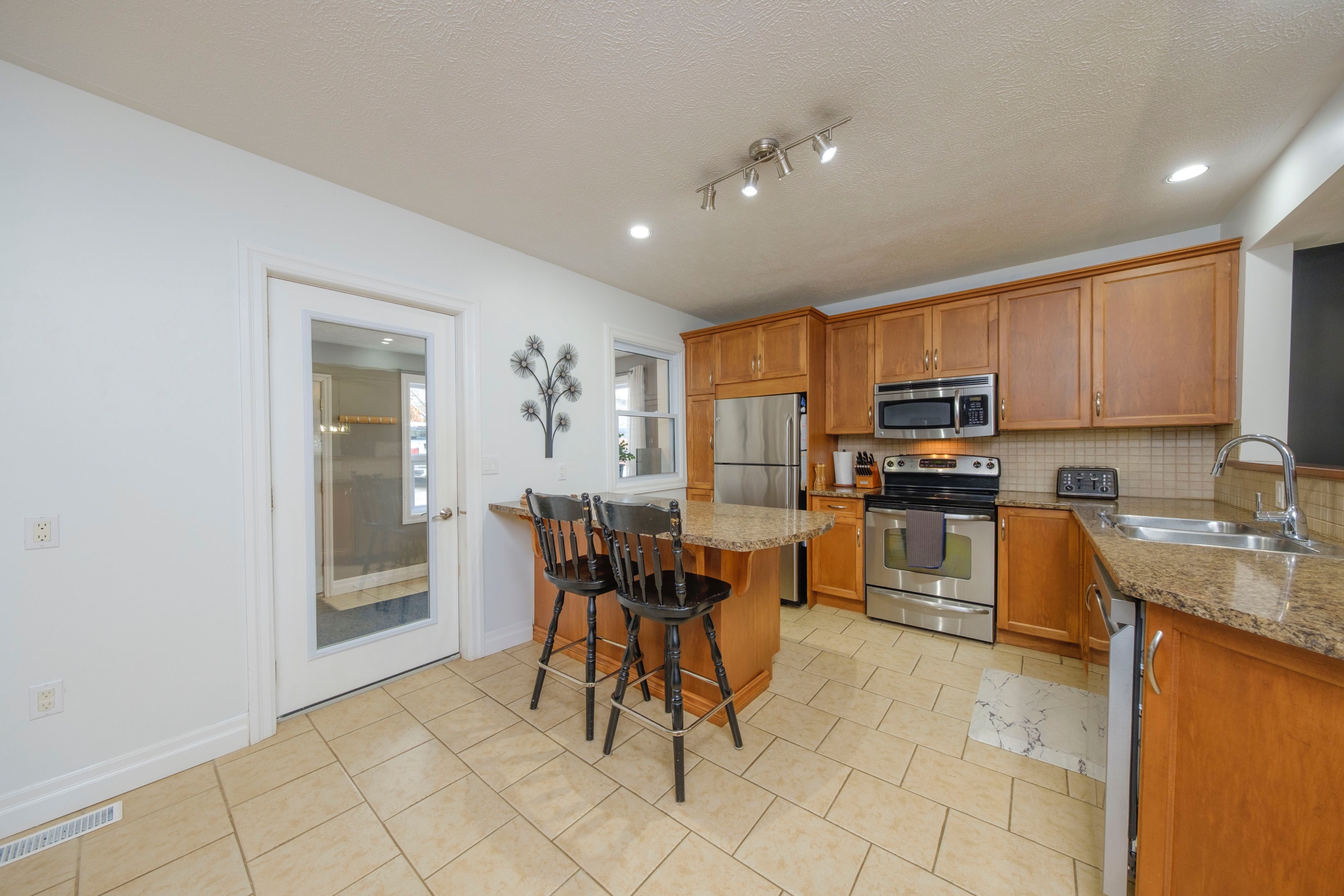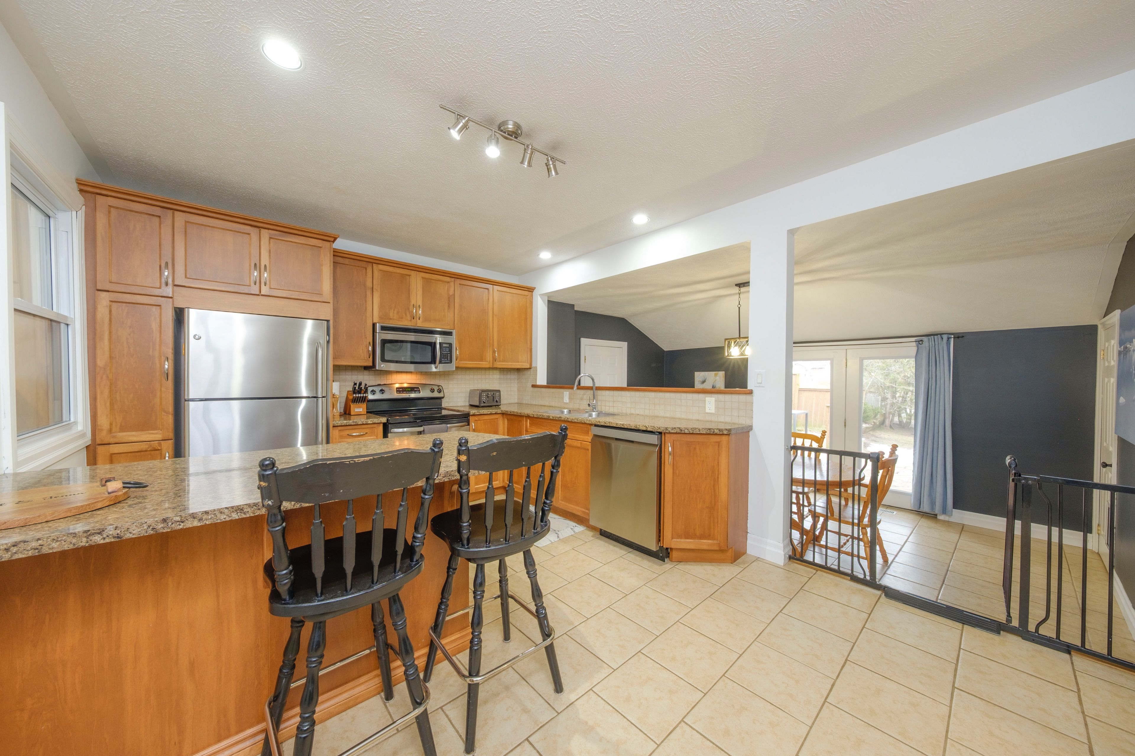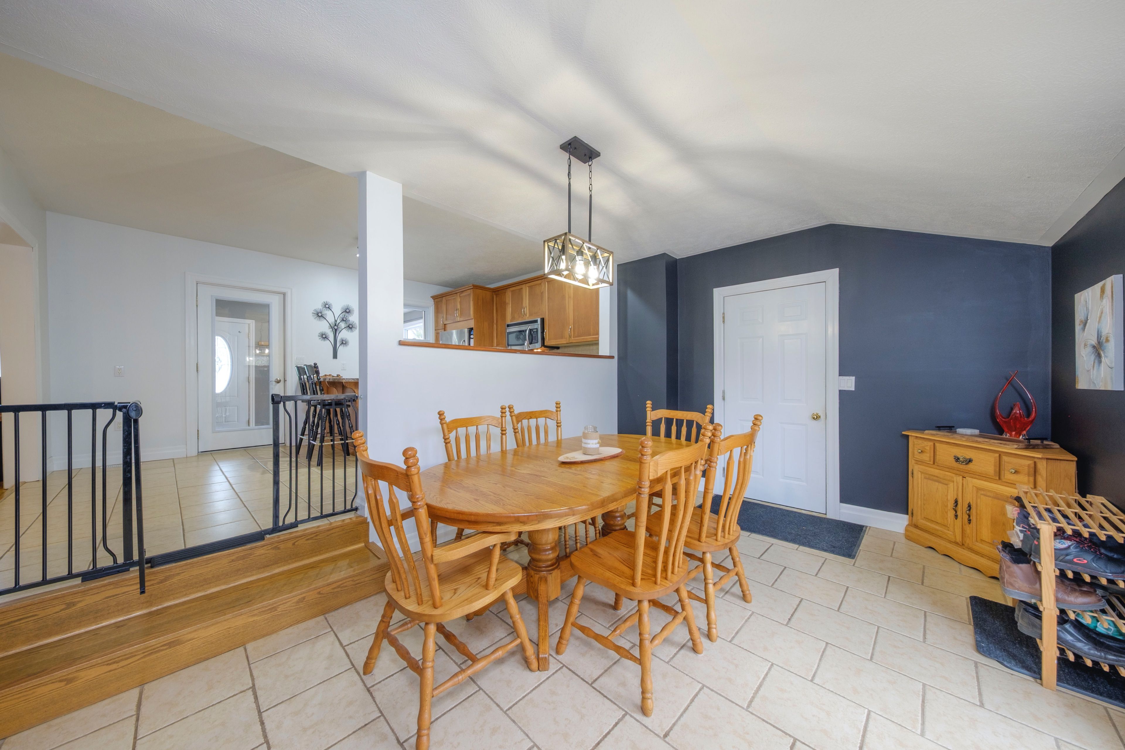 • Open-concept kitchen with sunken dining area and patio doors.