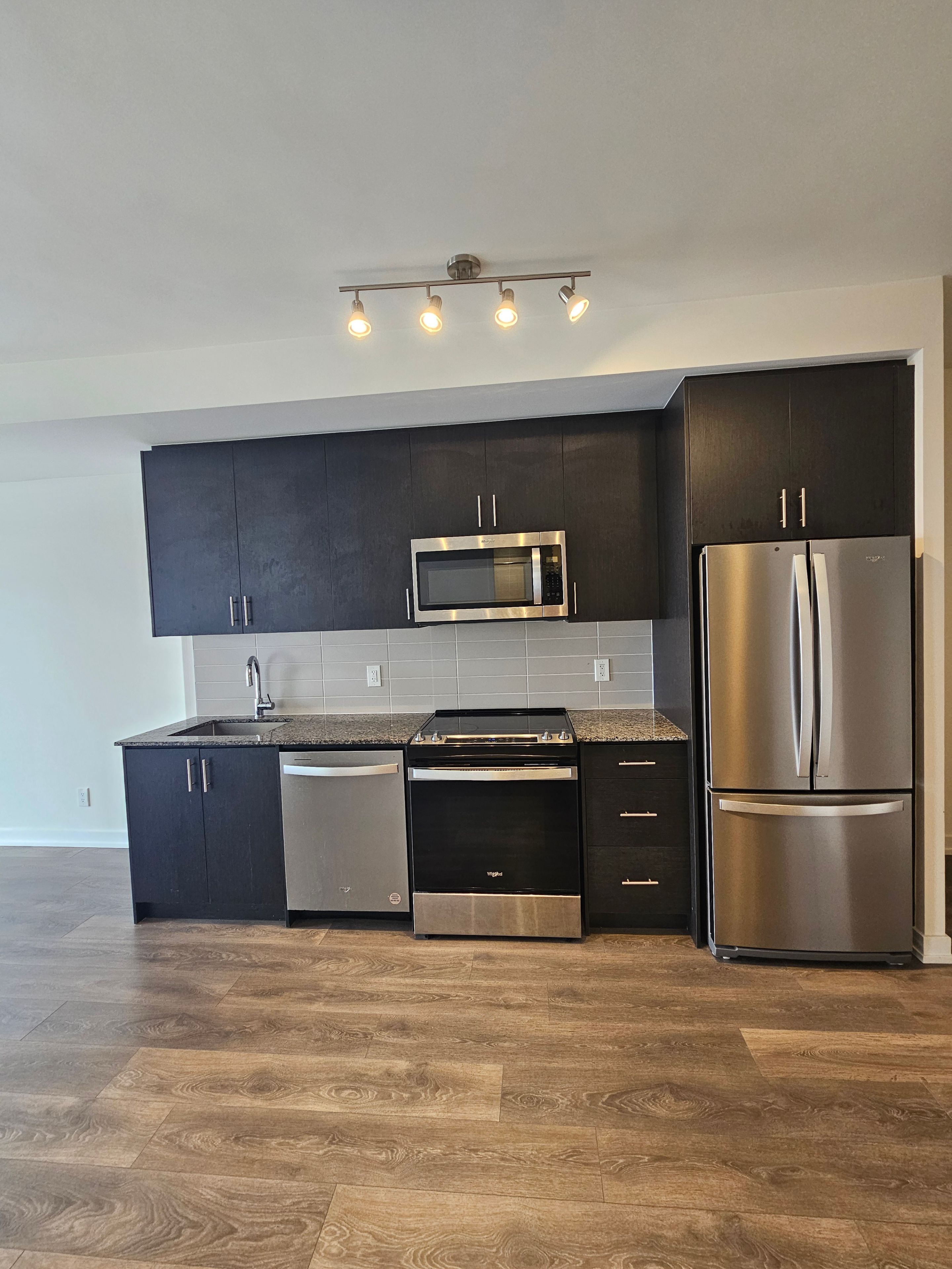 • Modern kitchen features granite countertops and stainless steel appliances.