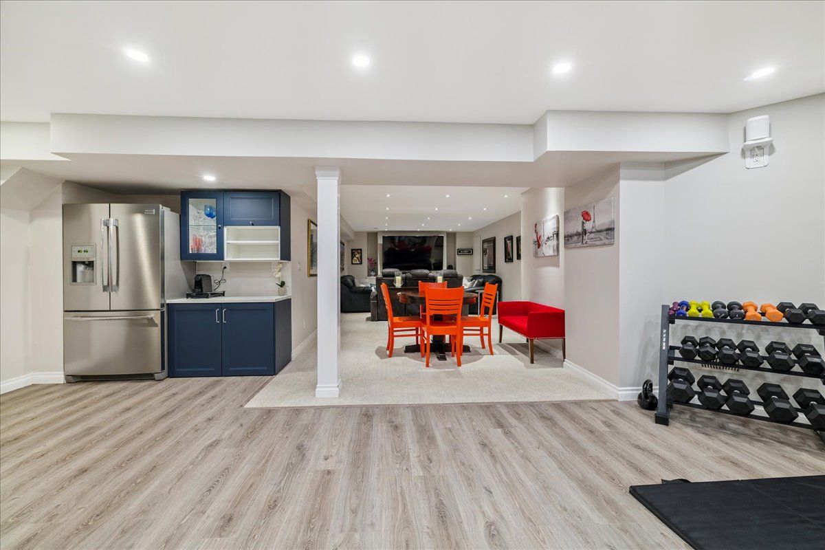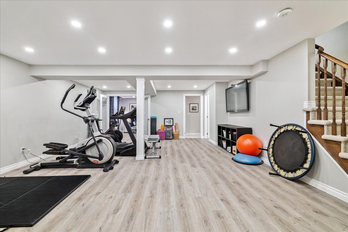 • Finished lower level includes rec room, gym space, and two extra bedrooms.
