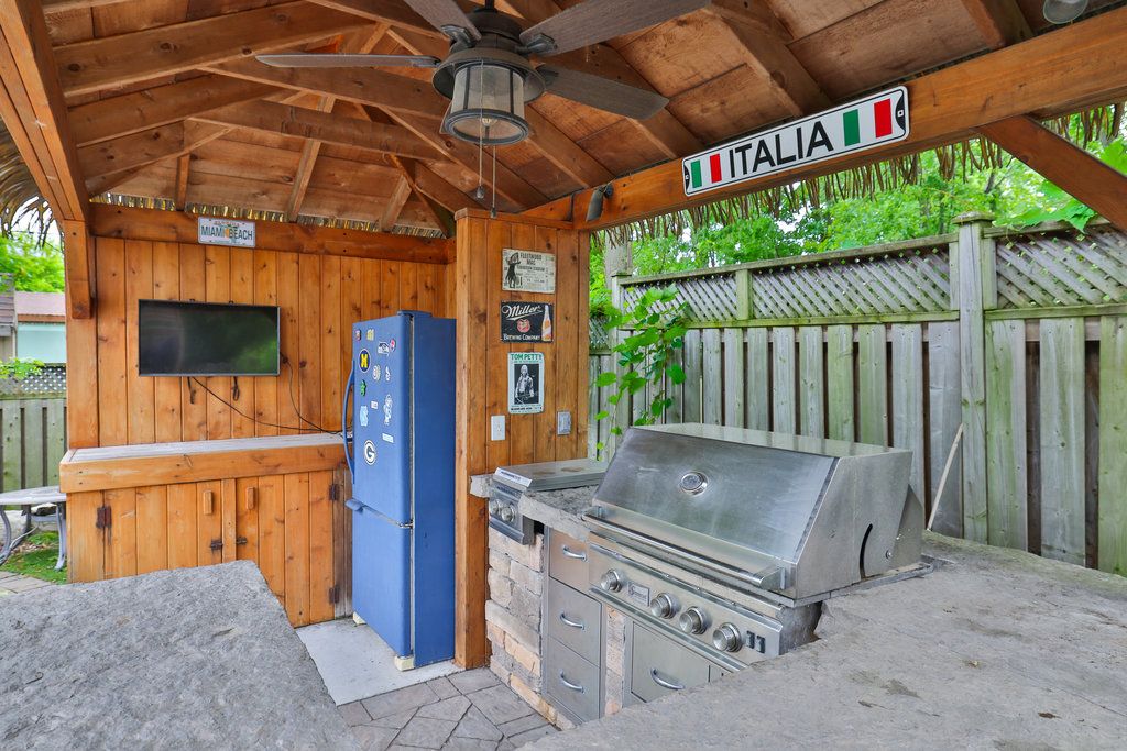 Located in the sought-after palmer community, this beautifully updated 3+1 bedroom raised bungalow is an entertainer's dream. With thousands invested in professional landscaping, the backyard oasis features a saltwater pool and a custom-built tiki hut with a fully equipped outdoor kitchen-complete with a gas bbq, gas stovetop, fridge, built-in storage, and multiple seating areas designed for relaxation and entertaining. Inside, you're welcomed into a bright and spacious living and dining area, alongside a sun-filled eat-in kitchen with walkout to a private side deck that leads seamlessly to the backyard retreat. The fully finished lower level includes a fourth bedroom, a large recreation room with a cozy woodburning fireplace, a bar, and a 3-piece bathroom-perfect for guests or extended family. Ideally located just steps to elementary schools, parks, shopping, and transit, this exceptional home offers the perfect blend of comfort, style, and outdoor luxury living.