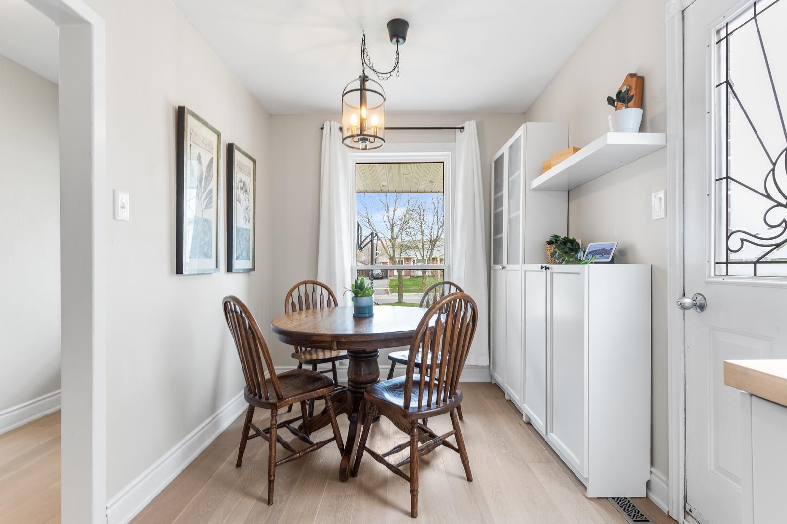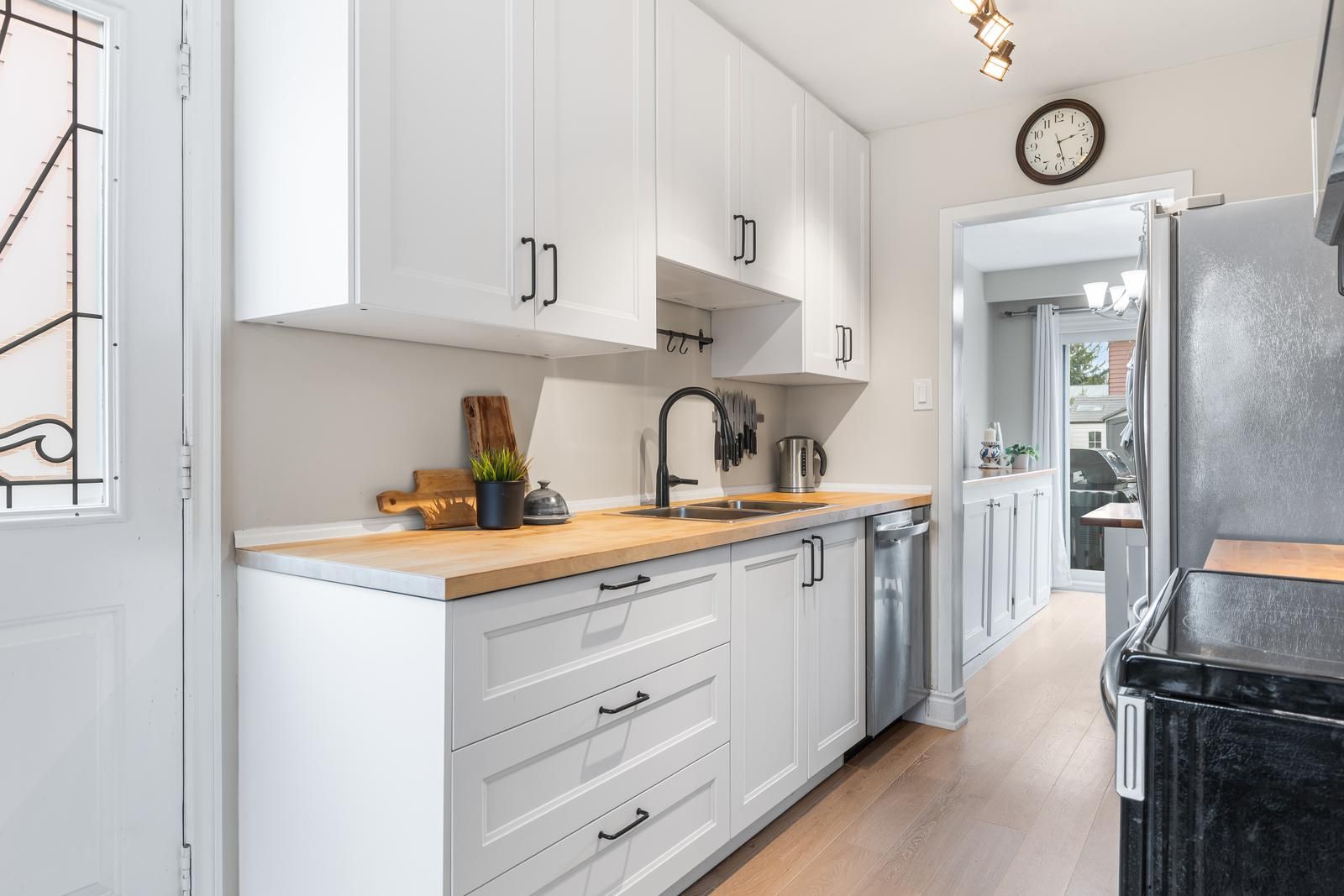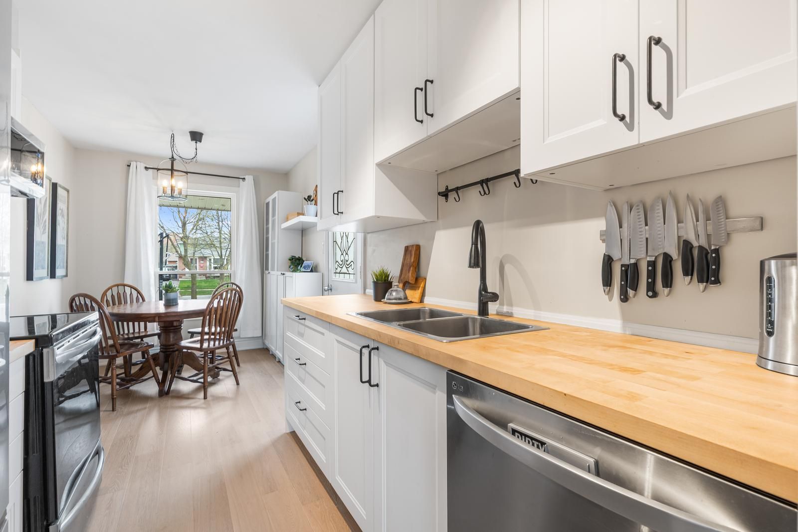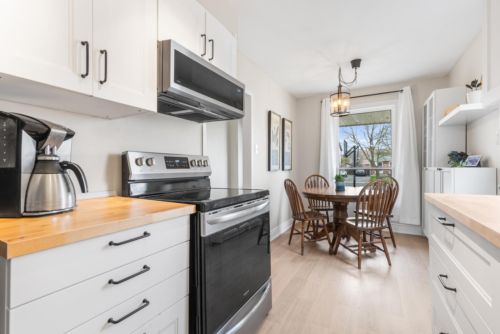 • Renovated eat-in kitchen with modern appliances and butcher block countertops.