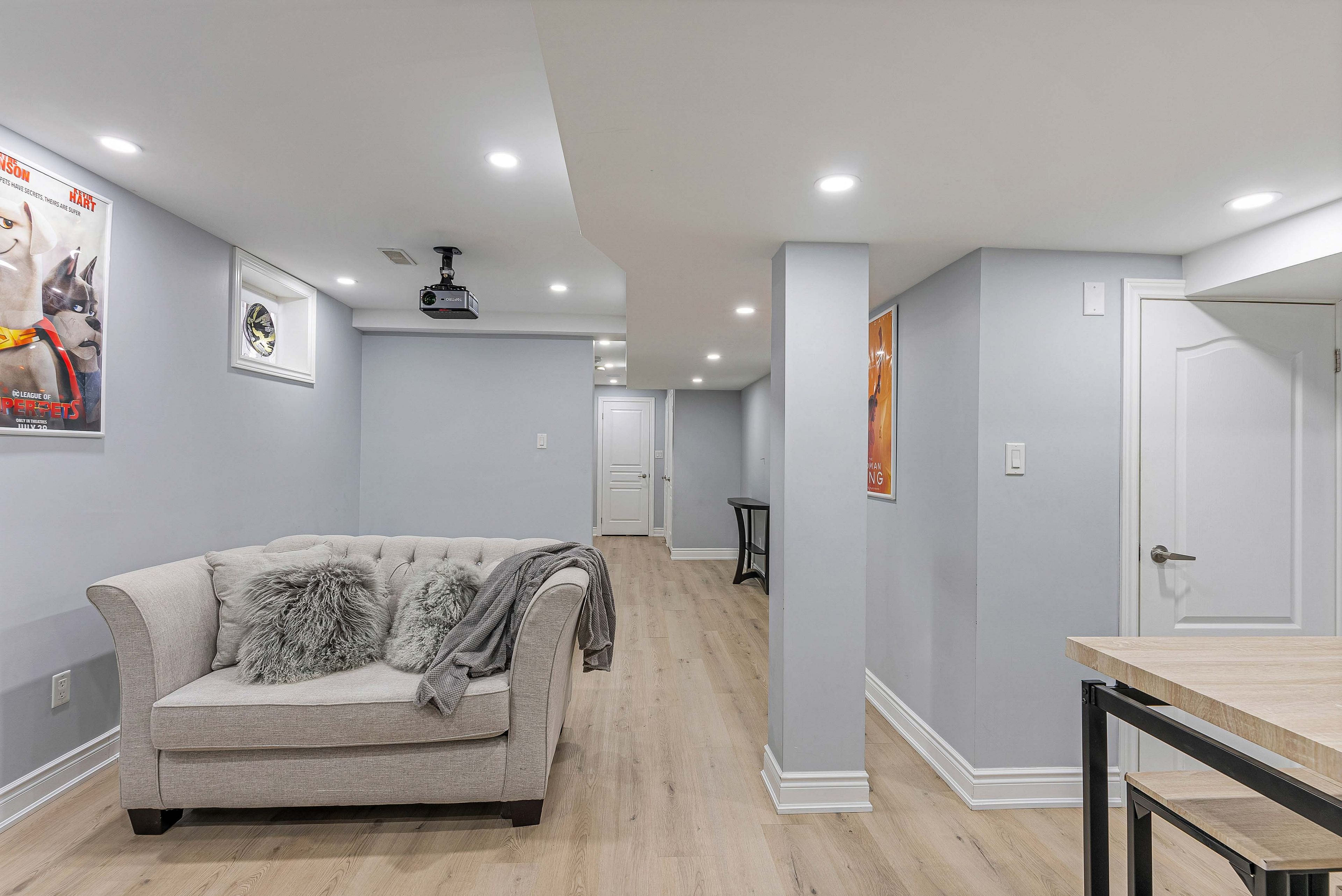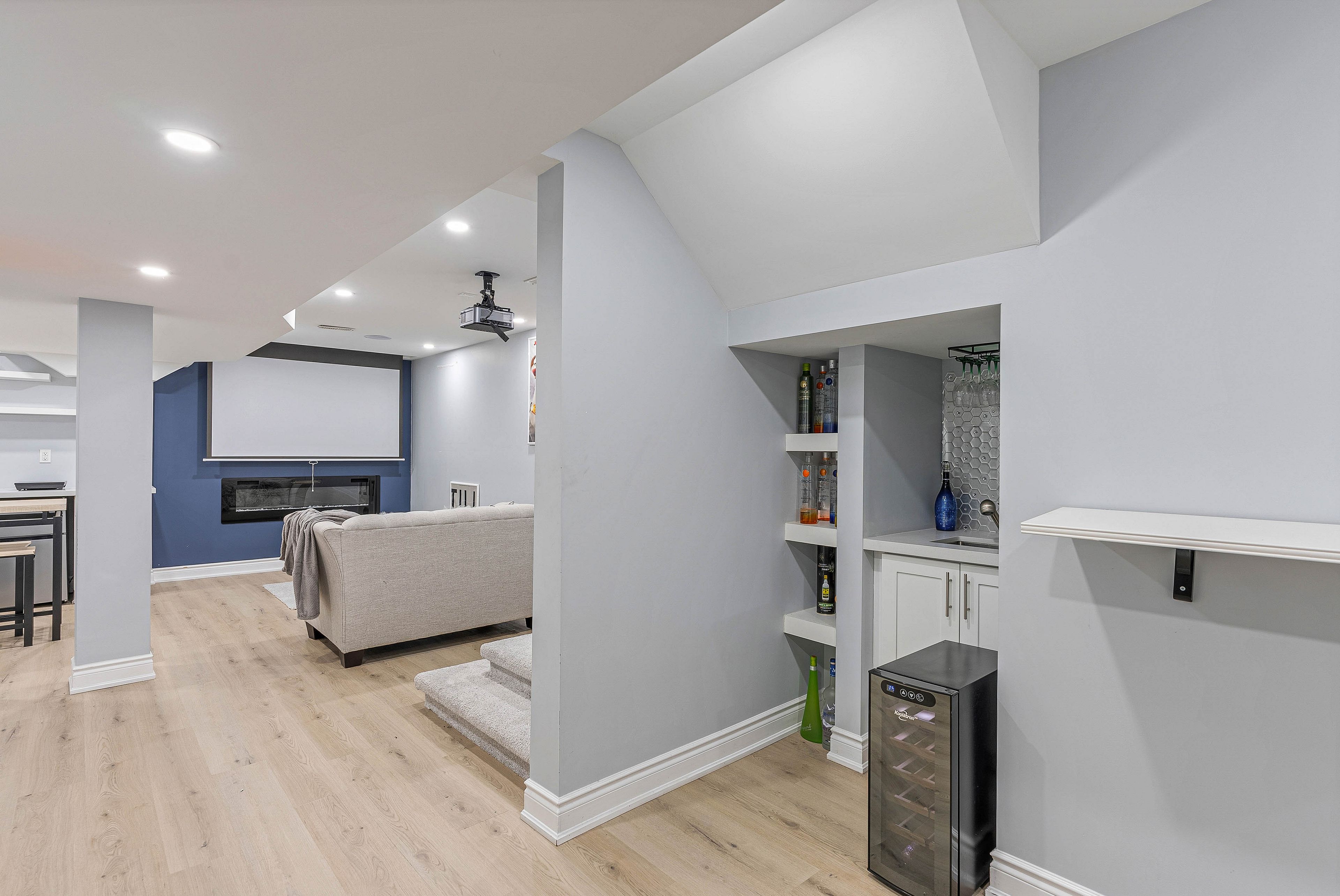 • Finished basement with extra bedroom, wet bar, and movie setup.