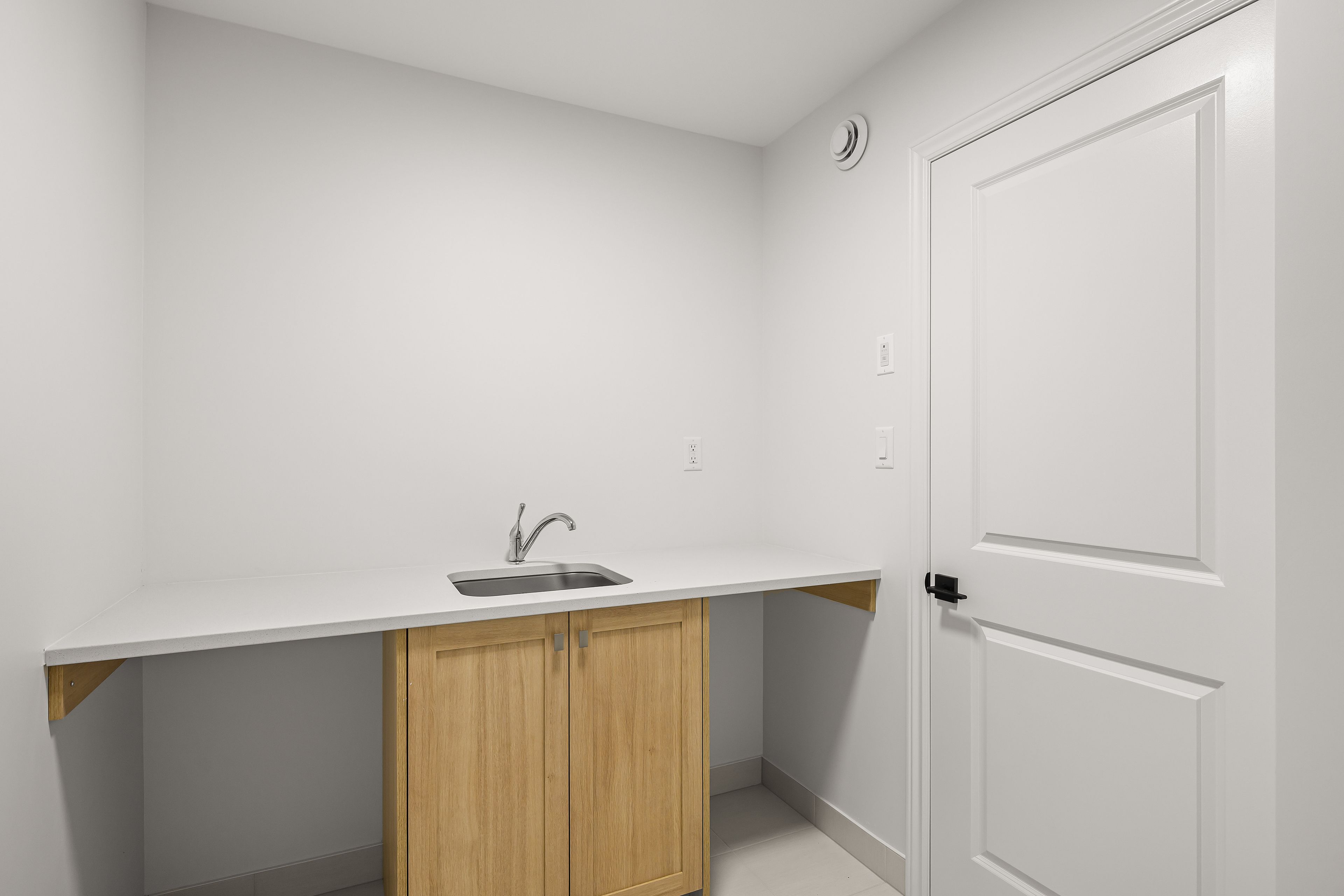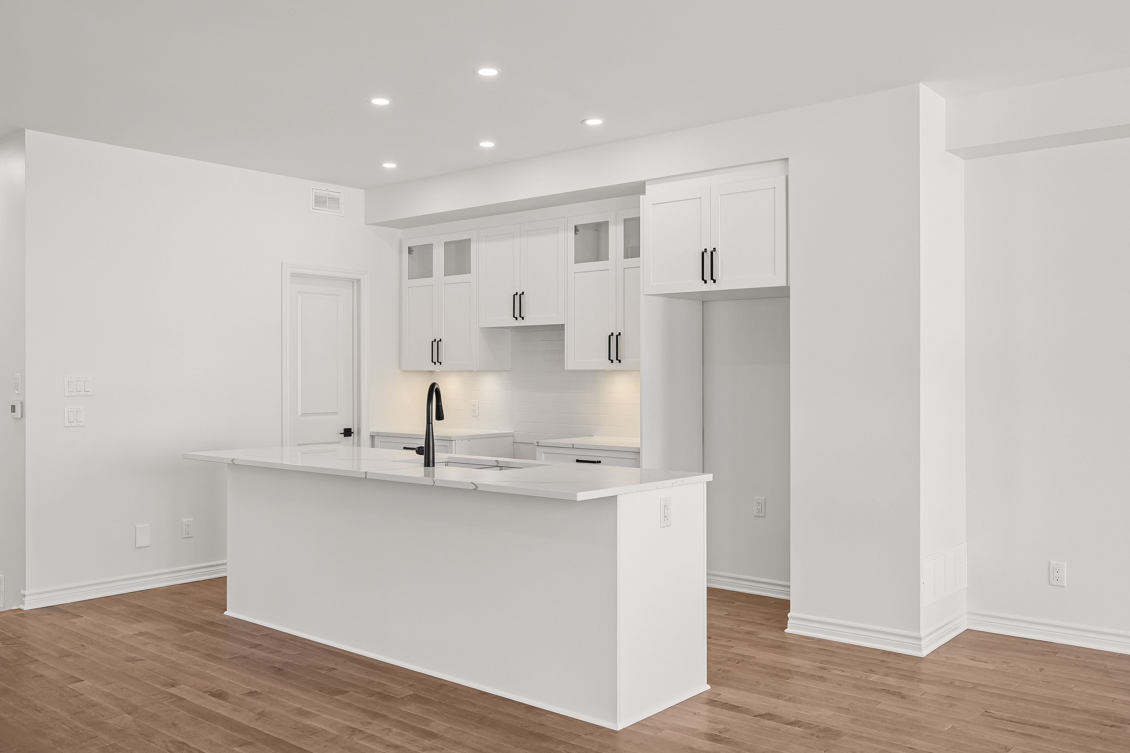 • Modern kitchen with quartz countertops and a walk-in pantry.
