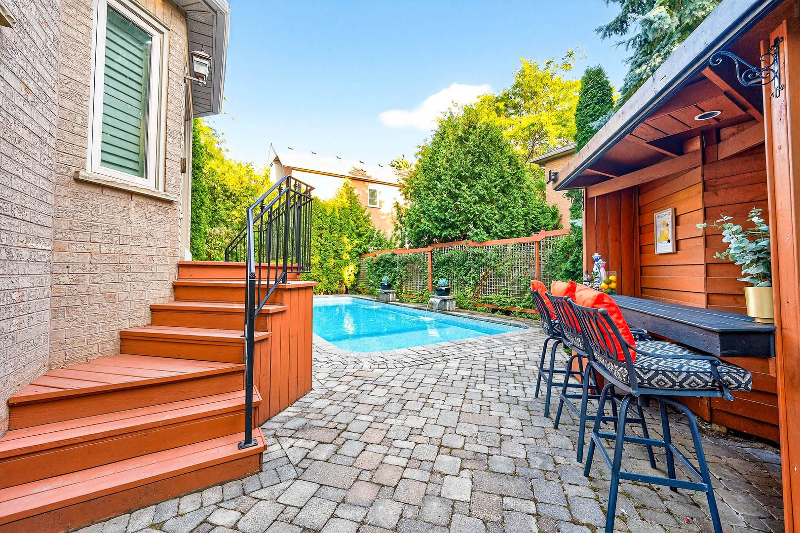 Welcome to your dream home! This spacious four-bedroom residence is perfectly situated on a highly sought after private court, offering tranquility and privacy. With a two-car garage, this meticulously maintained home boasts a stunning exterior and lush landscaping with a stunning pool and private backyard close to top private, public and catholic schools and all amenities. Step inside to find an inviting living space that flows seamlessly from room to room, highlighted by professionally painted walls in elegant benjamin moore designer colors. The open-concept layout is perfect for both entertaining and everyday living. There are too many upgrades to list, but the new windows, new furnace/ac (2025),gourmet bosch fridge (2025), dishwasher (2024), pool liner and filter (2024)built in indoor/outdoor speakers, bullfrog spa, custom walk in cedar closet, california shutters, central vac, custom california closets, security cameras, sprinkler system and waterfalls, oak inlay floors are notable. The kitchen is a chef's delight, featuring modern appliances and ample stone counter space with a walkout overlooking the beautiful backyard. Each of the four bedrooms is generously sized, providing comfort and space for family or guests. The finished basement, complete with a separate entrance, offers endless possibilities whether as a guest suite, home office, fourth bedroom or entertainment area and an additional cozy den with cathedral ceiling and updated gas fireplace greets you on the second floor. Step outside to your own private retreat where a sparkling pool and hot tub await, surrounded by a spacious patio with a covered bar area ideal for outdoor gatherings and relaxation. Dont miss out on the opportunity to make this beautifully maintained home yours. Schedule your private showing today!