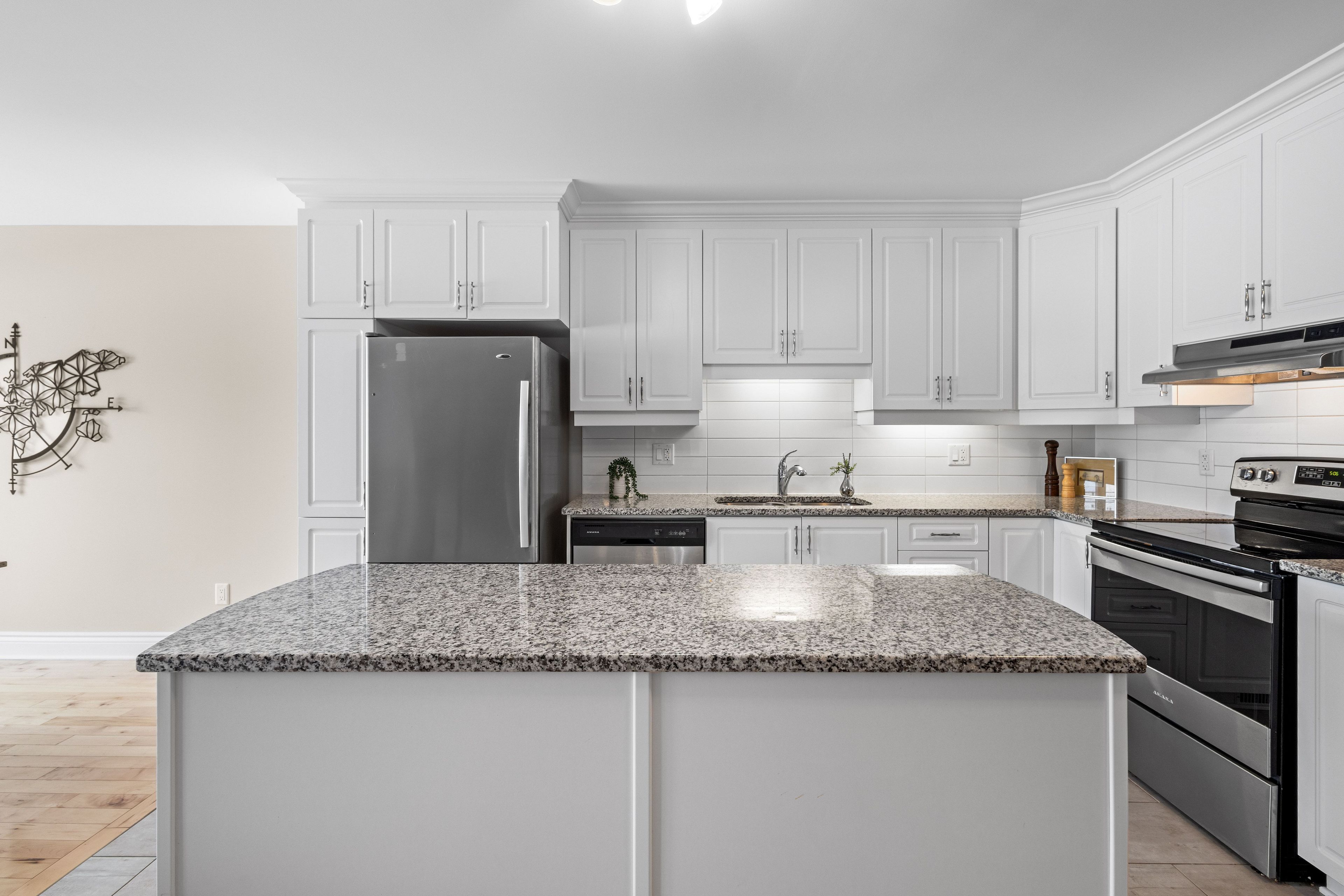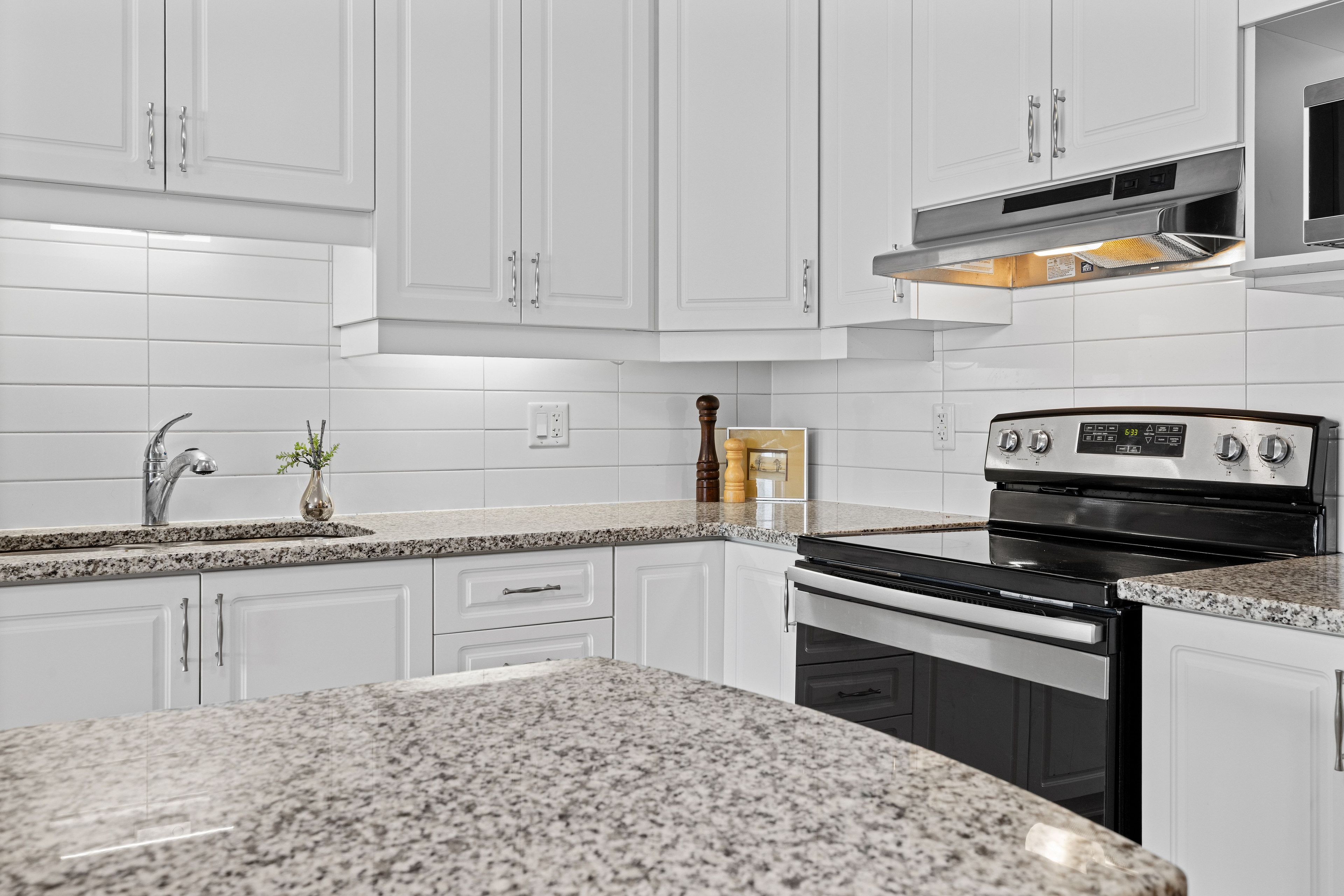 • Elegant kitchen featuring granite countertops and included appliances.