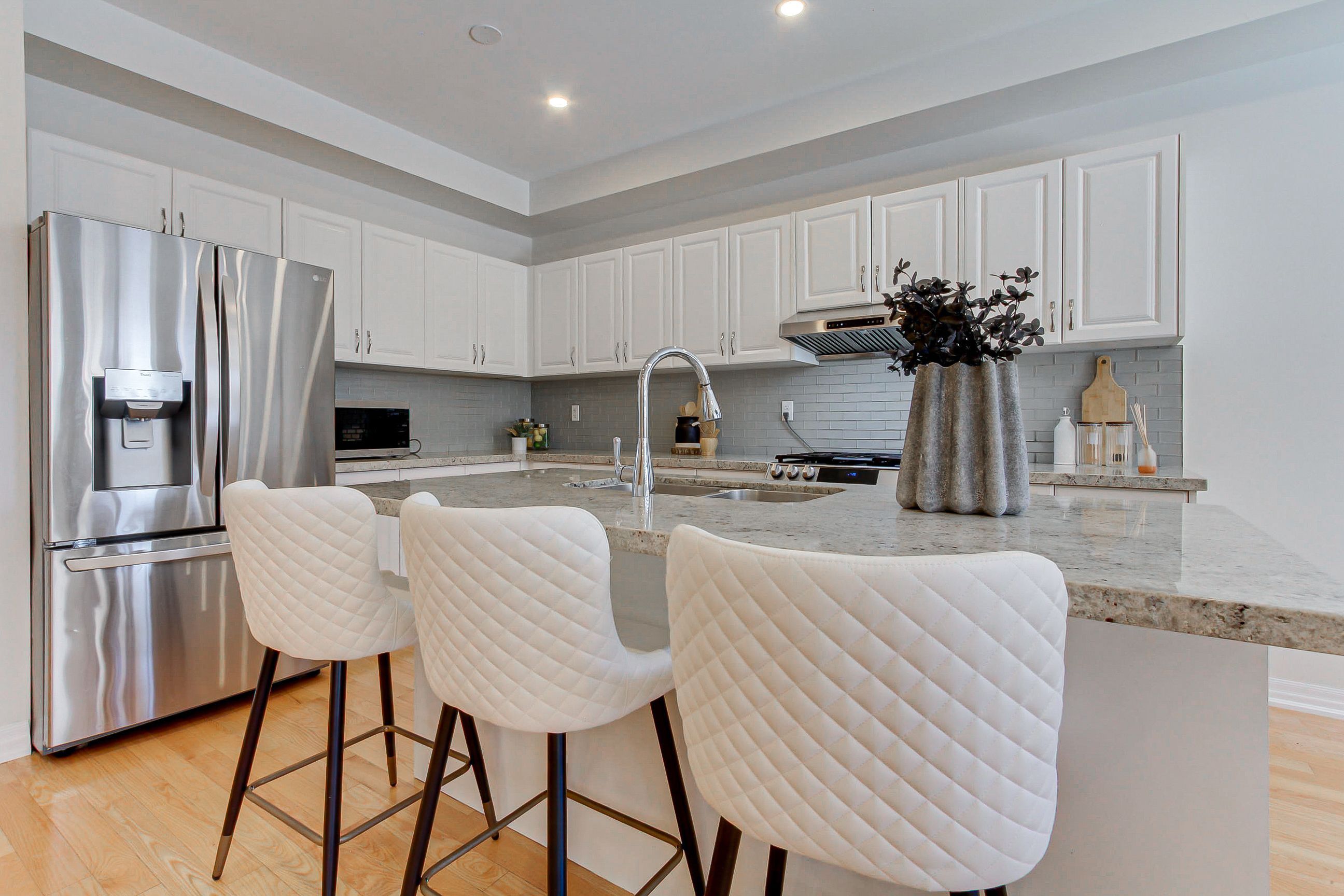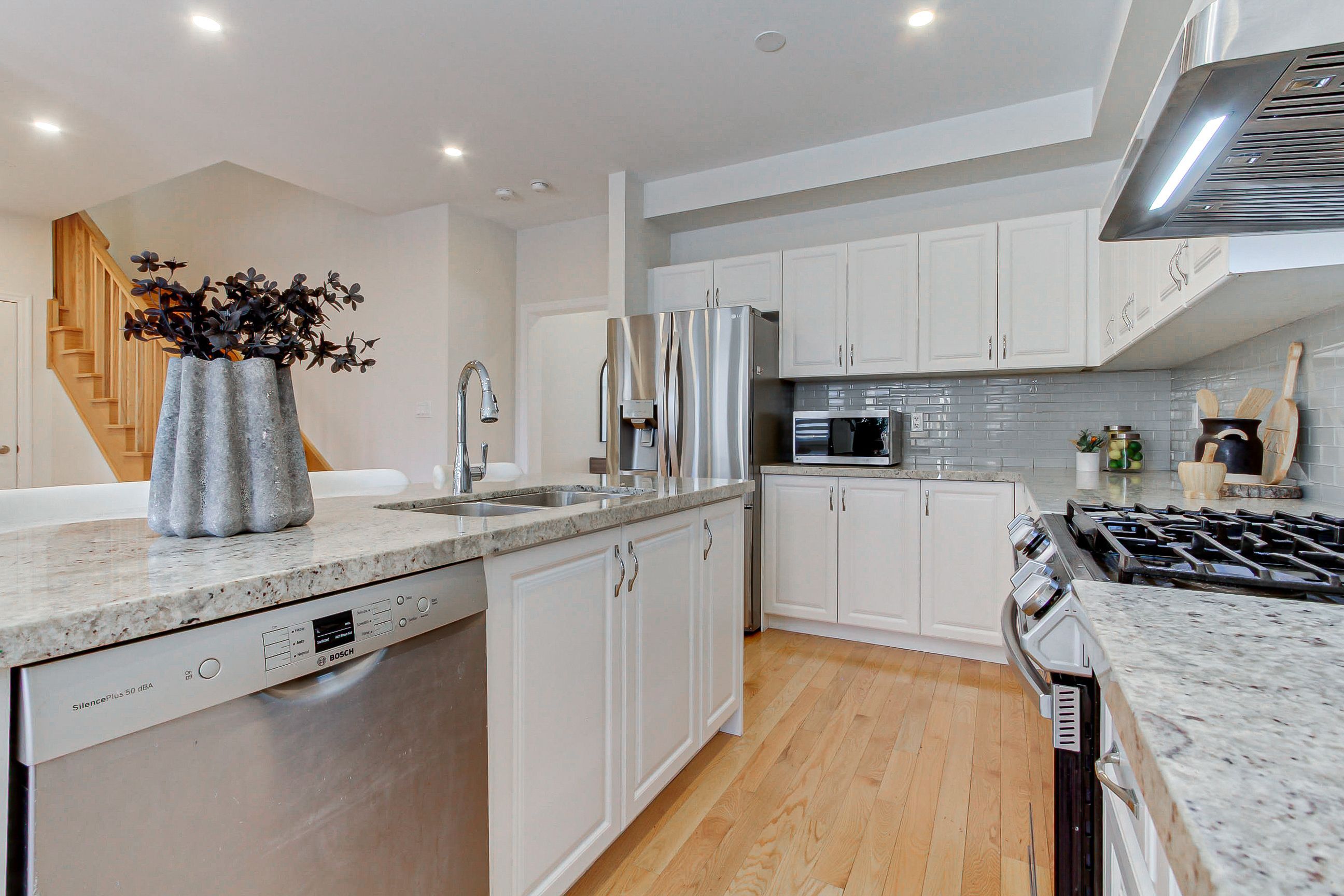 • Spacious eat-in kitchen with abundant cabinetry and large center island.