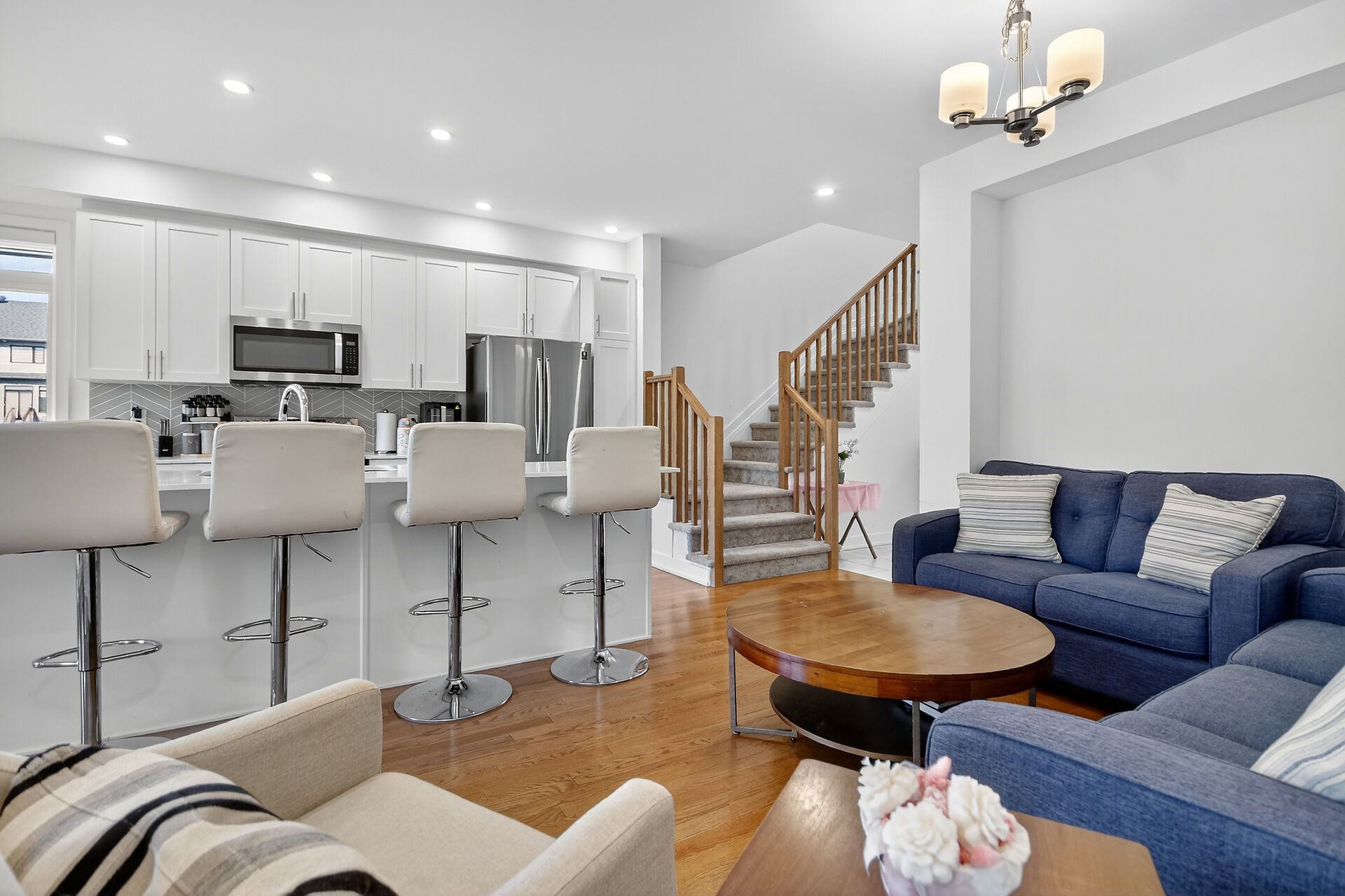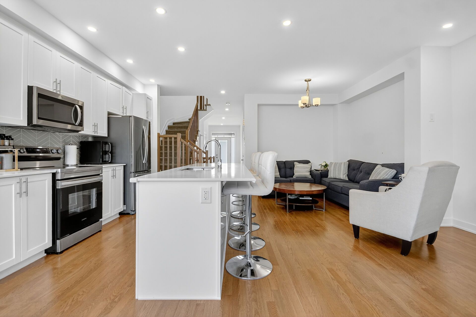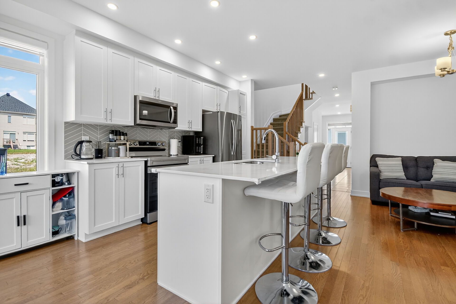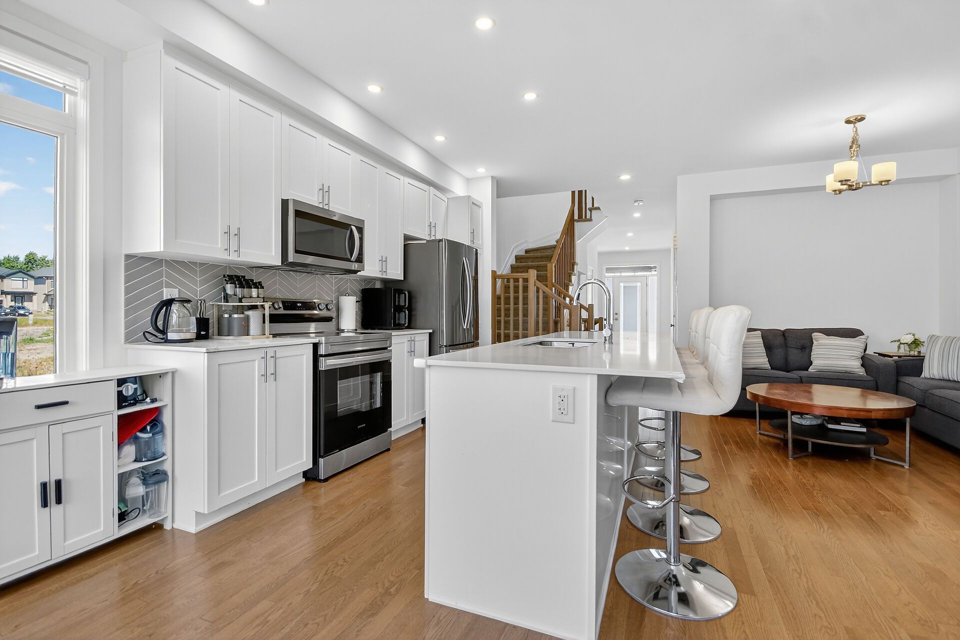 • Stylish open-concept main floor with hardwood floors and quartz countertops.