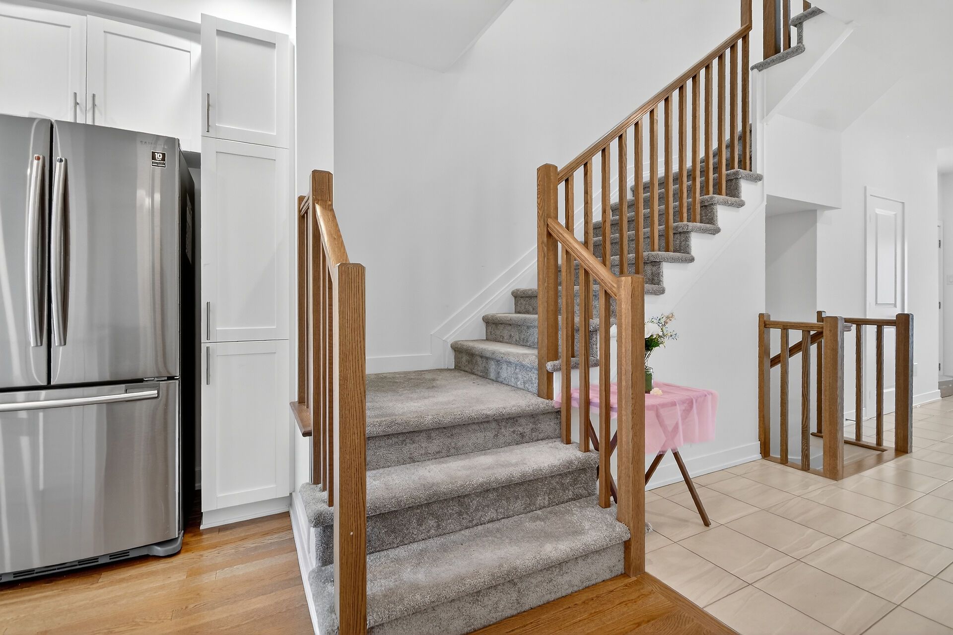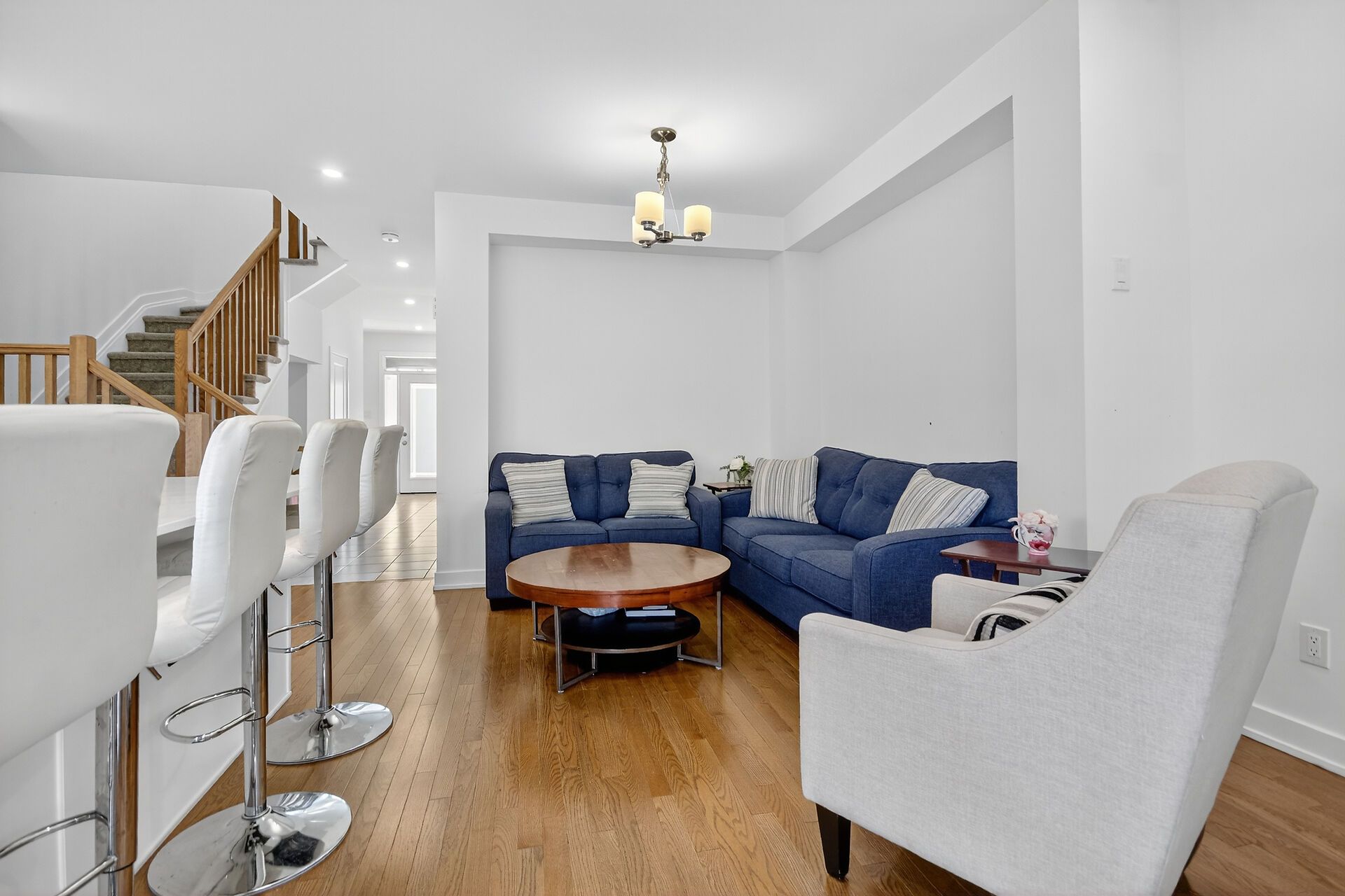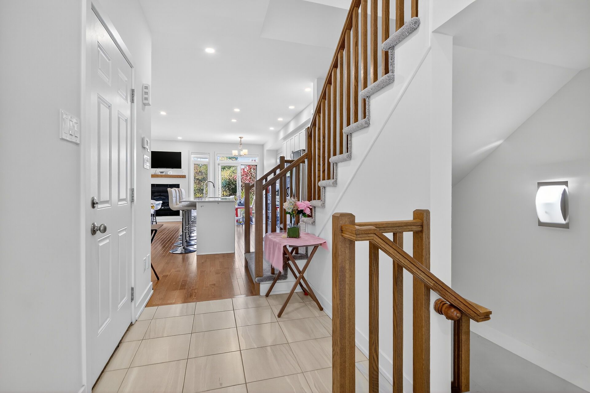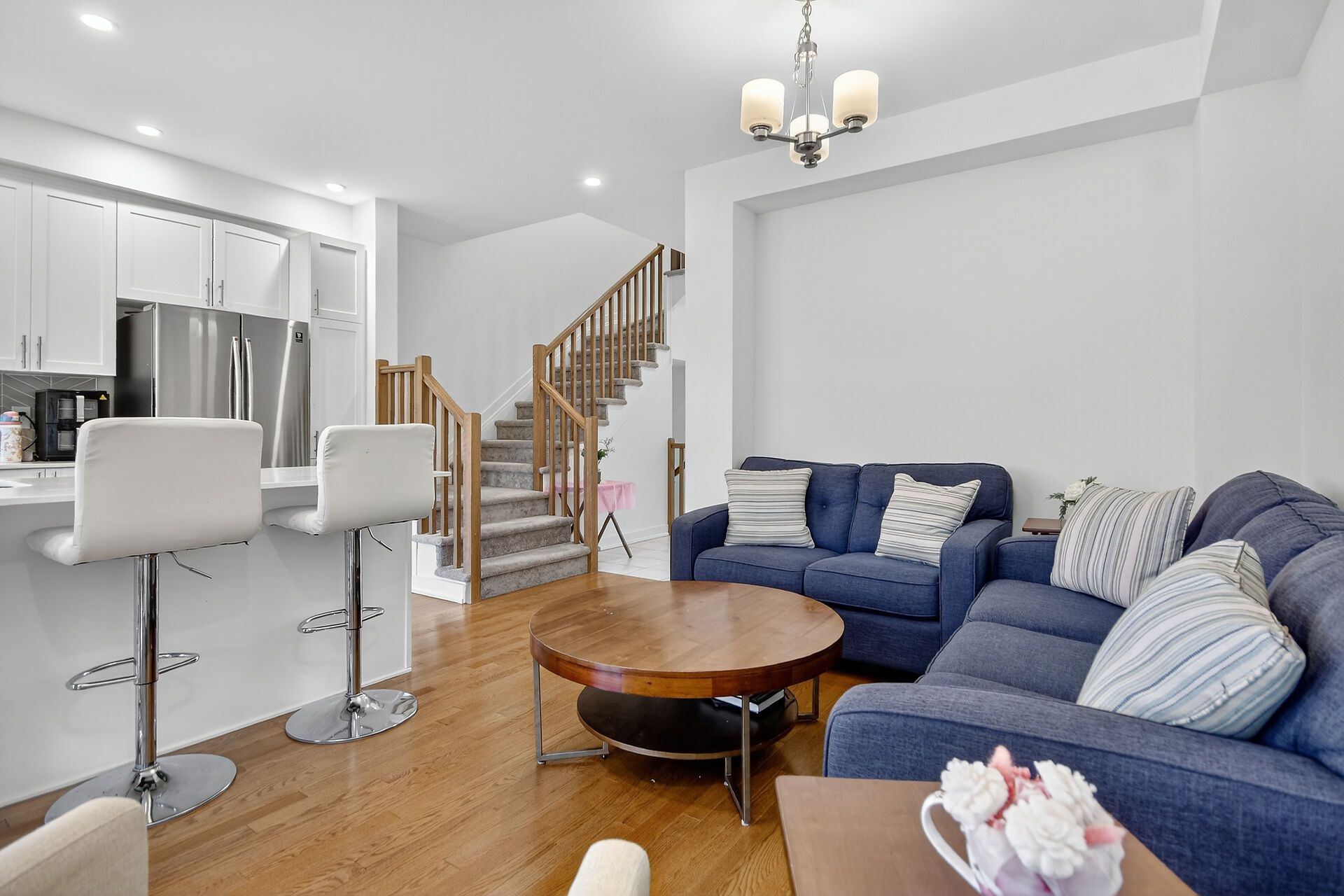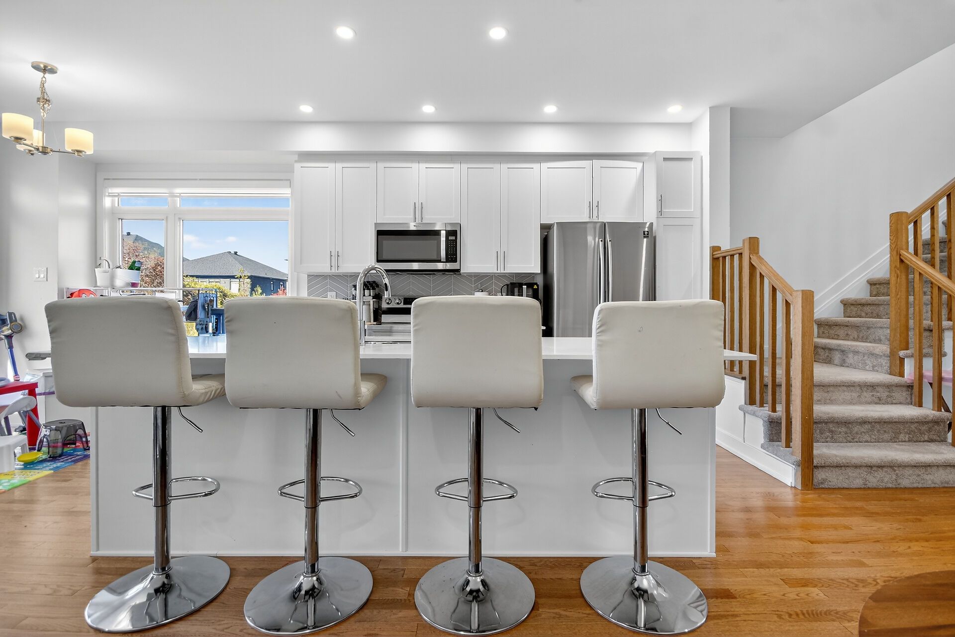 • Stylish open-concept main floor with hardwood floors and quartz countertops.