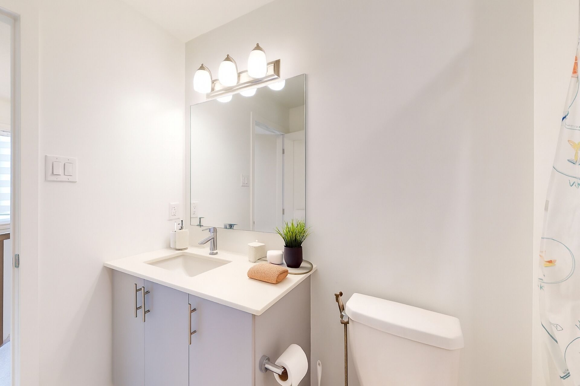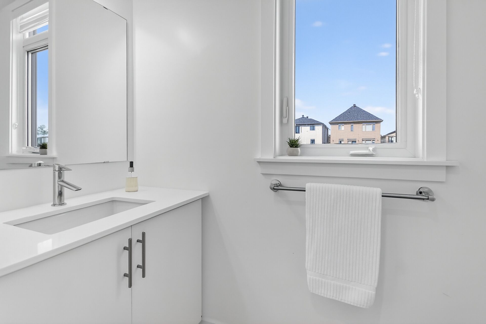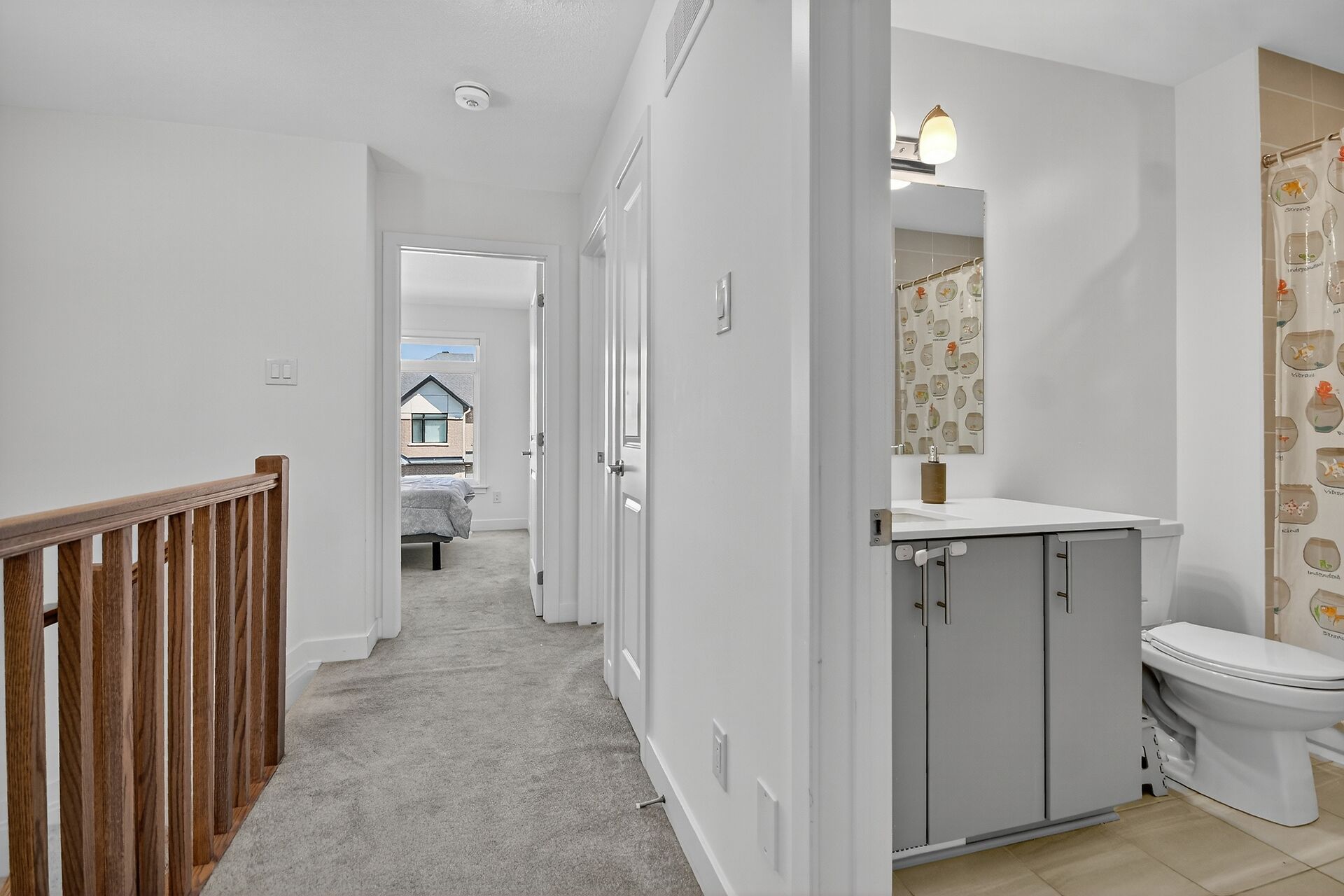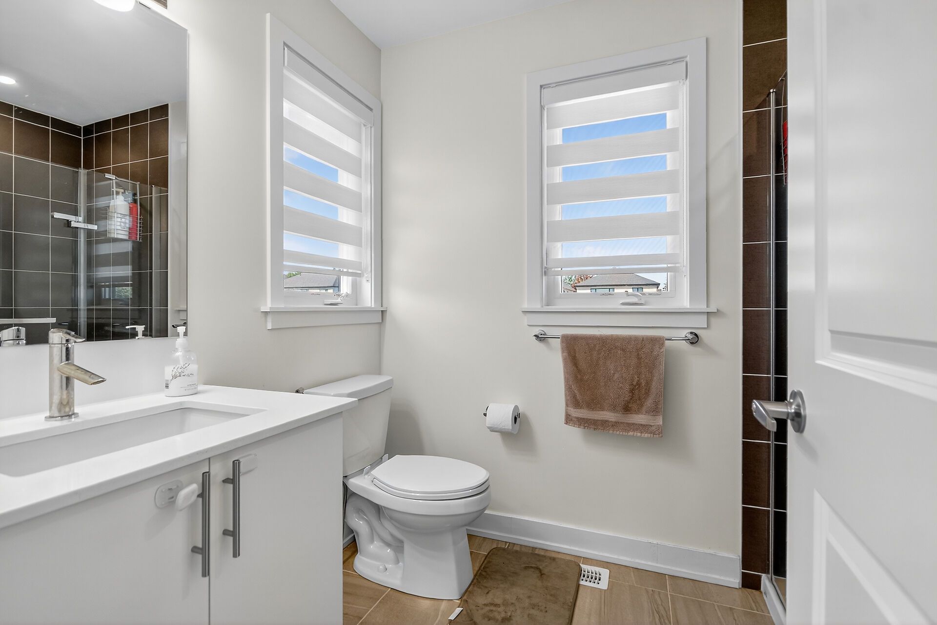 • Stylish open-concept main floor with hardwood floors and quartz countertops.