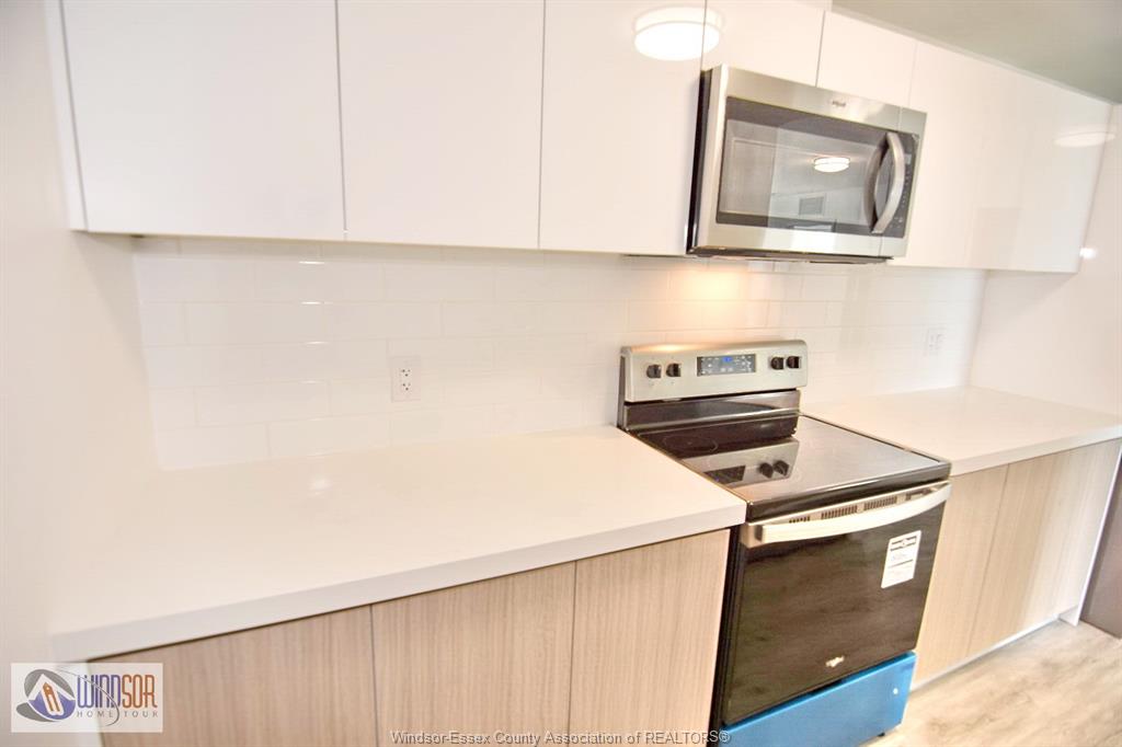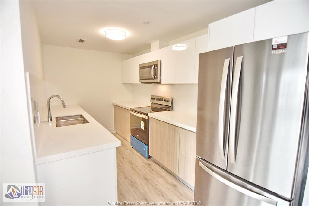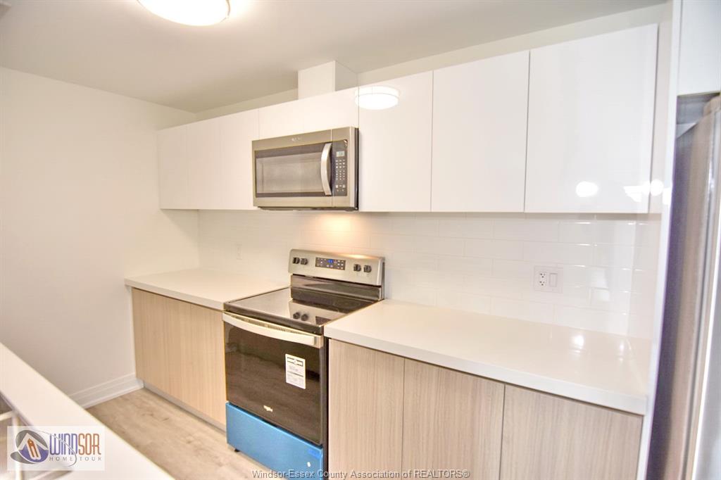 • Spacious kitchen with modern finishes and open concept living area.