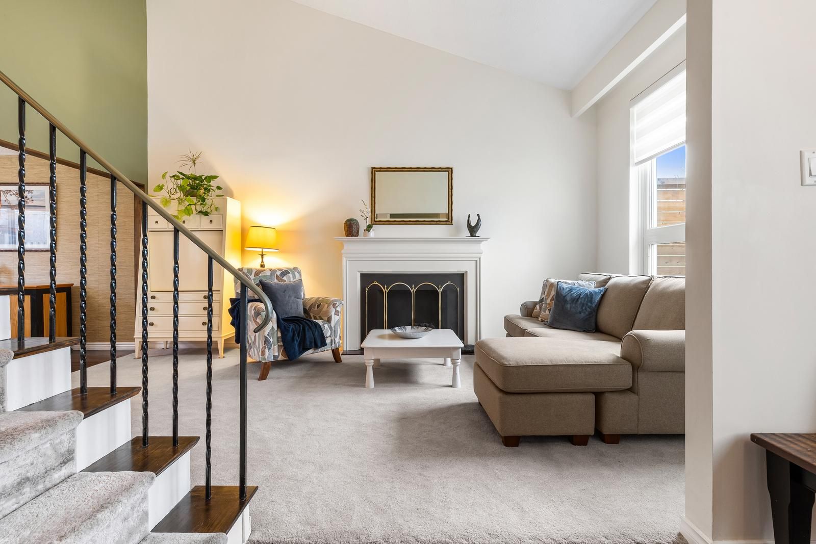 • Bright living room with vaulted ceilings, creating a spacious vibe.
