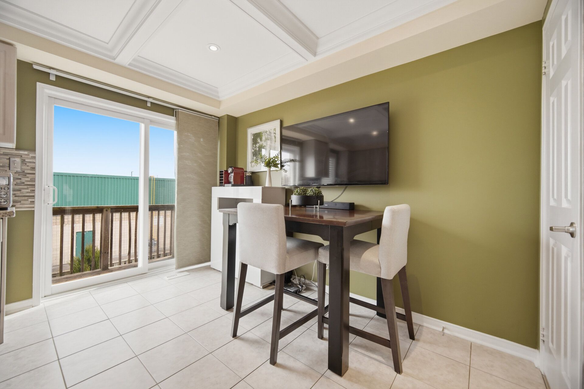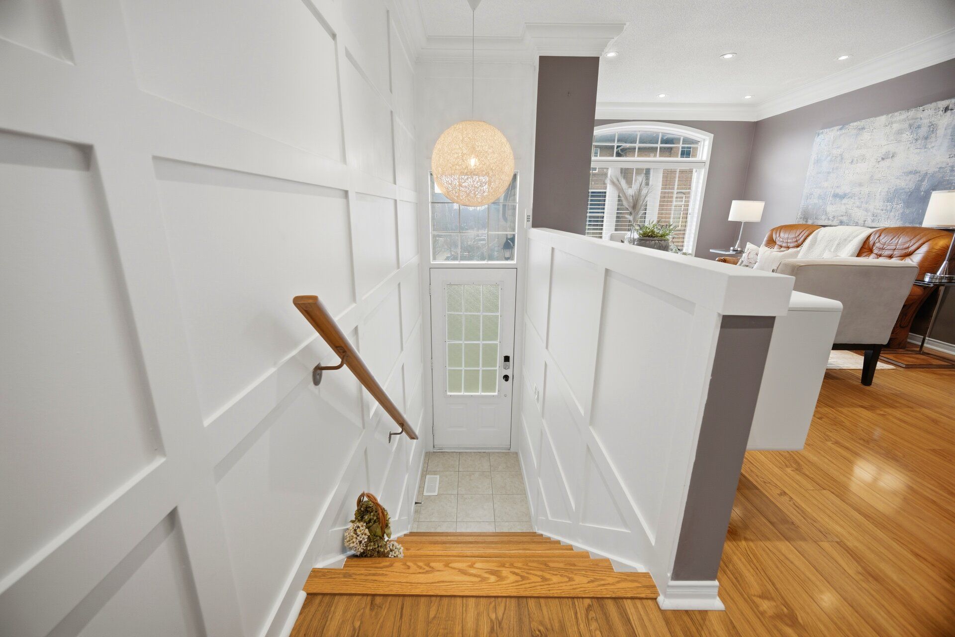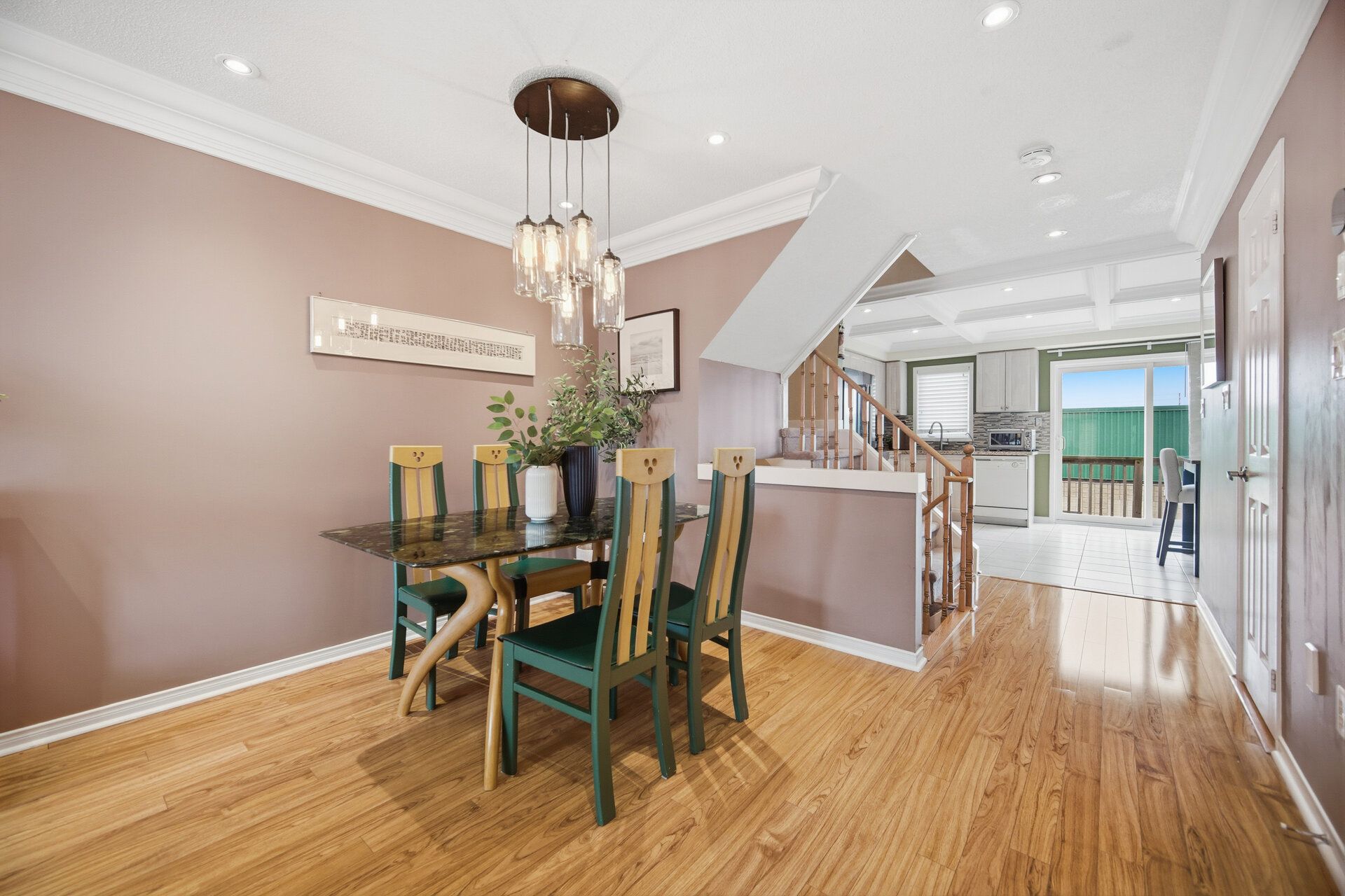 Beautifully maintained and filled with natural light, this southeast-facing townhome offers a warm, inviting atmosphere and a layout that feels both functional and easy to live in. From the moment you step inside, the foyer sets the tone with its dramatic 13-foot ceiling, panelled walls, pot lights, and statement chandelier. The main level is bright and welcoming, with an open-concept living and dining area featuring laminate floors, crown moulding, and a striking palladium window that draws in the light. It is a space that feels comfortable for everyday living and polished enough for entertaining. The updated kitchen and breakfast area blend style and practicality with a coffered ceiling with pot lights, stainless steel appliances, and a walkout to the balcony. A main floor powder room adds extra convenience and is finished with a pedestal sink, and pot lights. Upstairs, the primary bedroom offers a comfortable retreat with pot lights, a window seat, walk-in closet, and a private 3-piece ensuite with granite counters. Two additional bedrooms provide flexible space for family, guests, or a home office, each with generous closet space and large windows. The main bathroom is spacious and well finished with granite counters, ceramic floors, and pot lights. The ground level adds valuable living space with a bright family room featuring laminate flooring, and a walkout to the large deck and fully fenced yard with mature landscaping and a small shed. Interior garage access, a double coat closet, and generous storage add to the home's practical appeal. Located close to visitor parking and near a park, and set close to top-rated schools, erin mills town centre, churchill meadows community centre, skatepark, meadowvale tennis club, credit valley hospital, major highways, and streetsville and meadowvale go stations. This home offers the kind of everyday convenience buyers appreciate.
