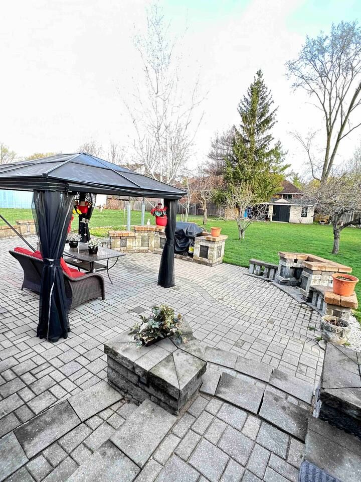 • Fully fenced yard featuring interlock stonework and irrigation system.