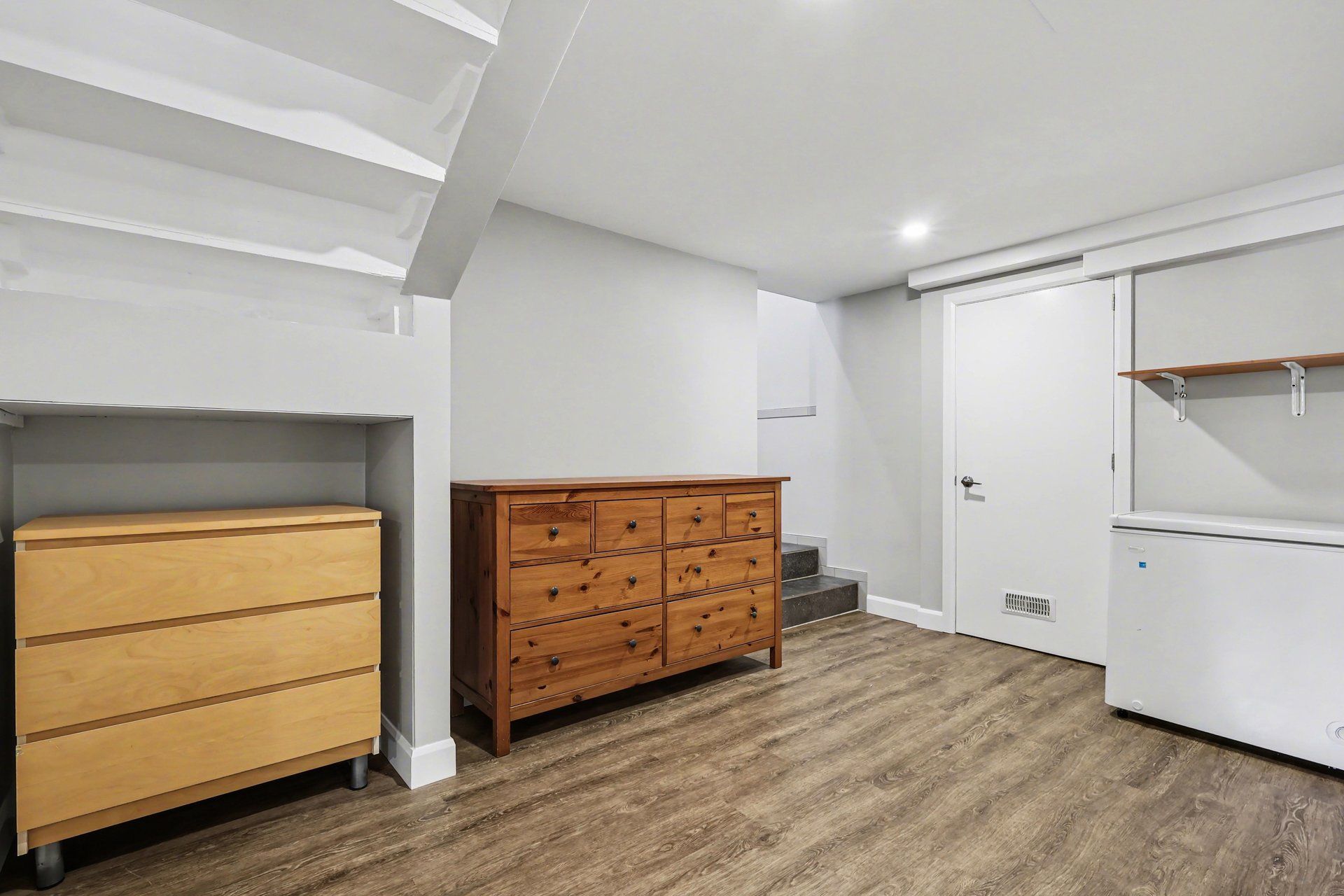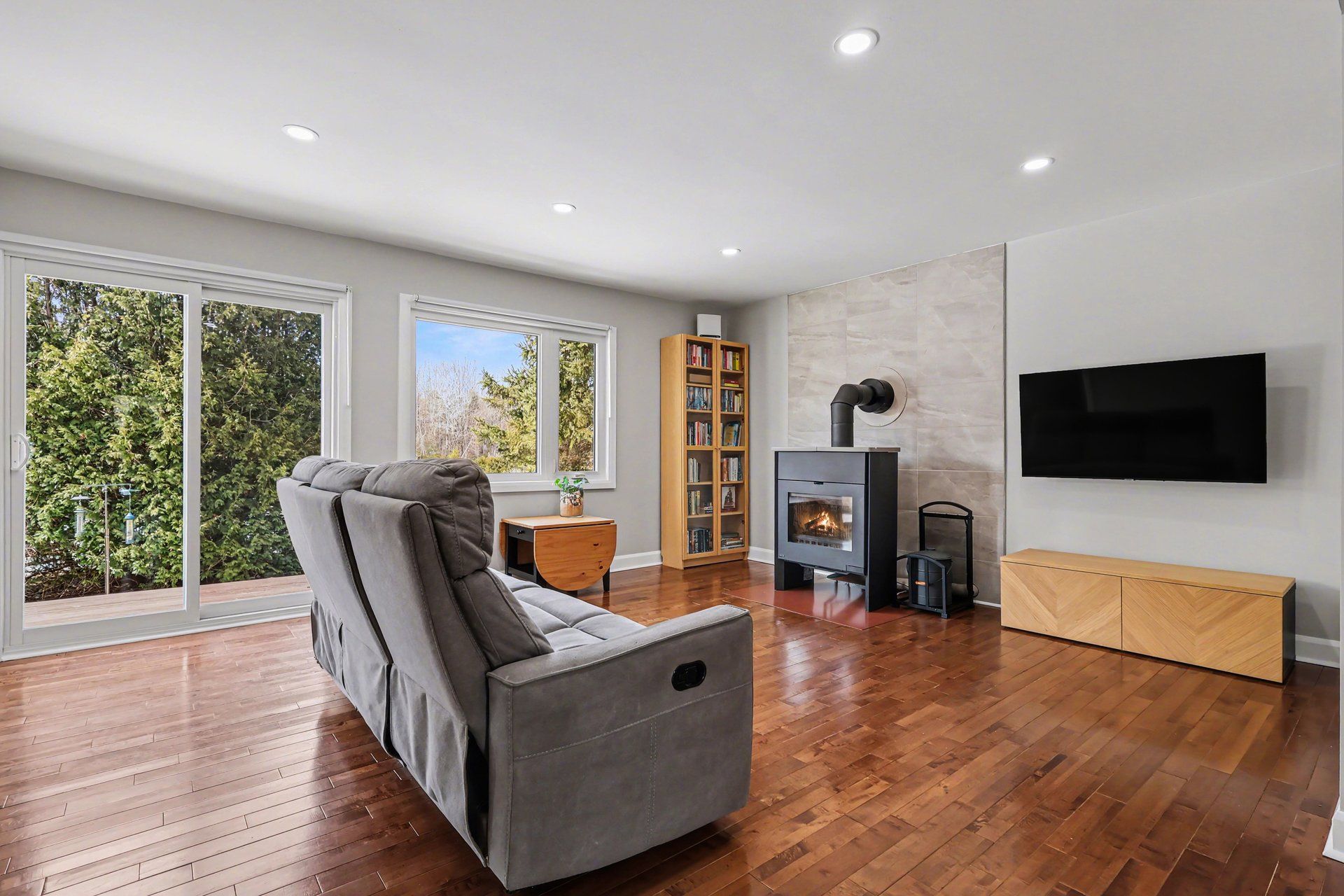• Cozy living room with a wood stove for warmth and efficiency.