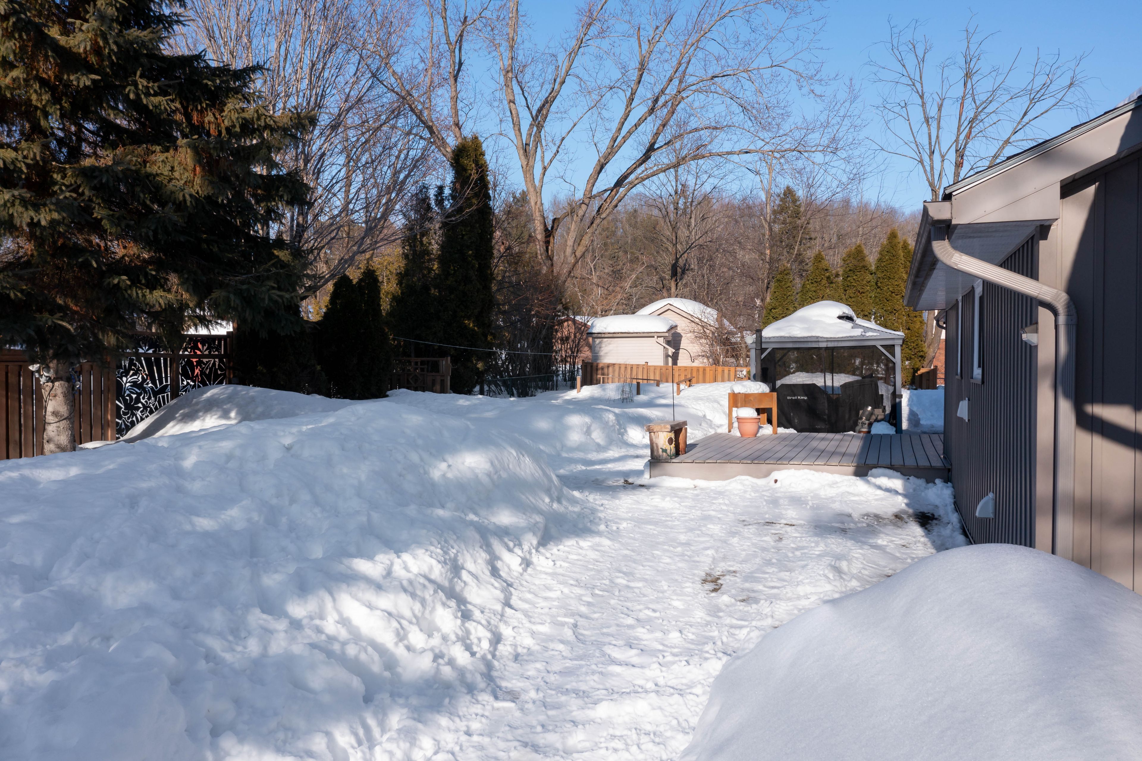 • Fully fenced backyard features a decorative waterfall and garden.