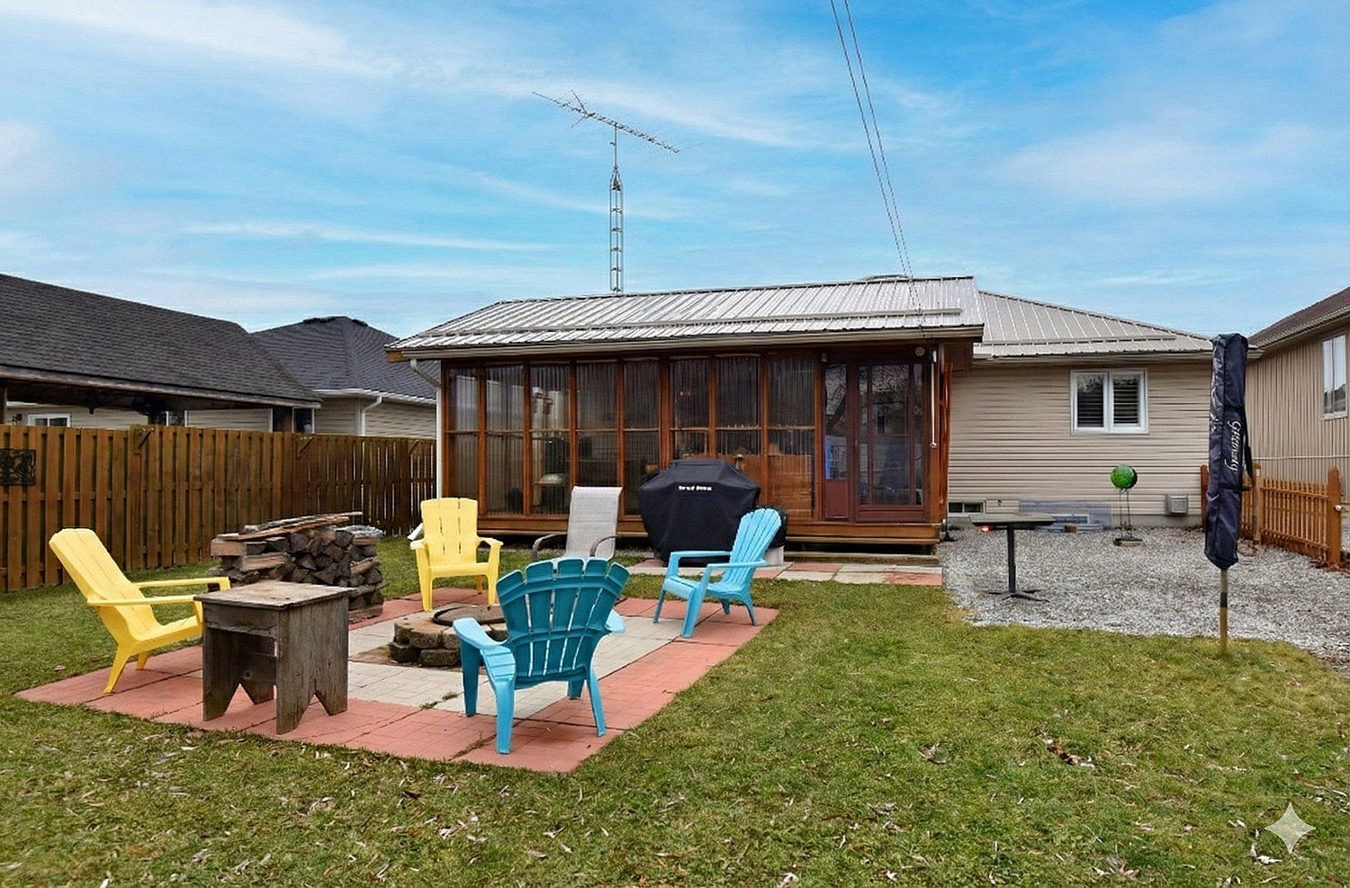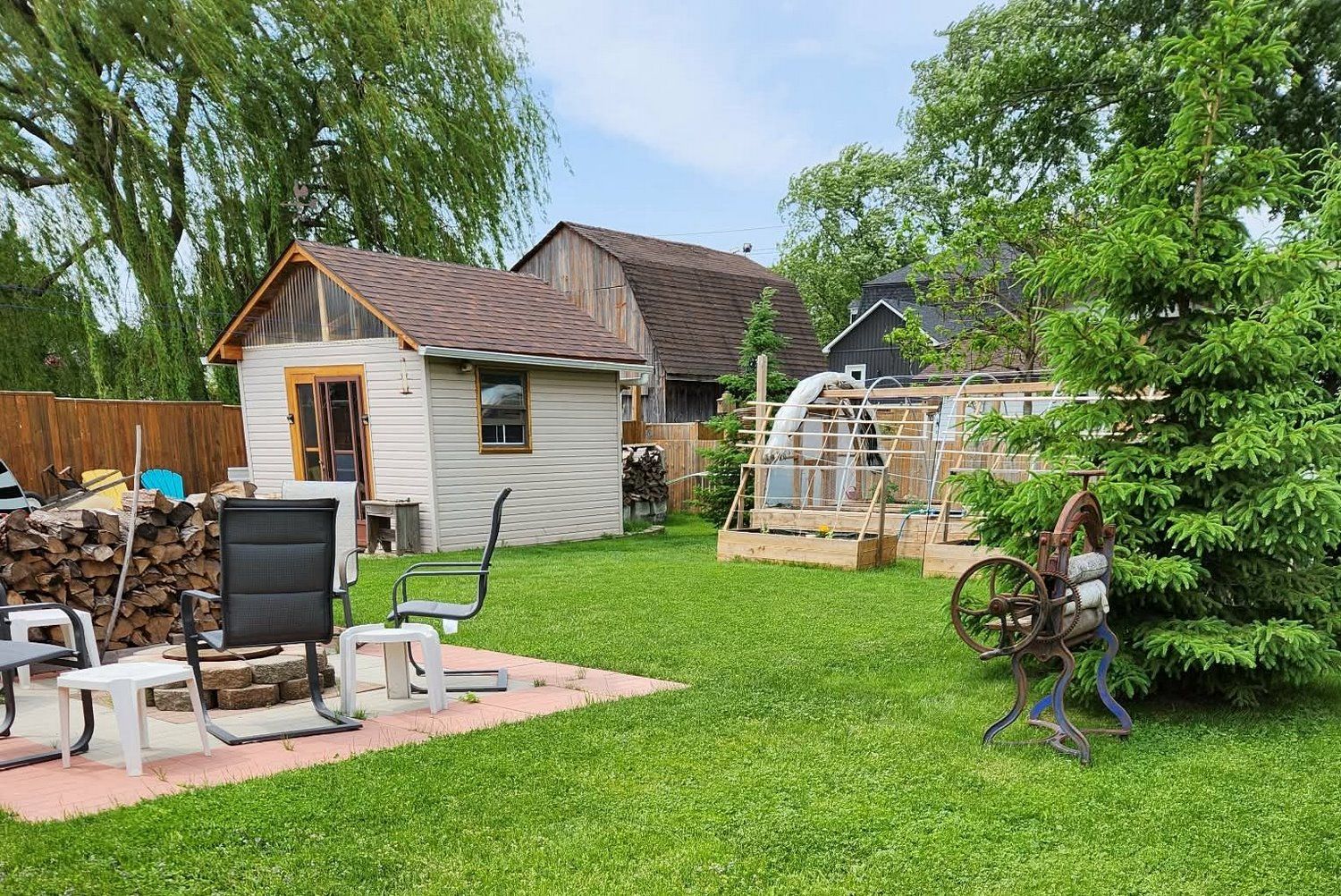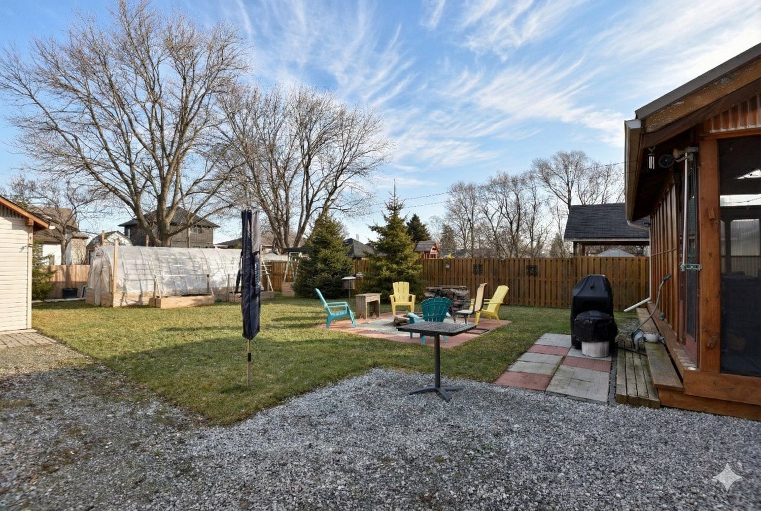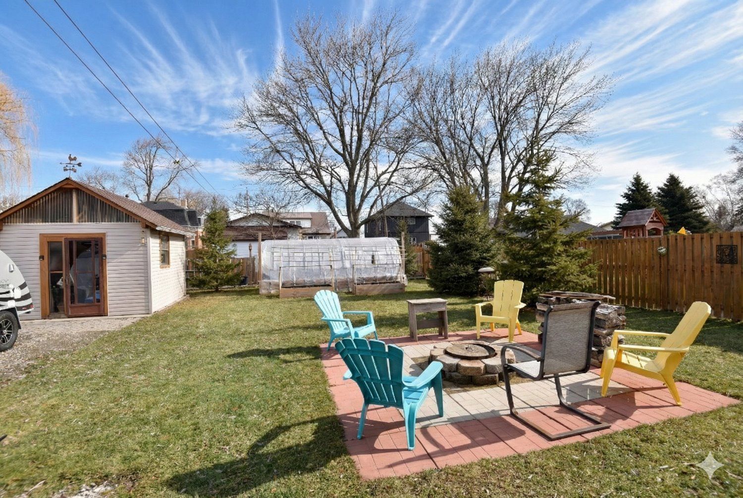 • Huge fenced backyard featuring a fire pit and greenhouse.