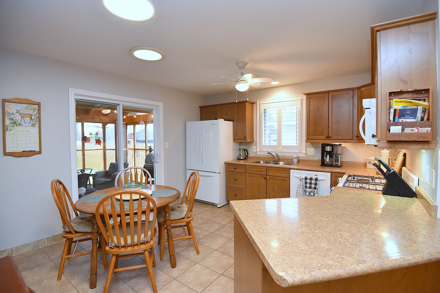 Beautiful bungalow in a quiet family-friendly neighbourhood. Small town living with amazing community spirit. This open concept home features a bonus three-season sunroom and a huge fully fenced backyard complete with a fire pit, green house & large shed. Offering 2 + 1 bedrooms & 2 1/2 baths, this layout is ideal for a wide range of buyers, including, downsizing, first-time buyers or multi-generational living. The professionally-finished basement includes a full kitchen and a separate, apartment-like living space, perfect for adult kids or aging parents. Quality updates incl: 50yr metal roof(2021), bamboo flooring, napolean gas frpl, basement has egress window for safety.