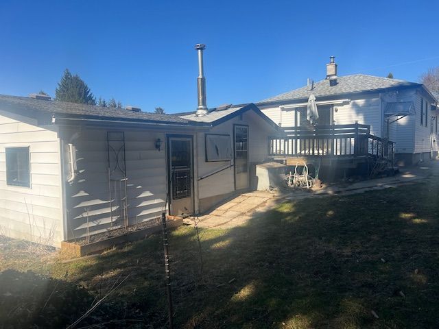 • Expansive backyard with mature trees and a raised deck.