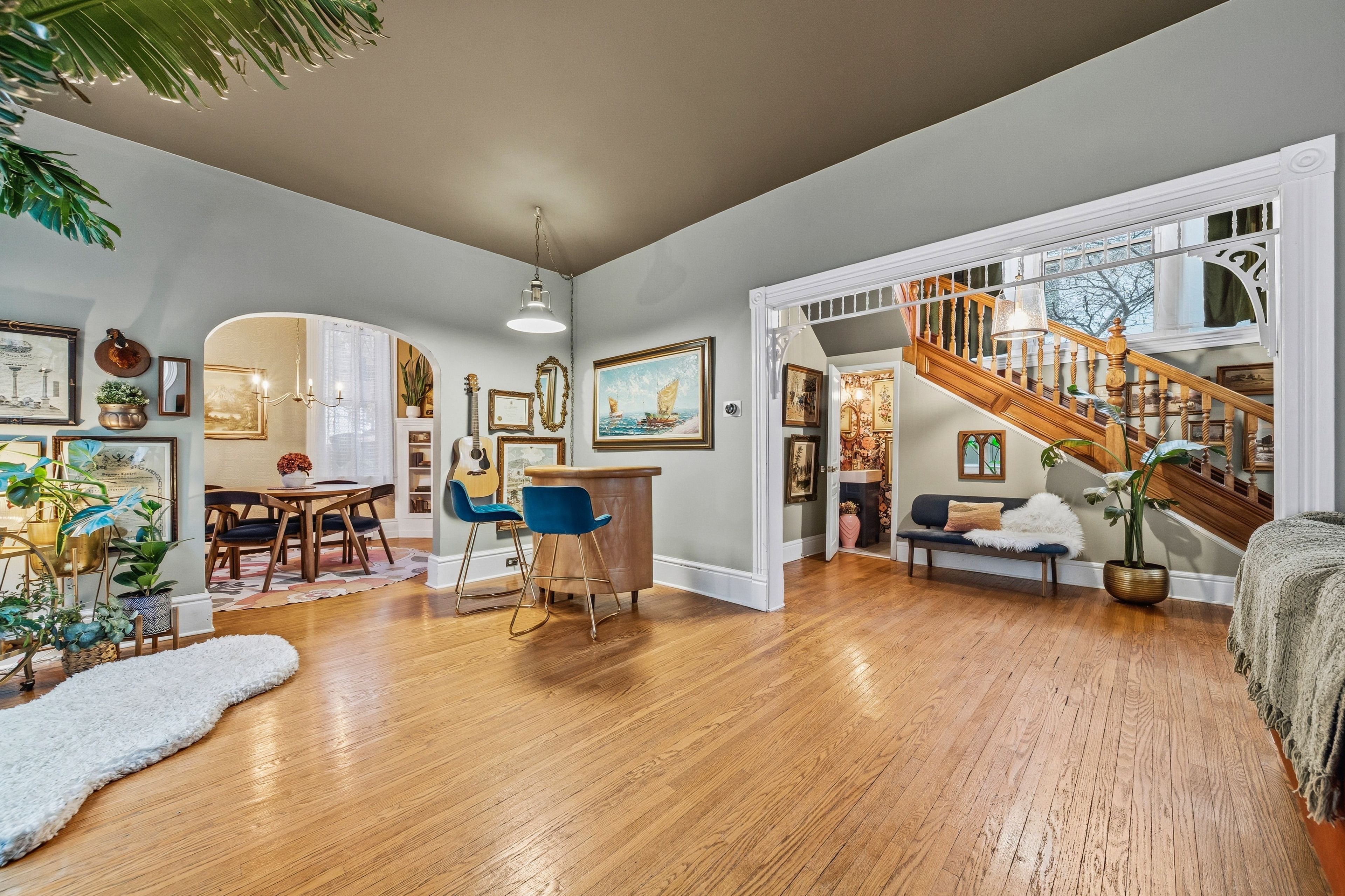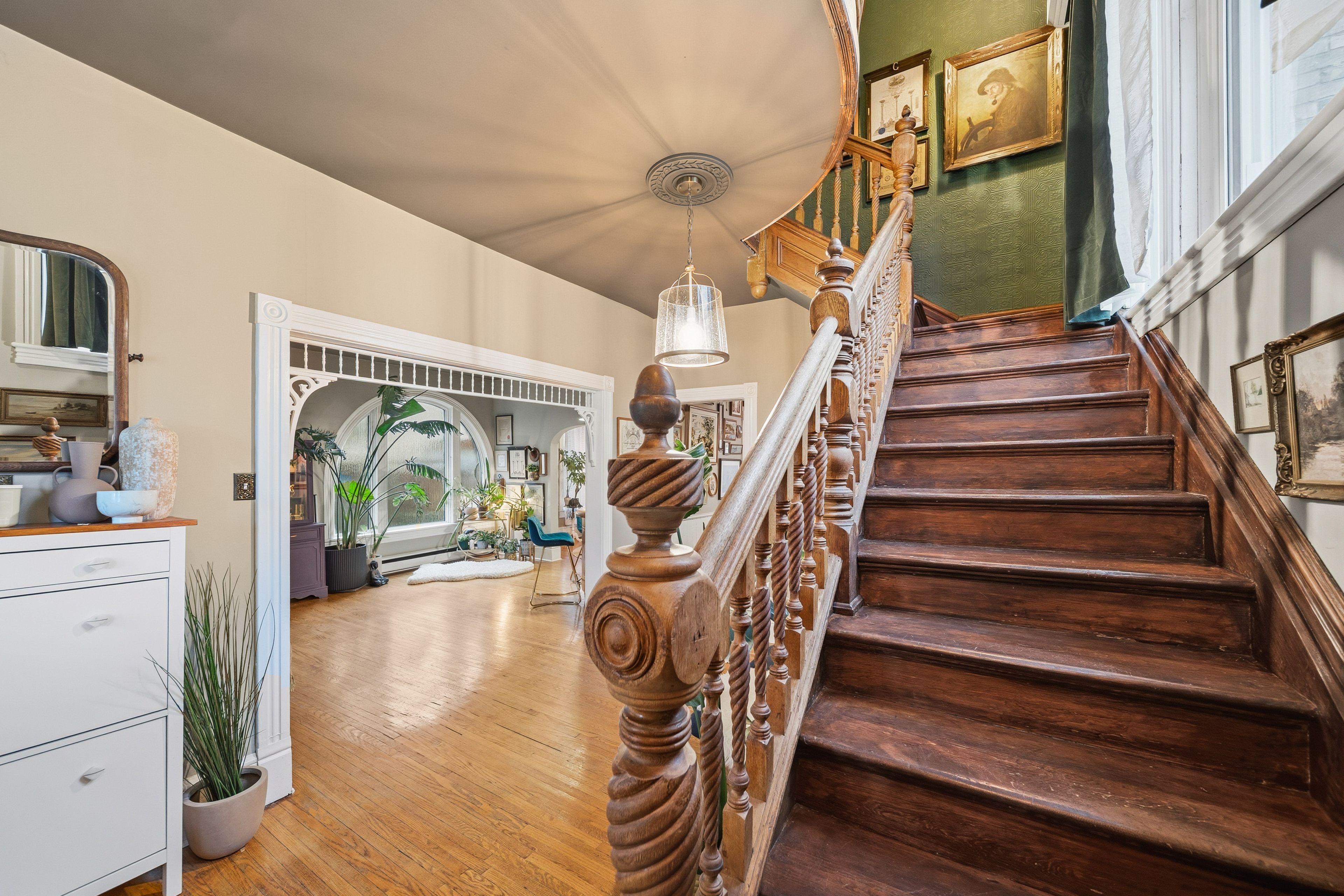 • Grand staircase, original woodwork, and large windows create a unique atmosphere.