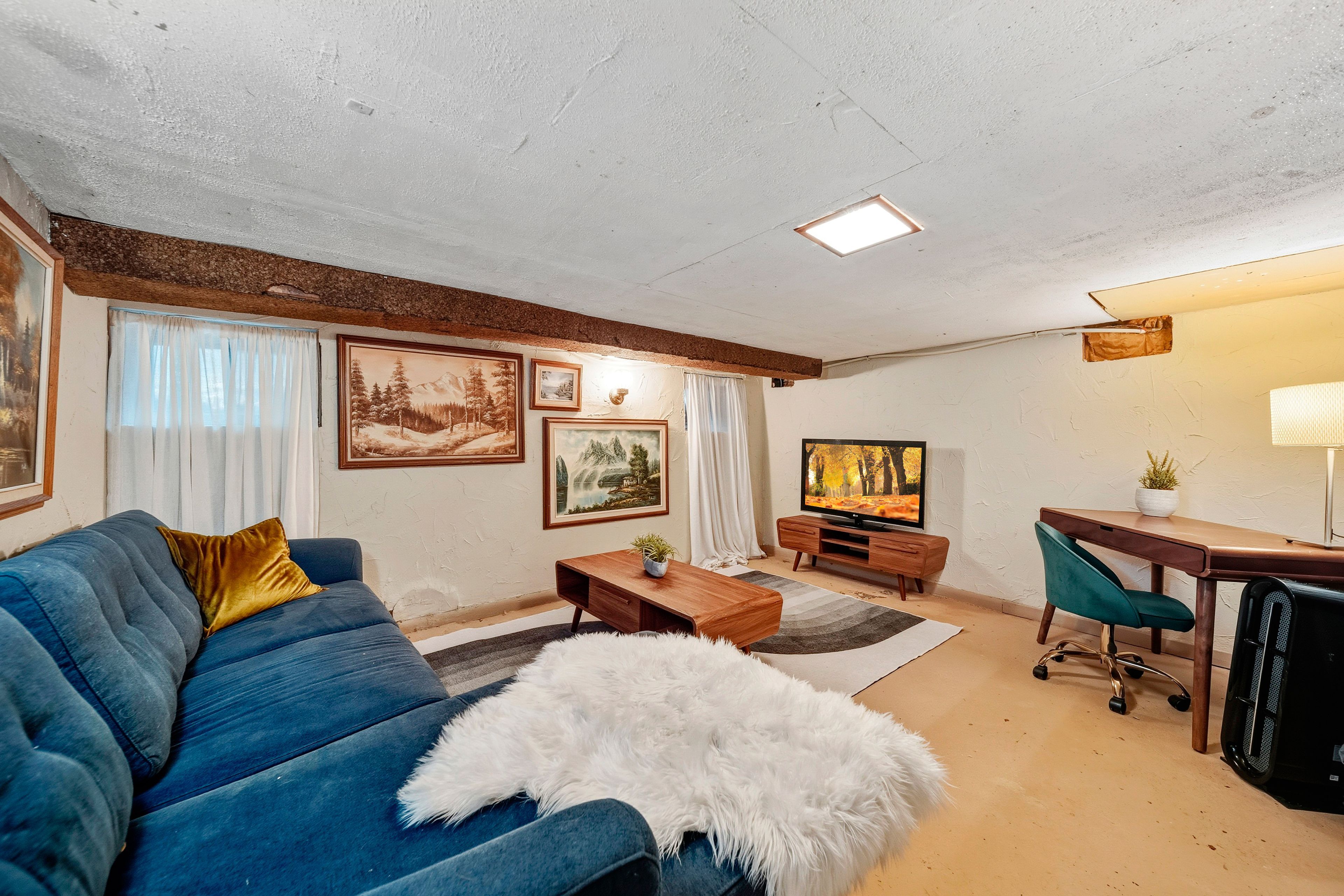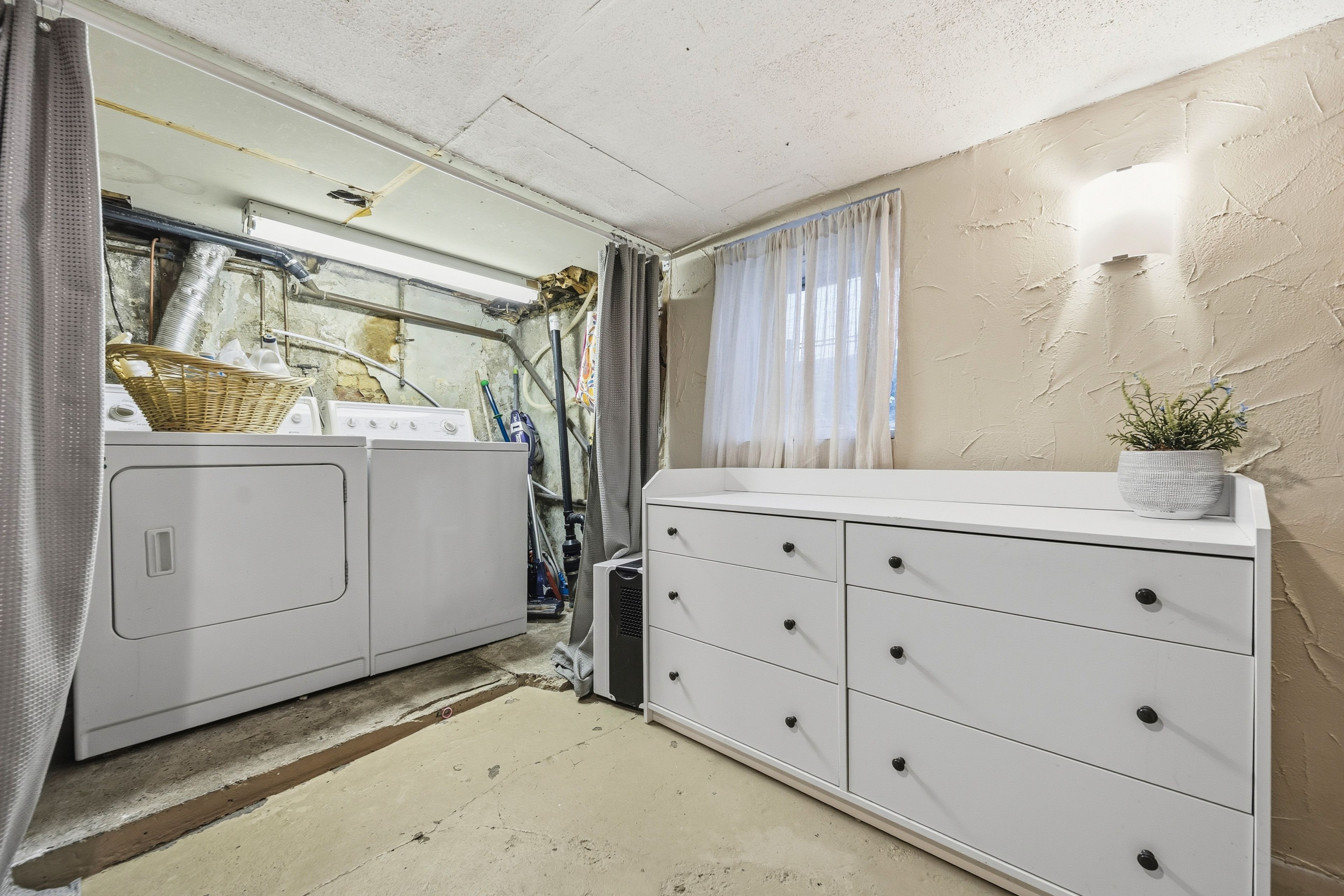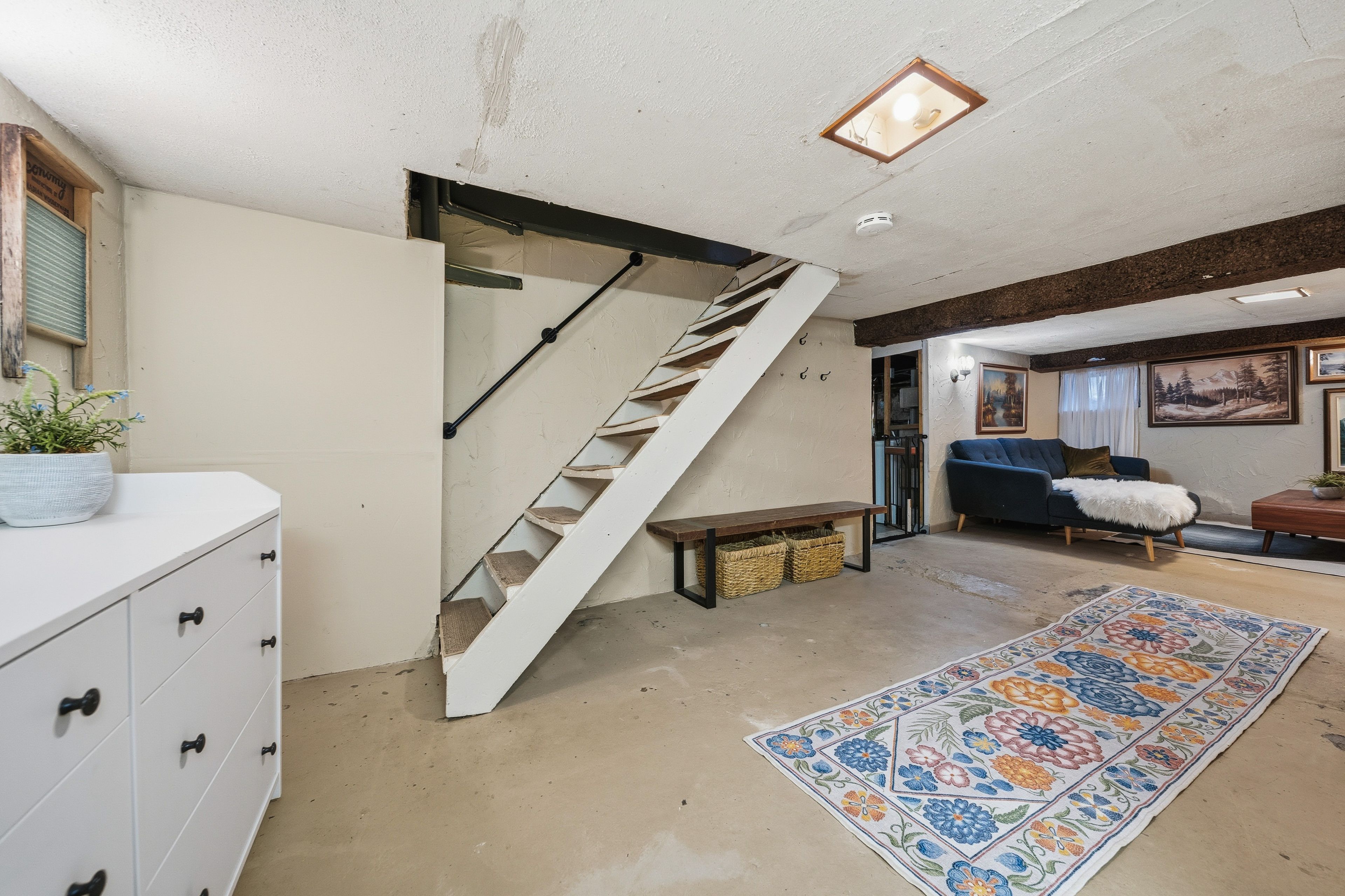 • Functional basement ideal for a TV room, gym, or storage.