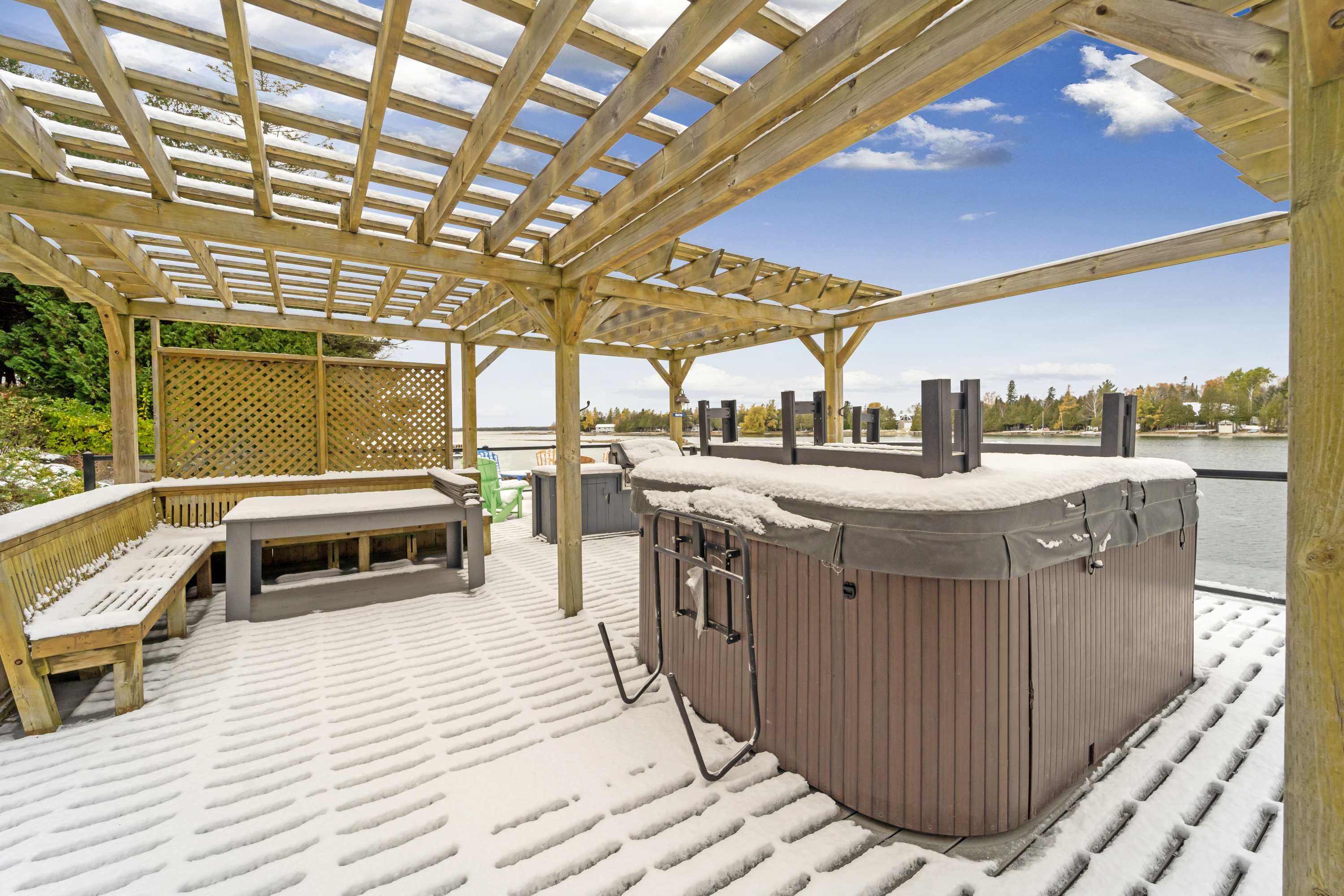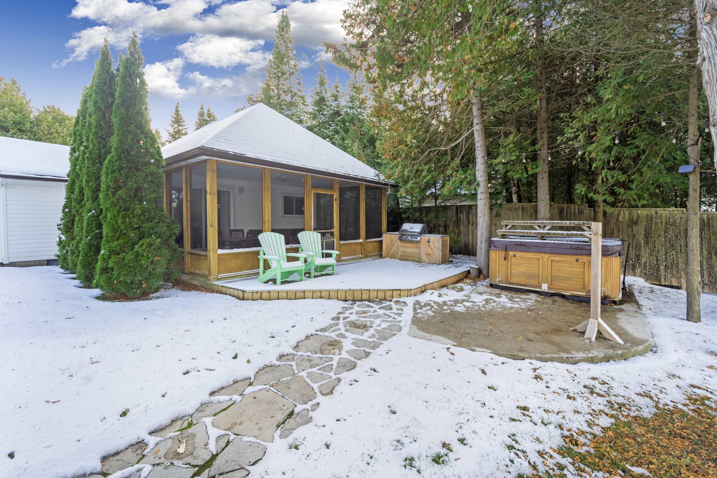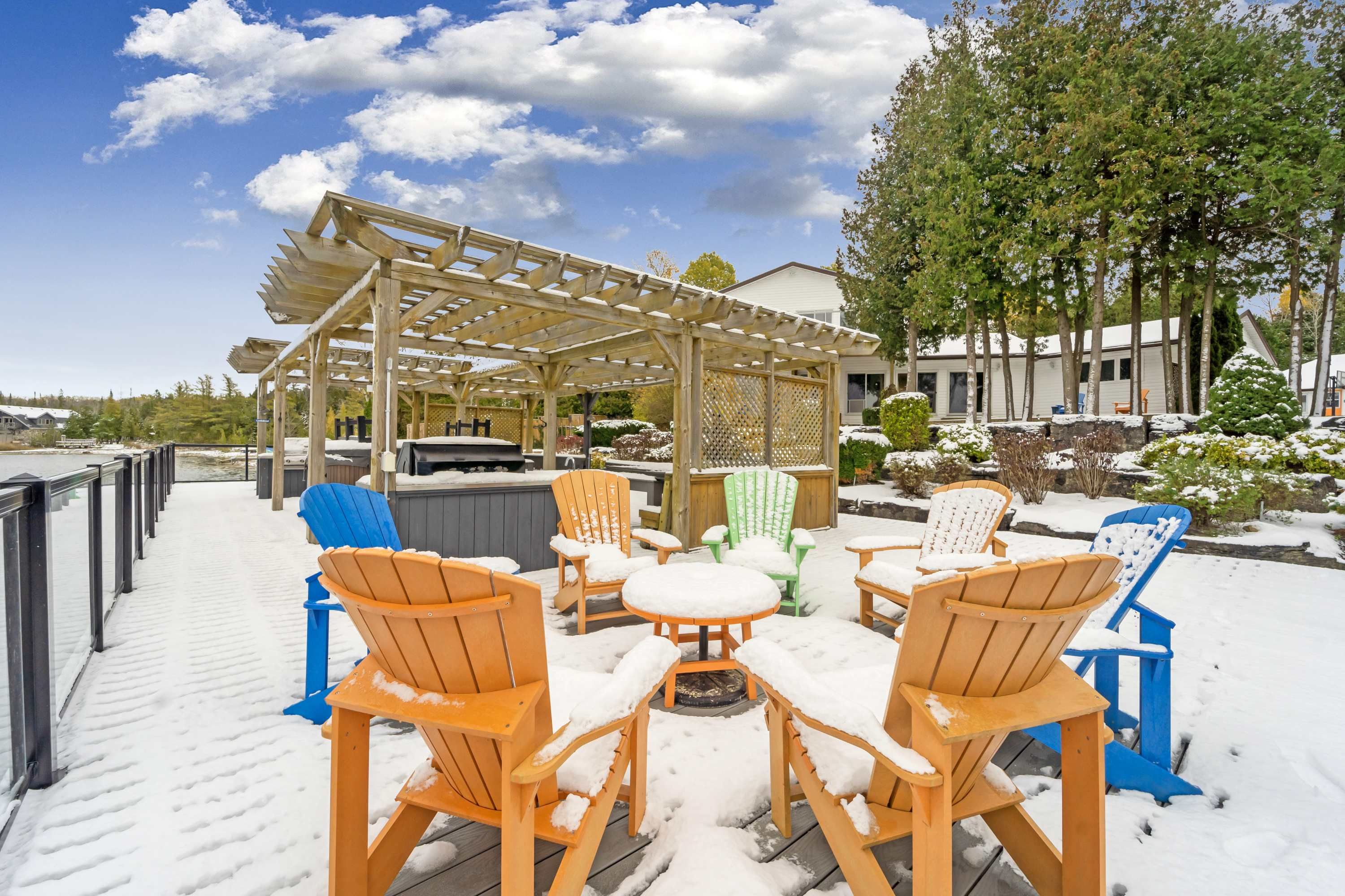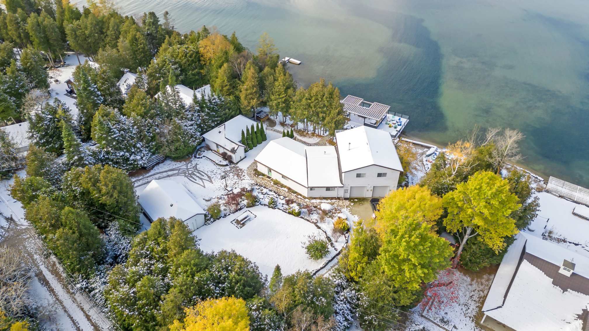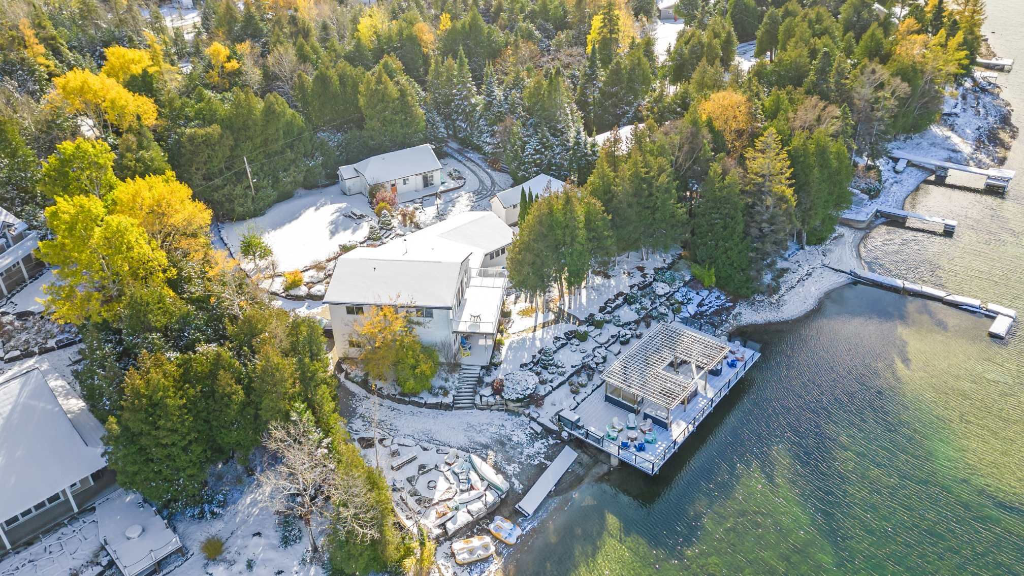 A rare and extraordinary waterfront estate offering an unparalleled standard of luxury, privacy, and resort-style living. The resort offers **four distinct and beautifully curated living spaces-huron,lookabout, cedars, and gardens-**each designed to provide privacy, comfort, and elevated style. The entire property is delivered fully furnished and completely turn-key, allowing for immediate enjoyment or seamless operational continuity. This impeccably curated retreat is fully furnished with bespoke, designer-selected pieces and outfitted with top-tier full-size appliances, hotel-quality linens, high-speed wi-fi, ipod docking stations, and satellite plasma televisions-delivering five-star comfort in every detail. The kitchens are masterfully designed, featuring elegant granite countertops, premium cappuccino makers, and refined finishes that blend sophistication with effortless functionality-perfect for both intimate mornings and grand entertaining. Outdoors, the property unfolds into a truly world-class waterfront experience. A stunning 2,400 sq. Ft. Dock anchors the estate, complete with a luxurious oversized hot tub, two professional-grade gas barbecues, and an expansive dining pavilion designed to host unforgettable gatherings on a grand scale. The waterside setting is ideal for private boat mooring, leisurely fishing, or serene swimming directly from the dock. Every element of the grounds has been intentionally designed to inspire relaxation and connection with nature-featuring classic adirondack seating, elegant hammocks, private kayaks, and a statement fire pit that sets the stage for magical evenings under the stars. This is a truly spectacular waterfront estate-ideally suited to continue a highly desirable cottage rental business or to be enjoyed as an extraordinary multi-generational family vacation compound. Whether envisioned as a luxury income-producing asset or a private recreational sanctuary, the property offers remarkable flexibility and long term value