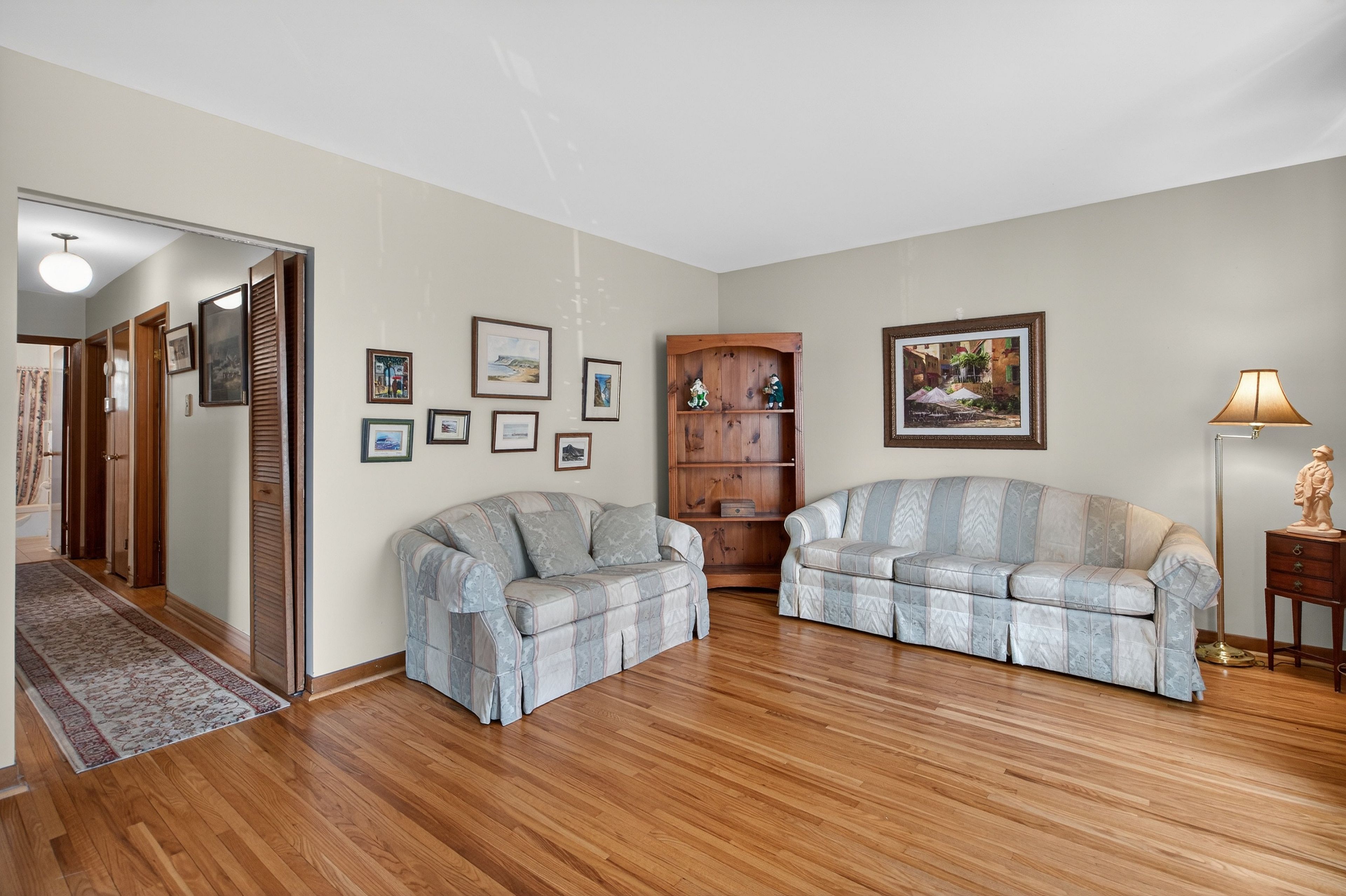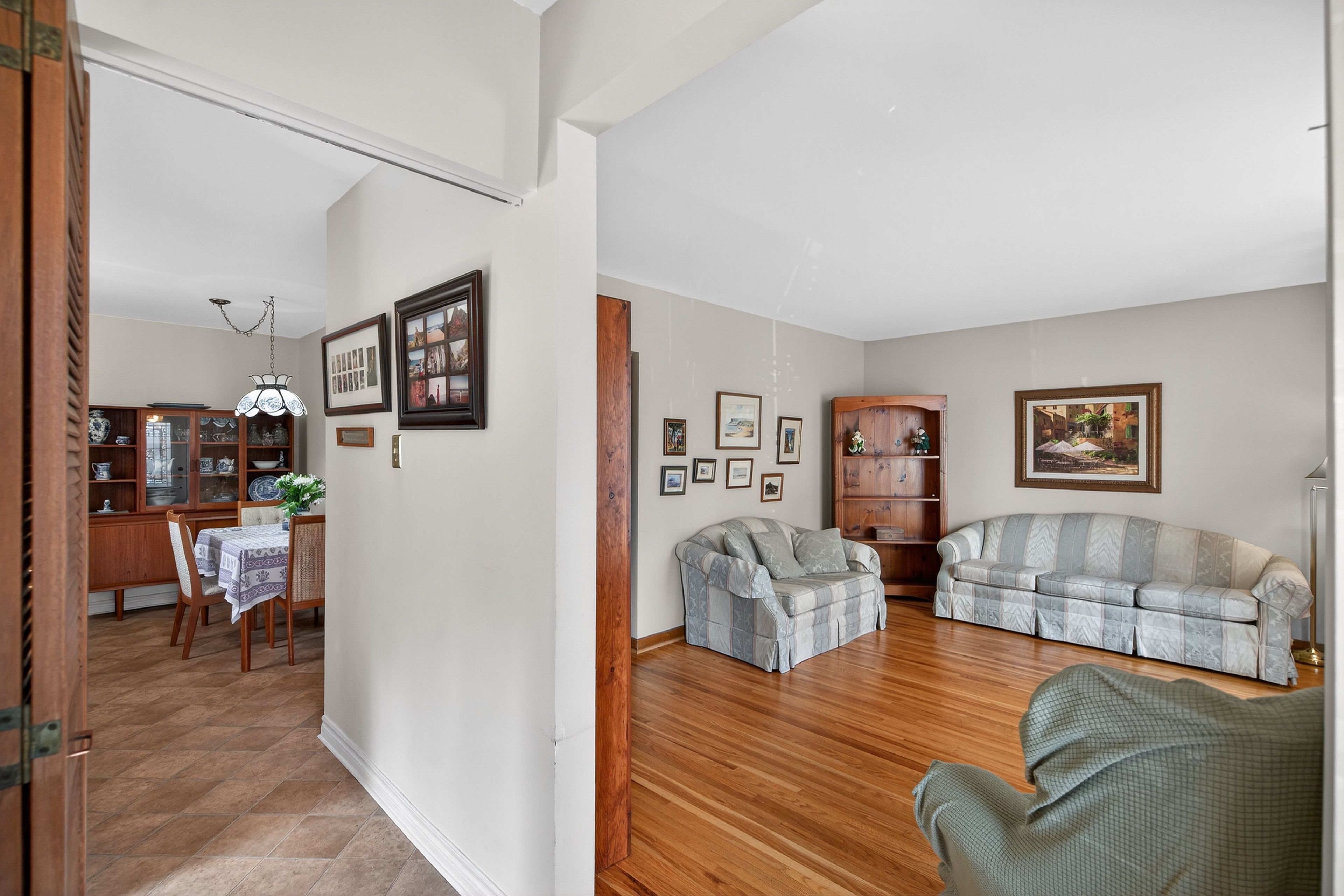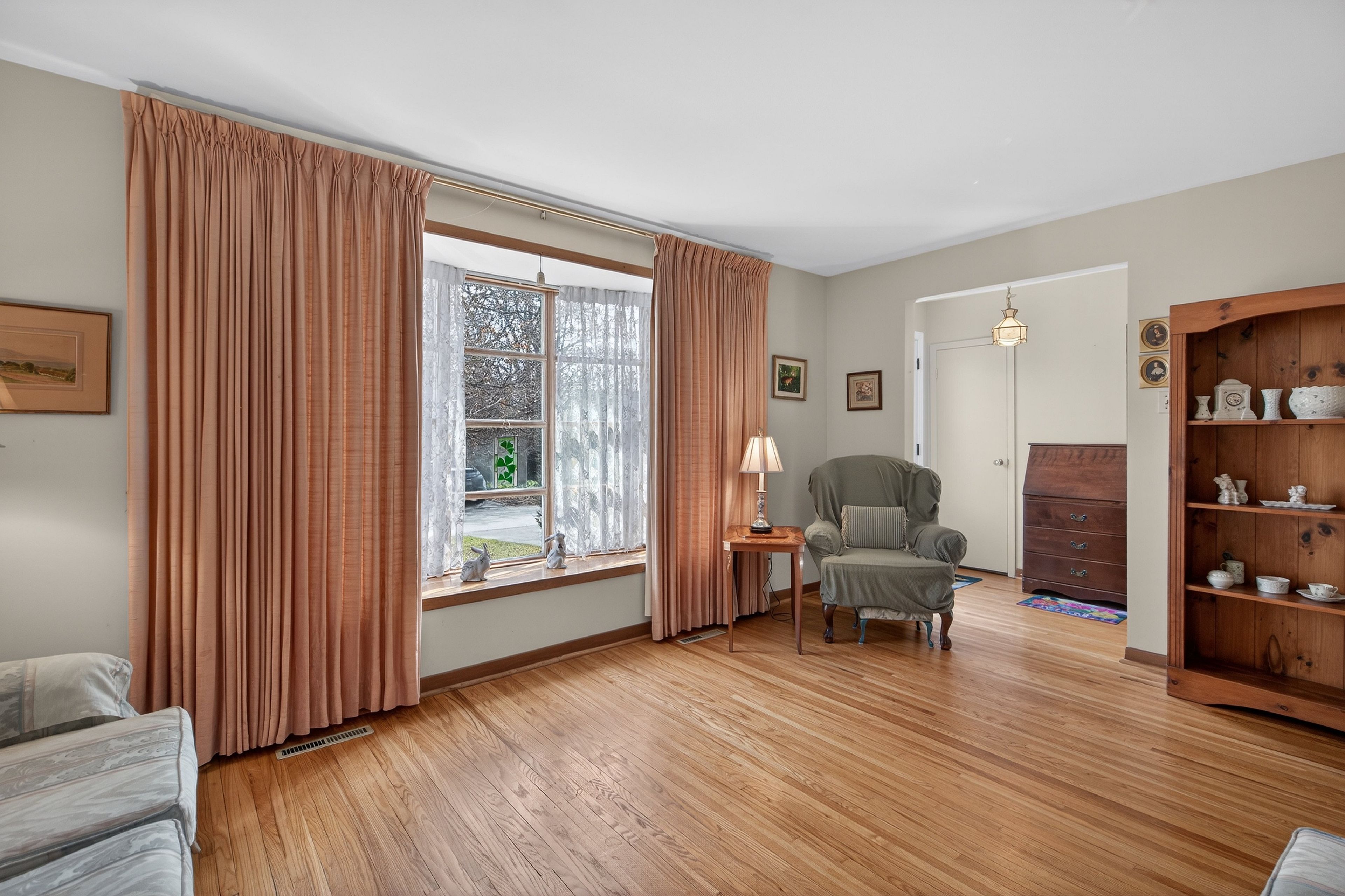 • Bright living room with natural light and hardwood flooring throughout.