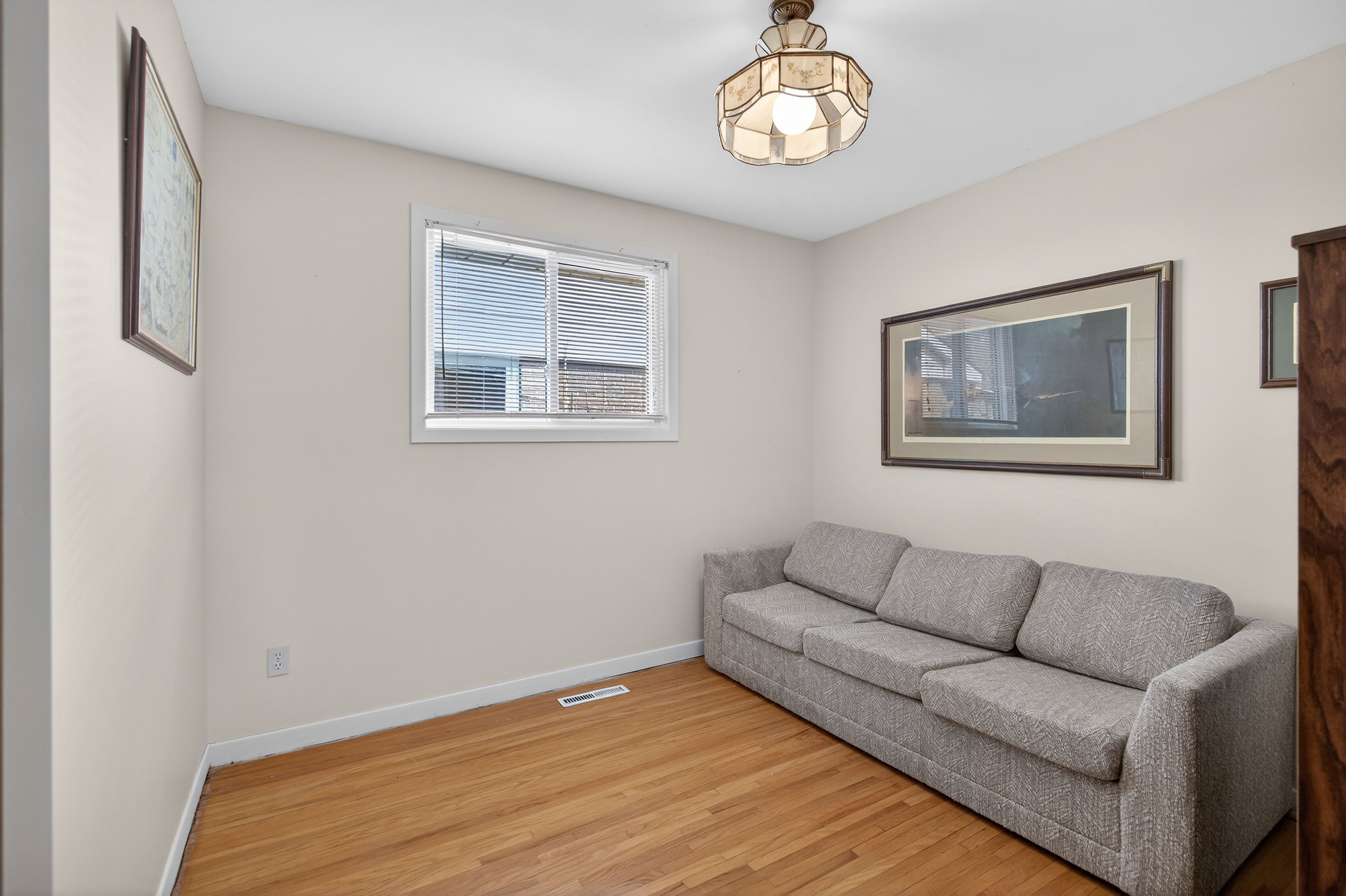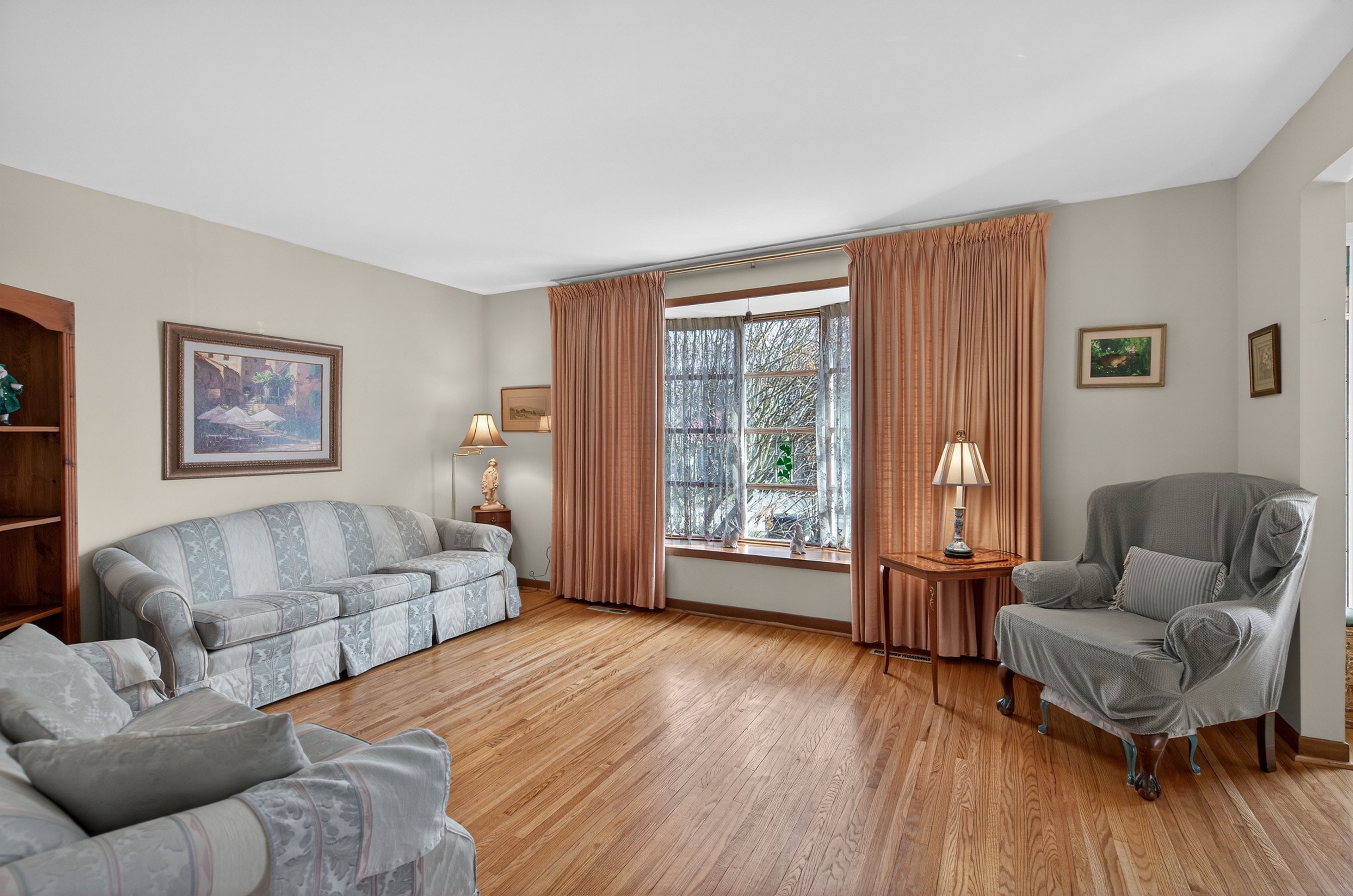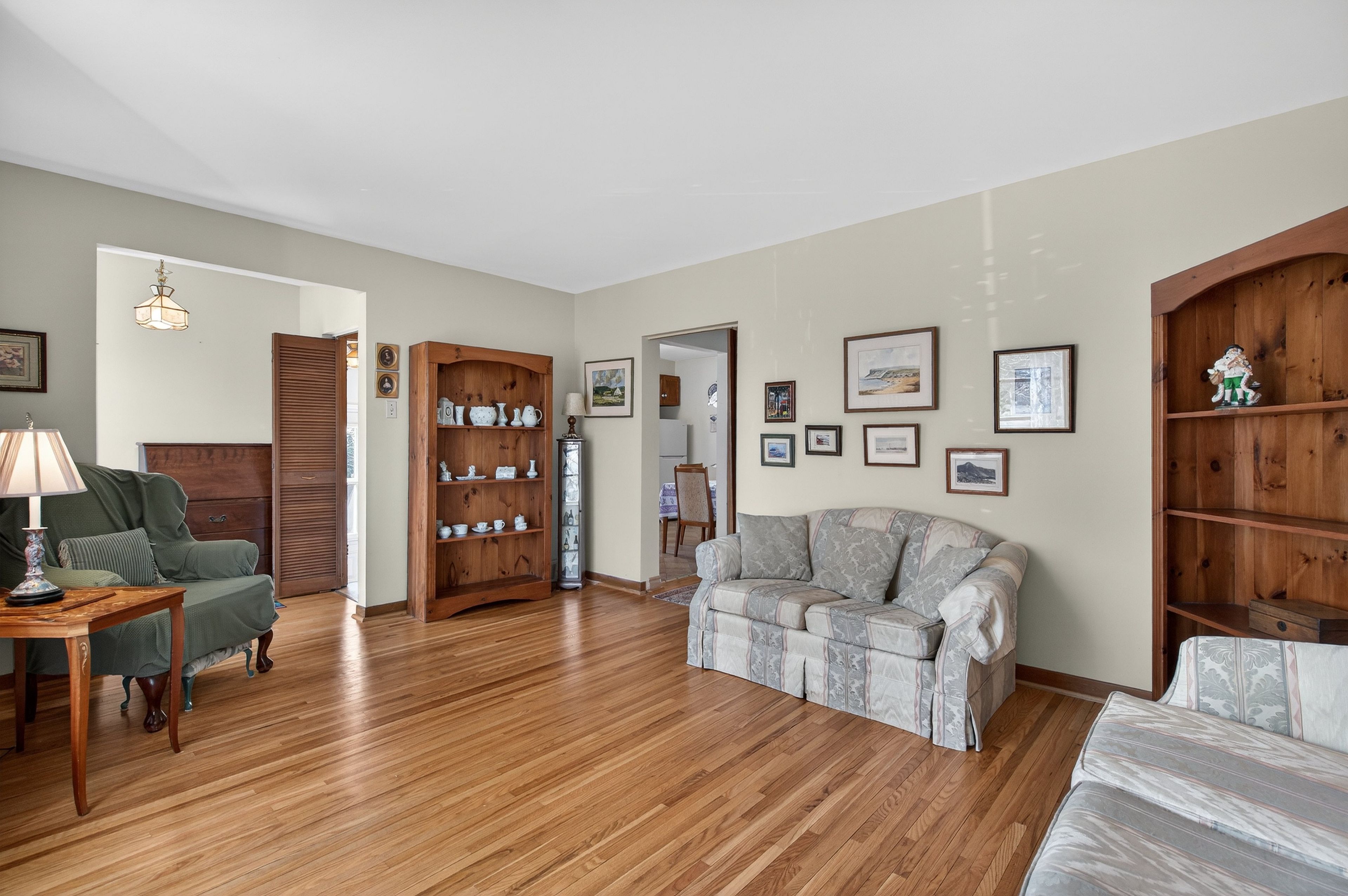 • Bright living room with natural light and hardwood flooring throughout.